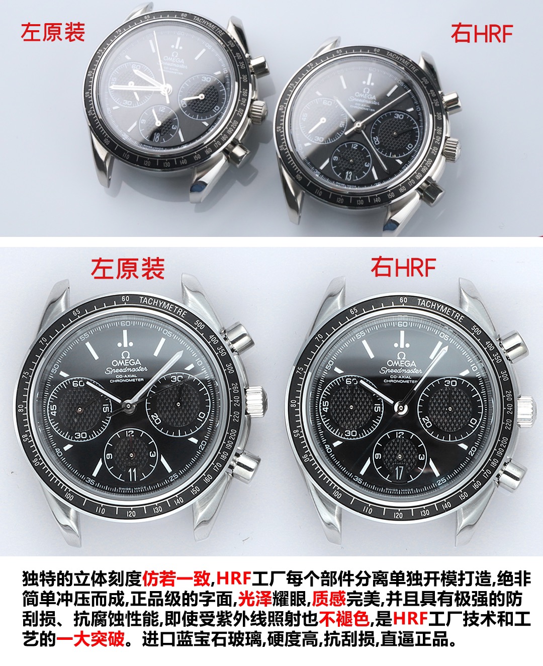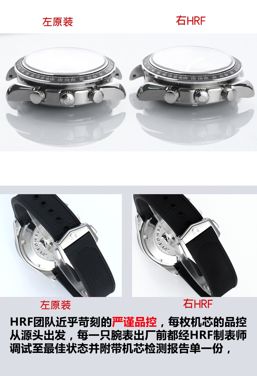 『Pushing Boundaries, Dominating the Scene』HR Factory Welcomes a New Contender—OMEGA Speedmaster 326.32.40.50.06.001 Multi-Function Chronograph.Crafted through deep collaboration between the HR team and the authentic manufacturer, this exclusive replica features a genuine disassembly and reverse engineering process. Sparing no expense or time, the development and molding took a full year to achieve perfect compatibility and interchangeability with all genuine parts. Matching the boutique size of 40mm, it incorporates the authentic Swiss-made Cal.3330 chronograph movement with identical construction. meticulously refined and polished by our expert team for enhanced stability and durability, creating an Omega Speedmaster replica of original factory quality. 【Appearance】Acquired through genuine disassembly and reverse engineering, featuring identical stepped case construction, matching CNC polishing grade, consistent thickness dimensions, and full compatibility of all components—including lug screws—with the authentic model.【Dial】Features the authentic grain texture with sunray finish, employing the same micro-bead blasted surface as the genuine piece. The overall density of the grains matches the genuine article, reflecting light identically from any angle. Each numeral index, logo, and material is independently molded using authentic manufacturing techniques and materials, achieving three-dimensional aesthetics identical to the original after multiple mold iterations.【Crystal】Double-sided blue-coated curved sapphire crystal with beveled edges and polished edges. Thickness and curvature meet stringent 0.03mm tolerance standards. Scratch-resistant, wear-resistant, and crystal-clear.【Water Resistance】The screw-down crown undergoes repeated testing to ensure identical 100-meter water resistance as the genuine article. 【Strap】The rubber strap adheres to strict standards from raw material selection. Every detail undergoes repeated polishing to achieve premium quality. Soft and smooth, it conforms comfortably to the wrist. Every stitch and detail, including serial numbers, matches the genuine article.【Buckle】The brushed finish on the buckle features fine, uniform lines with depth identical to the genuine article. Not only is the density and fineness of the brushing consistent, but the depth of the finish is also precisely replicated. The buckle’s depth is faithfully reproduced, eliminating the awkward issue of loosening over time. Even after prolonged use, the buckle remains perfectly aligned, with the crisp clicking sound upon fastening meticulously recreated. 【Movement】 Based on the authentic Cal.3330 chronograph movement, our team meticulously refined and polished the genuine Cal.3330 base. This enhances movement stability, overcoming the longstanding issue of chronograph models being merely superficial.【Quality Control】 HRF’s team maintains near-obsessive quality control standards. Each movement undergoes rigorous inspection from the source. Every watch is meticulously adjusted to peak performance by HRF watchmakers before leaving the factory. Each piece is then left to rest for 24 hours to ensure flawless operation before final shipment. HRF remains steadfast in its commitment to perfection! We will continue crafting replica watches of original-order quality for watch enthusiasts worldwide.