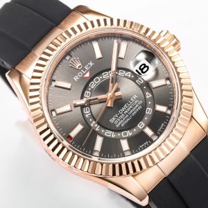 【Factory2022 Masterpiece】Rolex Sky-Dweller! Stunning Details: 【Case】42mm diameter, steadfast and reliable, exuding elegance! Bezel features Rolex Ring Command triangular grooves, rotating outer ring adjusts month function! Scratch-resistant sapphire crystal, anti-reflective convex magnified date window. 【Bracelet】Oystersteel!Triple-link bracelet with Oysterlock clasp and 5mm Easylink extension system. 【Dial】Sunburst finish with red dot month indicator at 12 o’clock. 【Movement】Powered by the automatic mechanical 9001 caliber. 【Functions】Date display / Month display / Annual calendar / Dual time zone! Factory’s Masterpiece—Deserves a place in your collection!