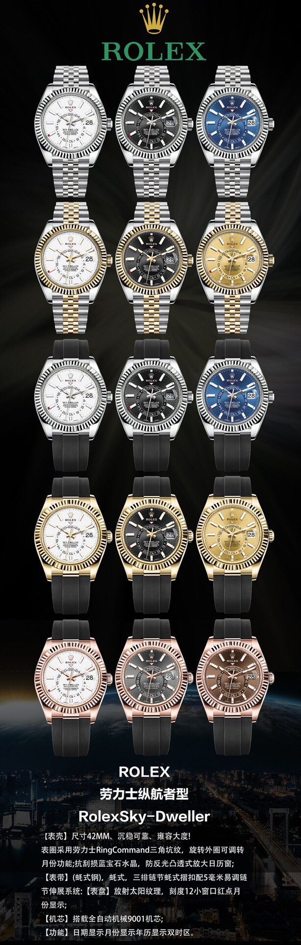 【Factory2022 Masterpiece】Rolex Sky-Dweller! Stunning Details: 【Case】42mm diameter, steadfast and reliable, exuding elegance! Bezel features Rolex Ring Command triangular grooves, with rotating outer ring for month adjustment! Scratch-resistant sapphire crystal, anti-reflective convex magnified date window. 【Bracelet】Oystersteel!Triple-link bracelet with Oysterlock clasp and 5mm Easylink extension system. 【Dial】Sunray-brushed finish with red dot month indicator at 12 o’clock. 【Movement】Powered by the automatic mechanical 9001 caliber. 【Functions】Date display / Month display / Annual calendar / Dual time zone! Factory’s Masterpiece—Deserves a place in your collection!