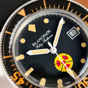 1⃣️ Hailed by watch enthusiasts as the pinnacle of aesthetics within Blancpain! The dial features a black base with hour markers layered in aged red and beige hues. The domed sapphire crystal and rotating bezel shimmer like jade in sunlight.