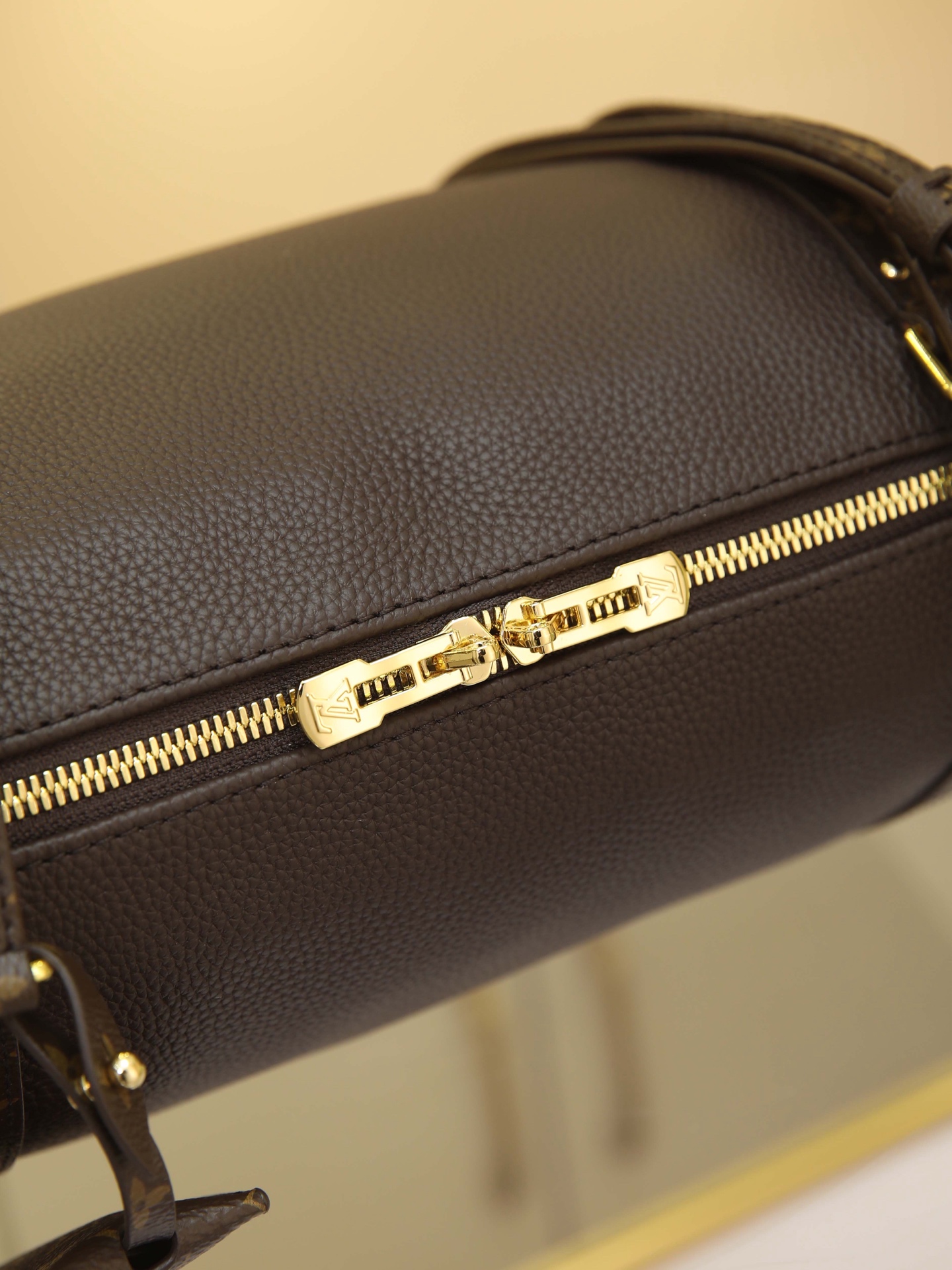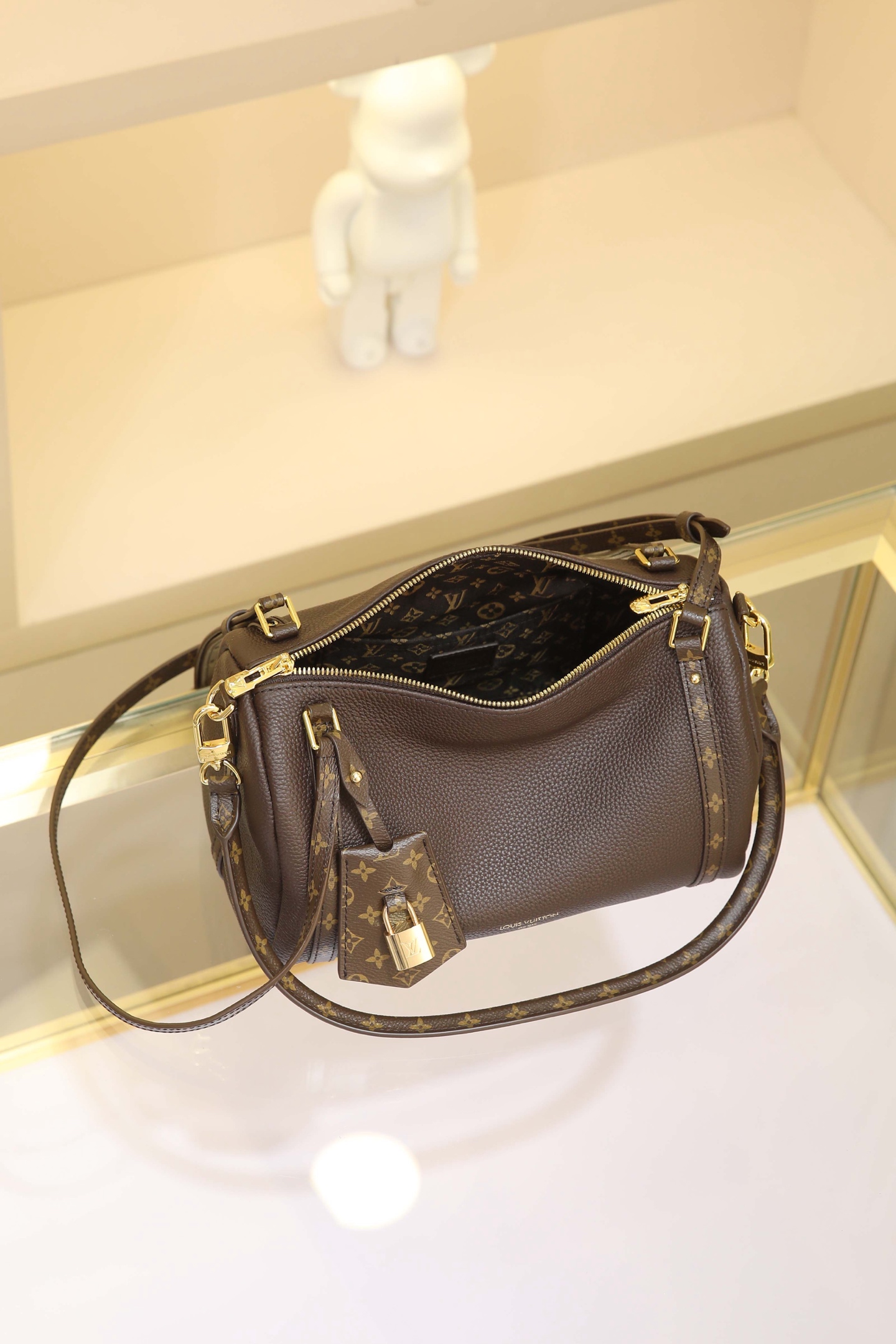 17 x 13.5 x 26 cm (H x W x L) Cowhide-coated canvas trim Cotton lining Metal hardware Dual zipper closure Removable key pouch and detachable padlock (attaches to zipper pull) Shoulder strap:Removable, adjustable Strap half-length: 41.0 cm Adjustable to: 47.0 cm Handles: Dual handles