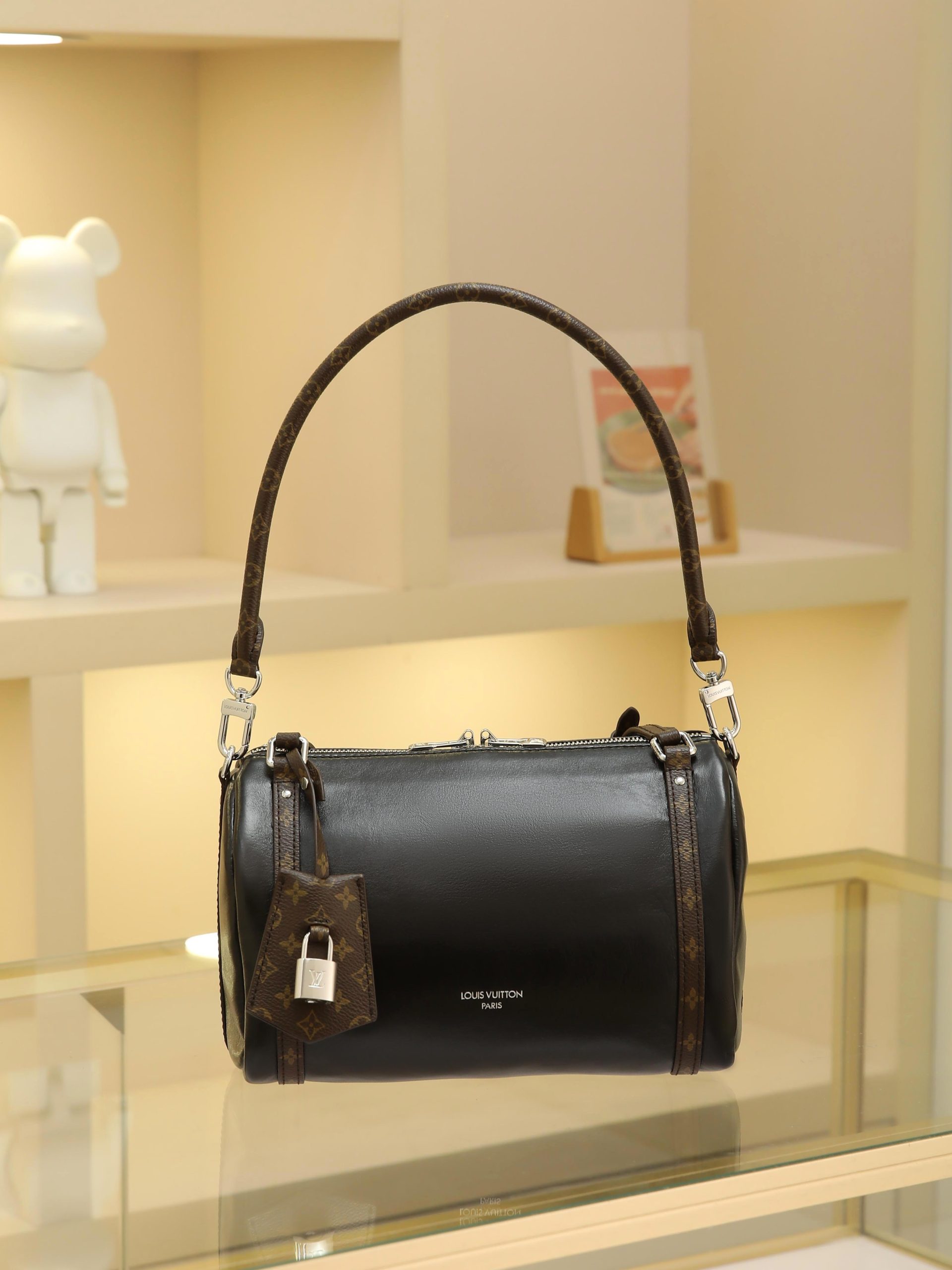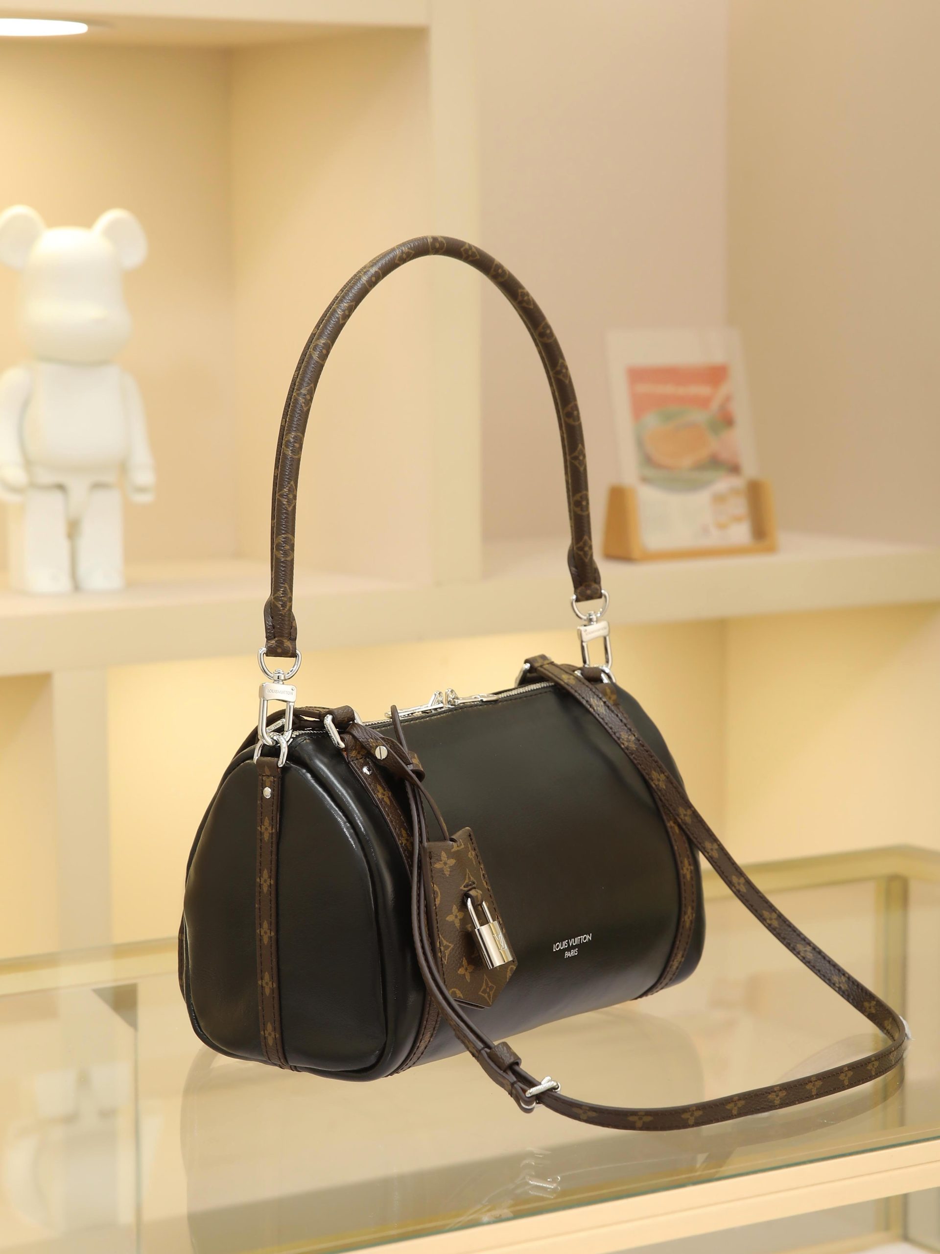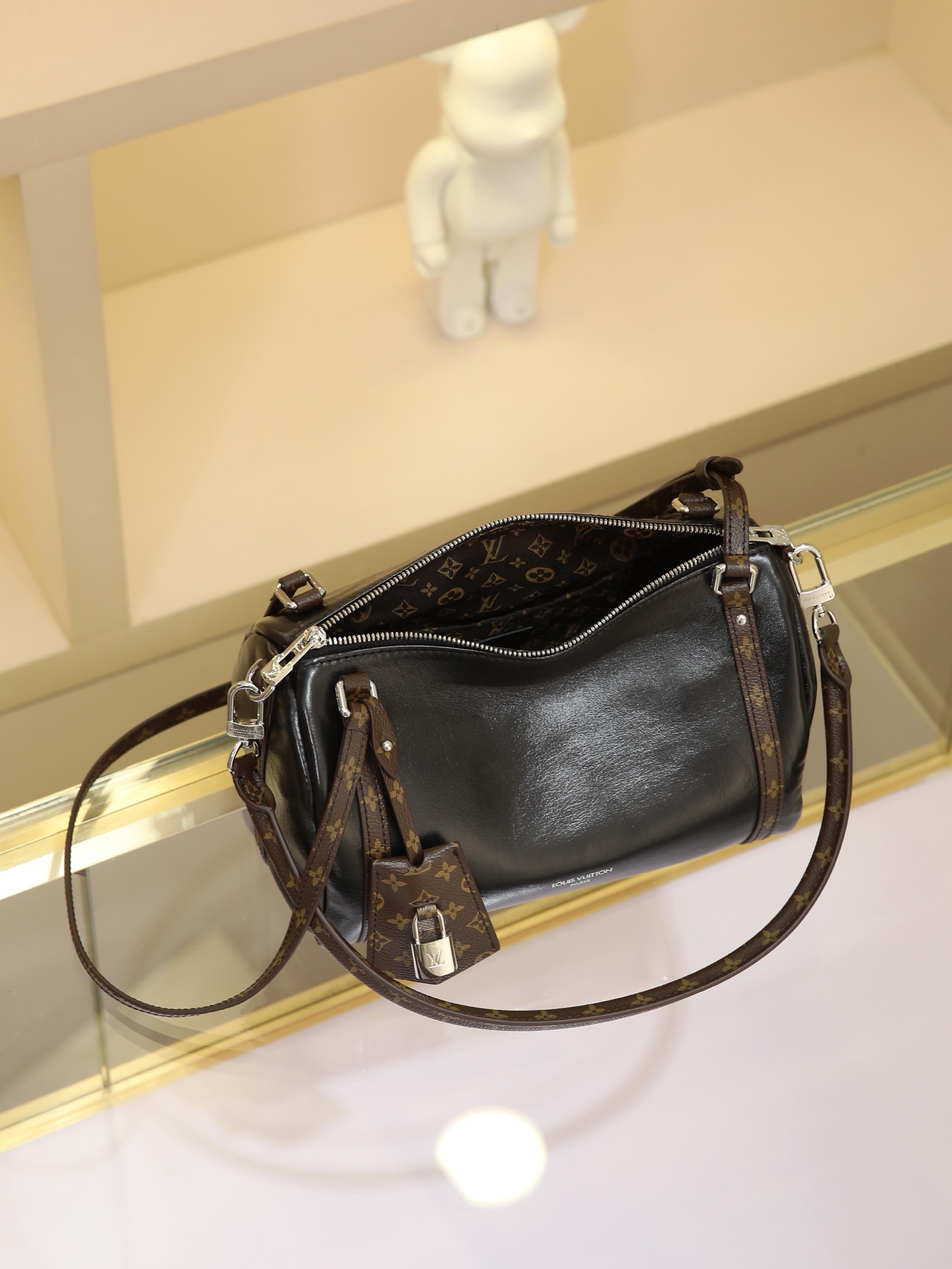 17 x 13.5 x 26 cm (H x W x L) Cowhide-coated canvas trim Cotton lining Metal hardware Dual zipper closure Removable key pouch and detachable padlock (attaches to zipper pull) Shoulder strap:Removable, adjustable Strap half-length: 41.0 cm Adjustable to: 47.0 cm Handles: Dual handles