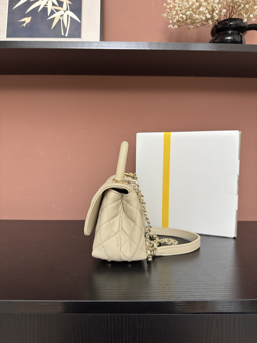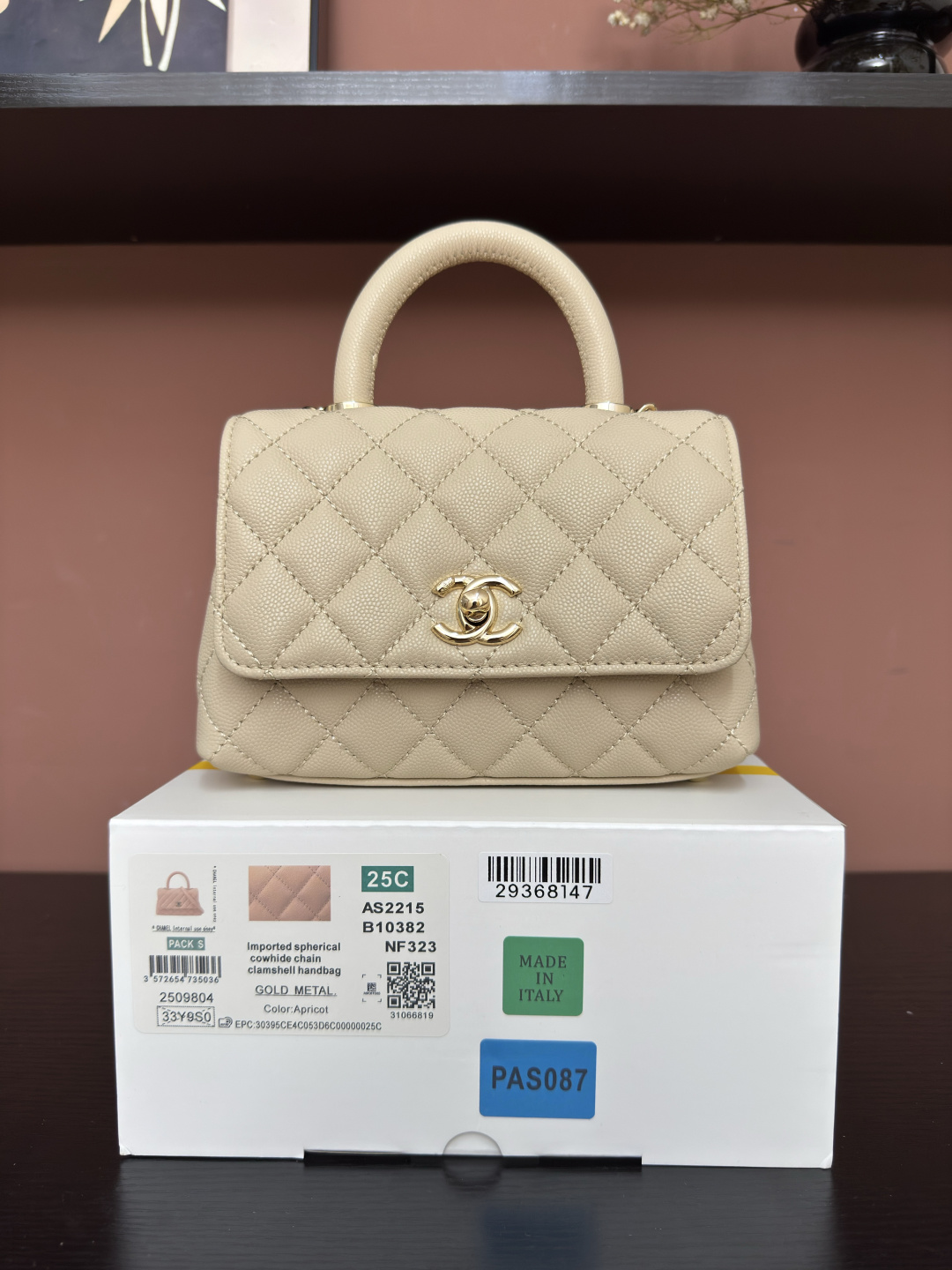 750AS2215# Apricot-hued ball-patterned edging with light gold accents ๐ Exclusive Background ๐ Authentic product photos, premium quality goods ๐ Timelessly popular handbags that never go out of style๏ฝ Coco handle flap top handbag ๐ Dimensions: 19*14*9cm