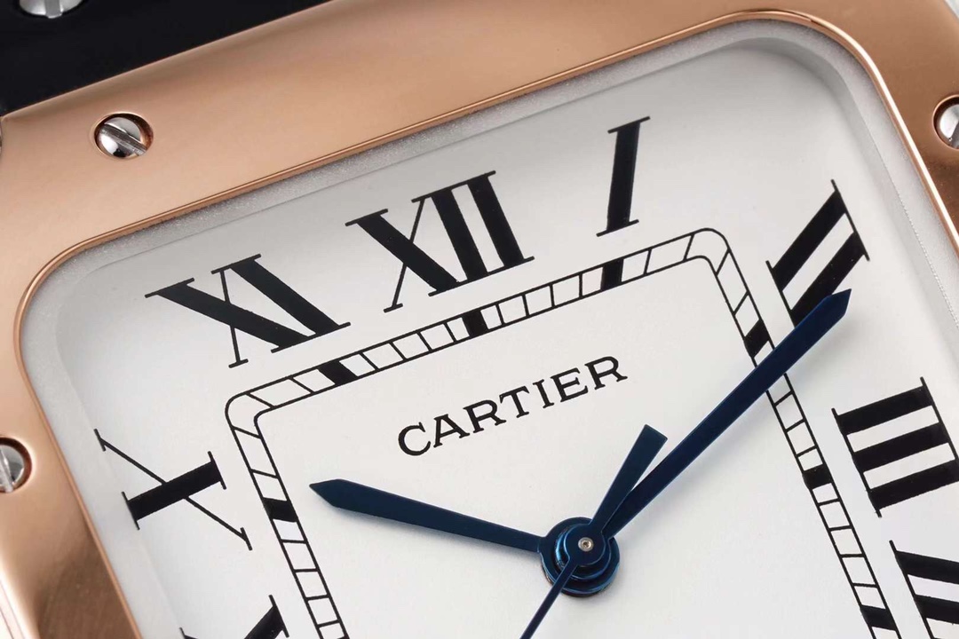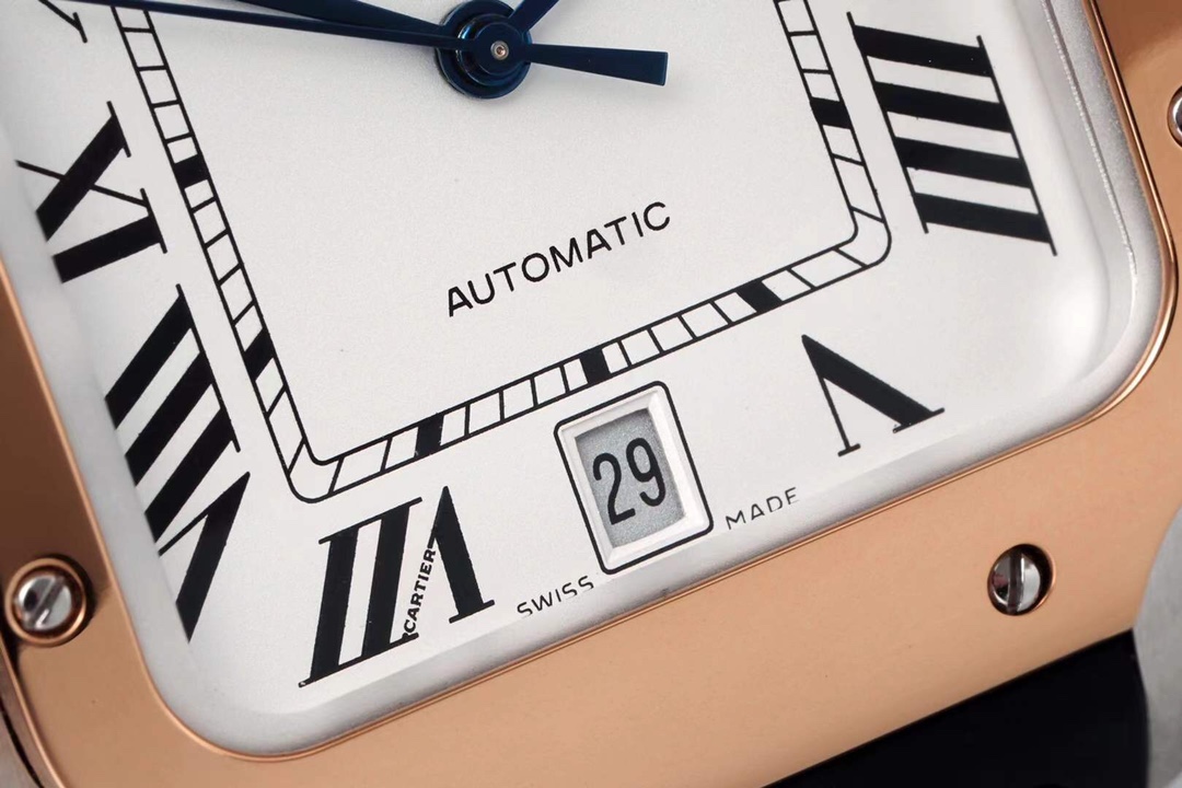 AF Cartier Santos Mechanical Large Series Movement: 9015 Automatic Mechanical Case Dimensions: 39.8 x 47.5 mm Dial:Sunburst white dial, sword-shaped blued steel hands, Roman numeral hour markers. Crystal: Scratch-resistant sapphire crystal. Crown: Stainless steel set with a faceted synthetic spinel. Case: Rose gold with diamonds, yellow gold with diamonds, stainless steel with diamonds.Strap: Stainless steel bracelet, silicone strap, quick-release leather strap, alligator leather strap. Functions: Time display, date display.