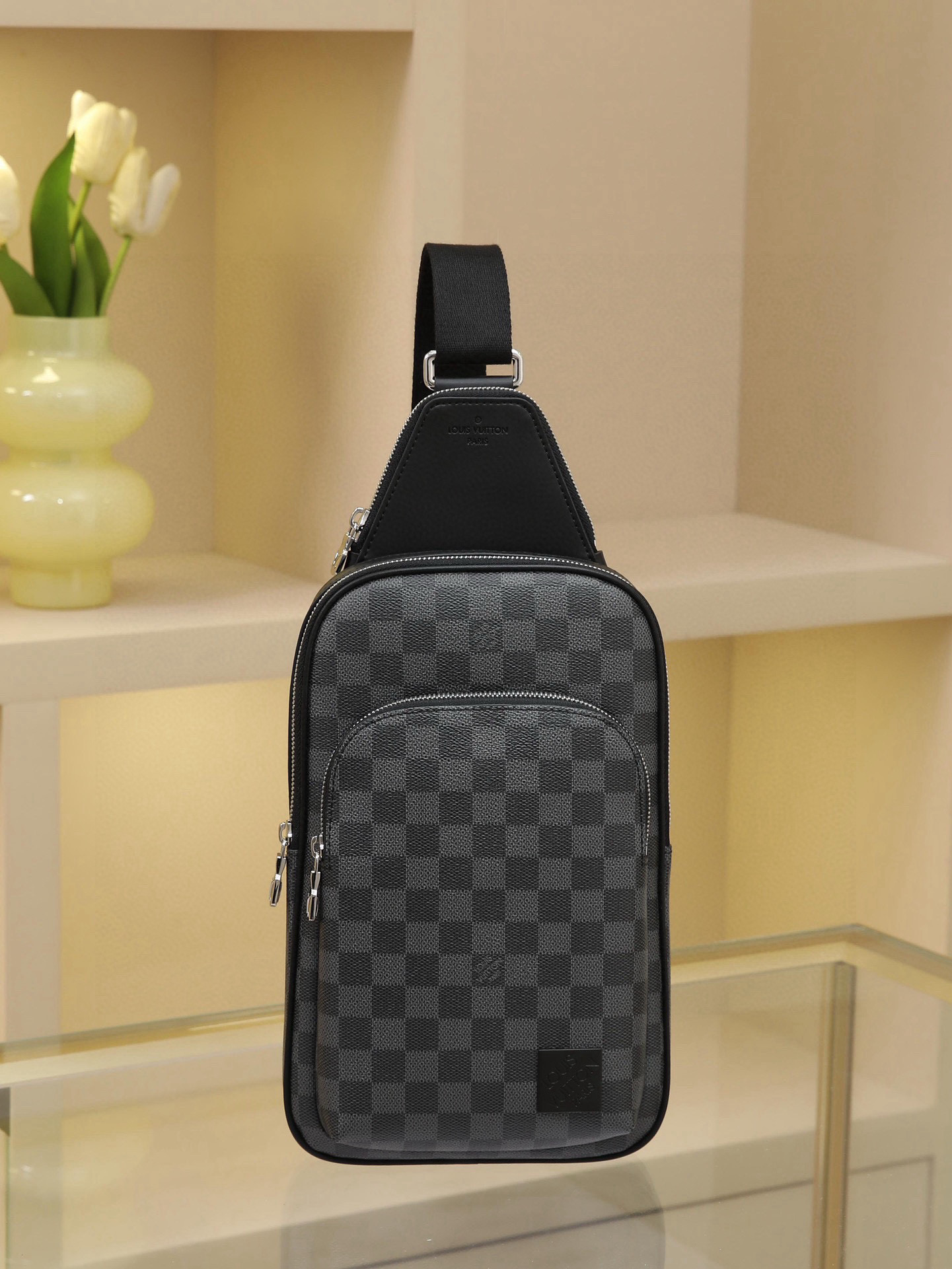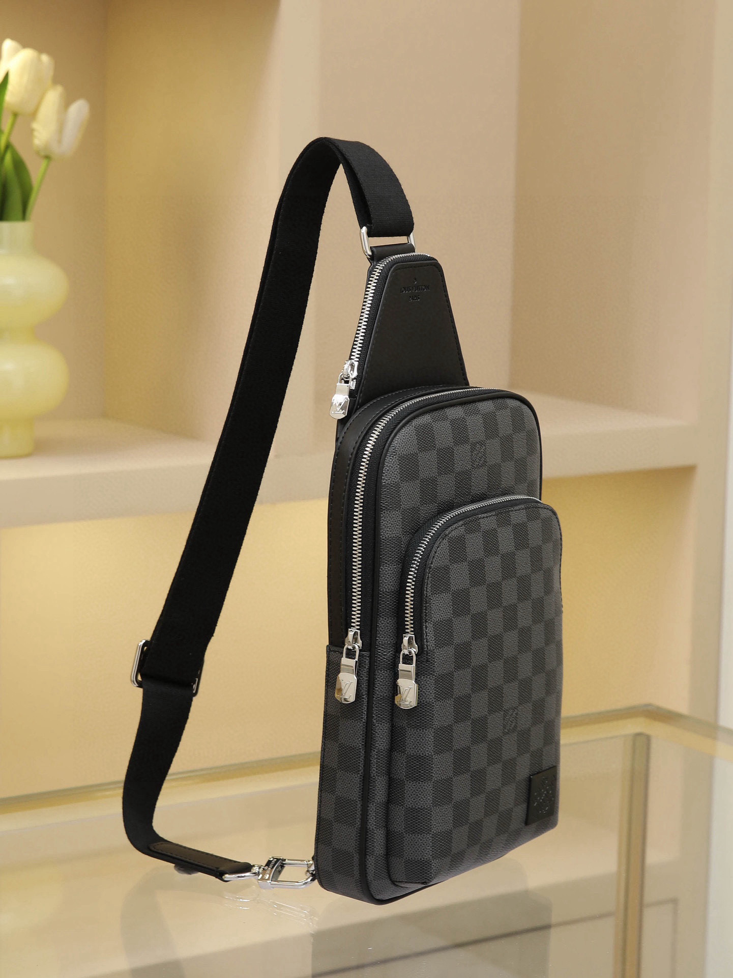 All-Steel Hardware Crafted from Damier Graphite canvas, this Avenue shoulder bag features a Louis Vuitton Paris leather patch adorning the front exterior pocket. The adjustable nylon shoulder strap attaches to either side via D-rings, while the canvas strap and lining uphold sustainable principles.Damier Graphite coated canvas Cowhide leather trim Fabric lining Square metal hardware on front Main compartment Zippered front pocket Small zippered top pocket Non-removable, adjustable shoulder strap! Dimensions: 20x31x7cm