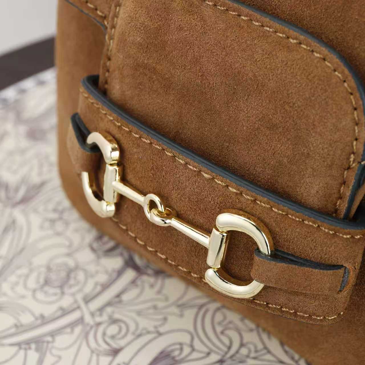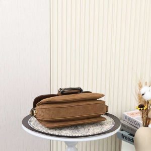 Batch 320….2025 Fall/Winter Collection. This shoulder bag reinterprets the brand’s equestrian-inspired design, featuring light gold-tone details and suede material, complemented by double rings and elongated hardware, adding another chapter to the Gucci Horsebit 1955 series.Brown suede Gold-tone hardware Brown leather lining Horsebit interior One open pocket Three-compartment design Adjustable shoulder strap Height: 28 cm – 50 cmLength: 71 cm – 114 cm Model: 847064 Dimensions: 19.5 cm (W) x 15 cm (H) x 9 cm (D) Color: Brown suede/natural leather.