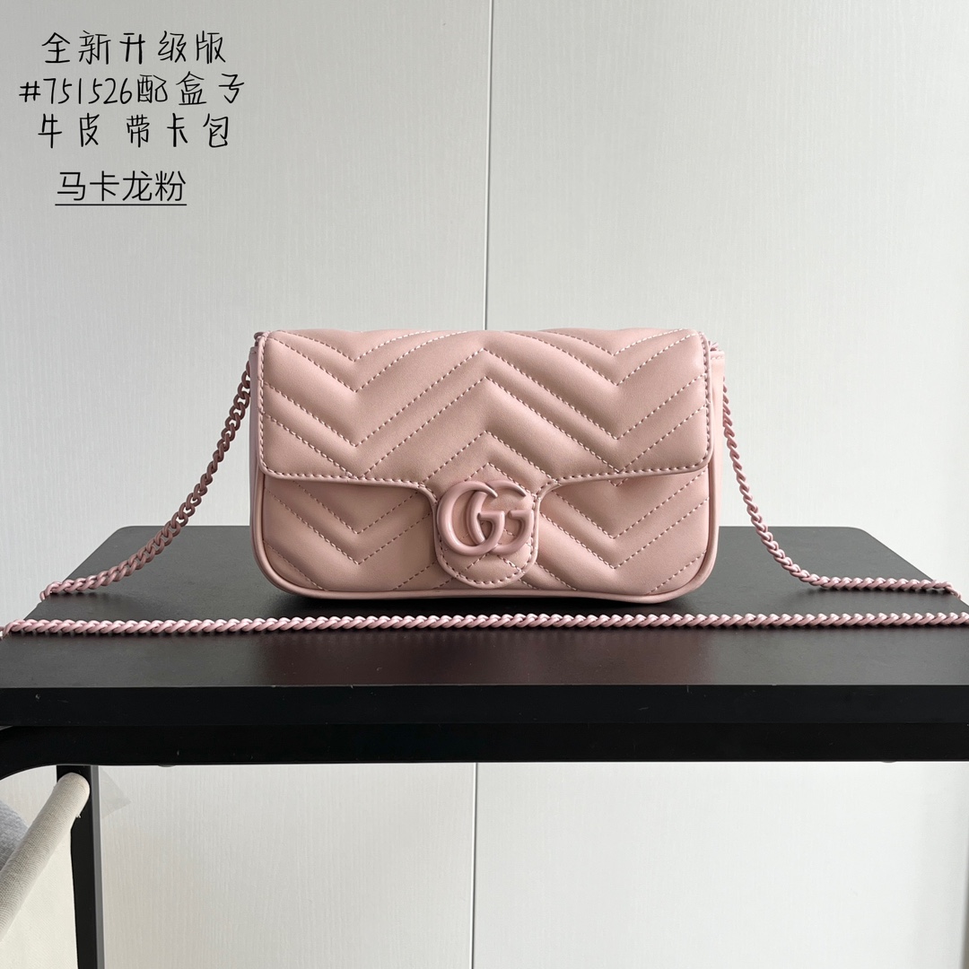 Batch 320… Style No.: 751526 Full cowhide leather Dimensions: 21/12/5 cm GG Marmont Chain Mini Bag with card holder, designed to attach this bag to a larger handbag. Features a structured yet supple silhouette with a flap closure and GG metal hardware.Metal hardware draws inspiration from iconic 70s designs. Crafted in quilted human-shaped pattern genuine leather.