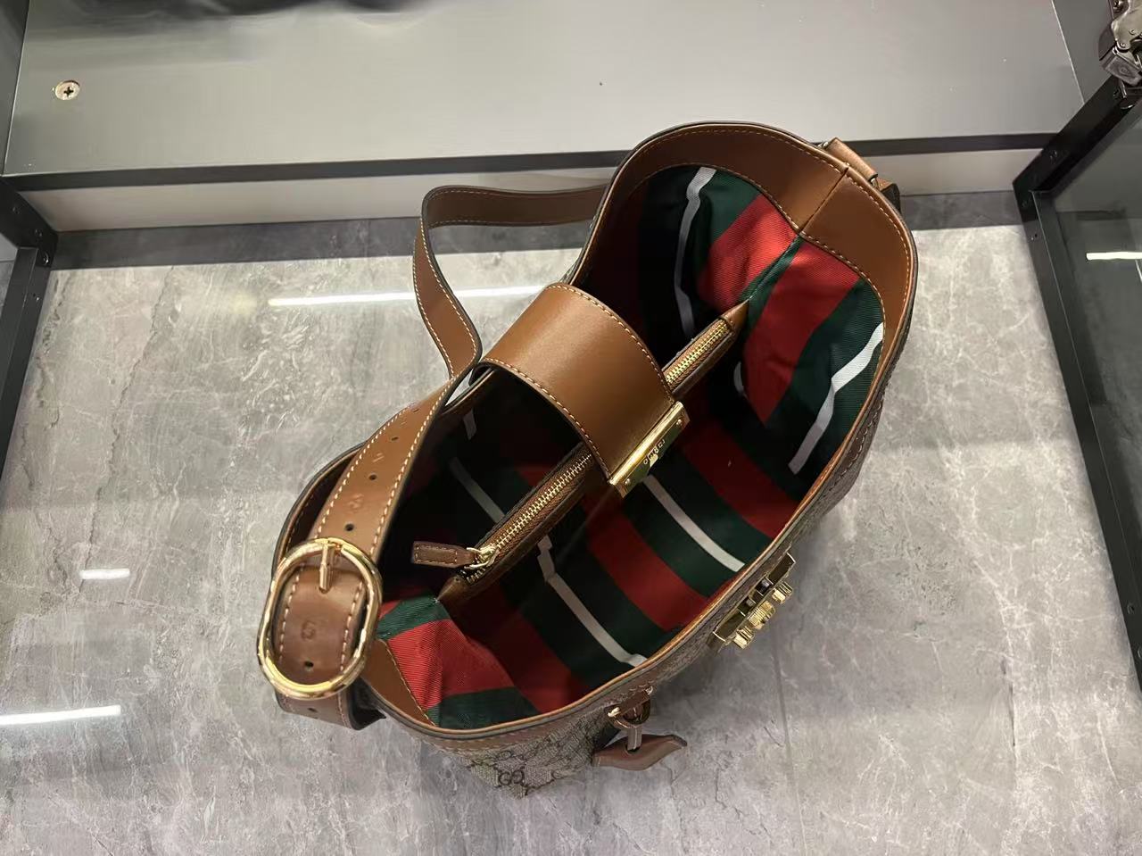 Batch 320… The GG Padlock collection introduces a range of stylish bags with versatile carrying options, enhancing the 2025 Pre-Fall lineup. This shoulder bag features a central compartment with a zippered pocket and a webbing lining reminiscent of the brand’s iconic pattern.Beige and dark brown GG monogram coated fabric with brown leather trim, light gold-tone hardware, red and green woven cotton lining, padlock-style closure with leather keyring. Model: 839021. Dimensions: 29x 23.5x 15.5