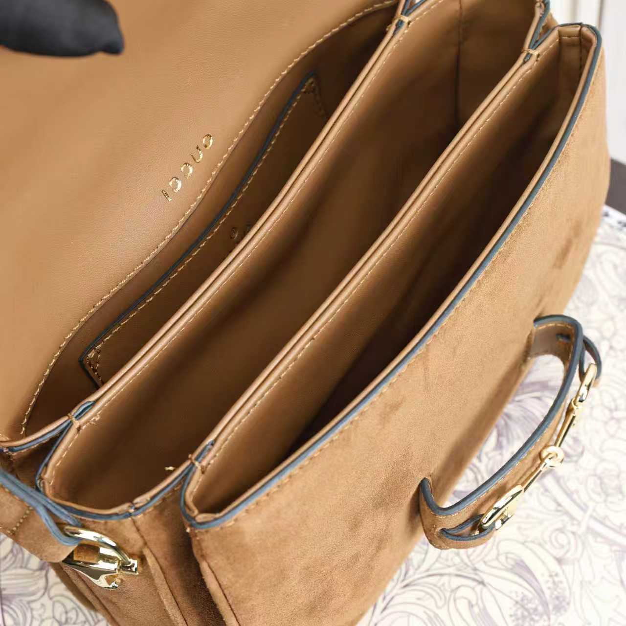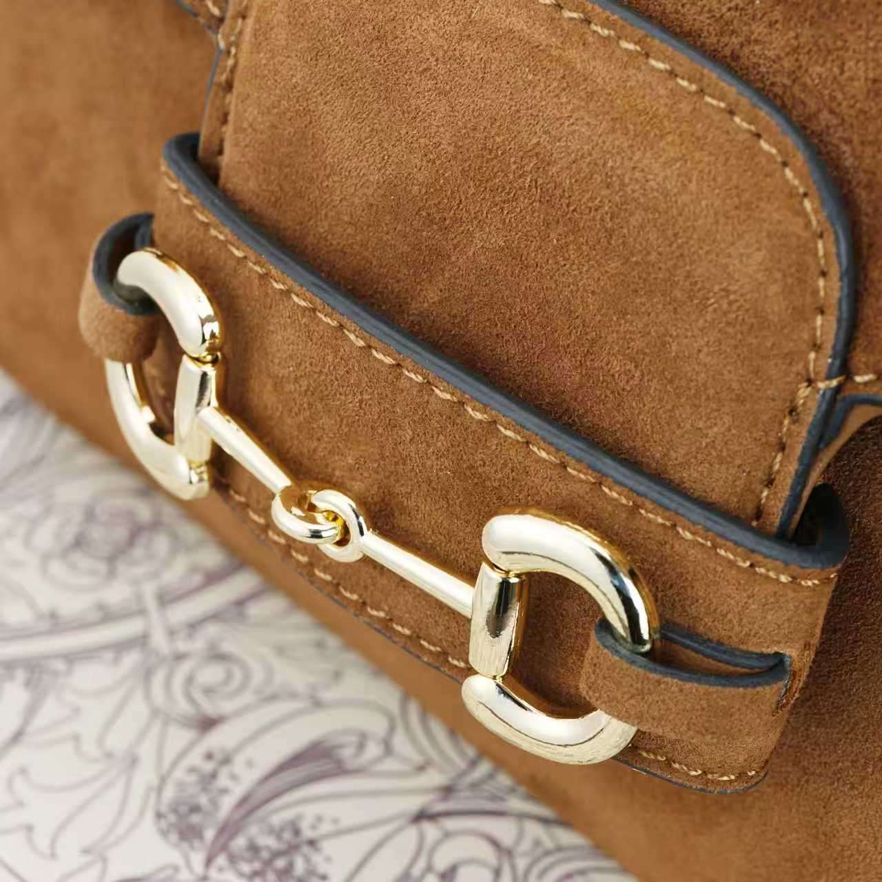 Batch 340… Fall/Winter 2025 Collection. This shoulder bag reinterprets the brand’s equestrian-inspired design, featuring light gold-tone details and suede material, complemented by double rings and elongated hardware, adding to the Gucci Horsebit 1955 series.Brown suede with gold-tone hardware. Brown leather lining. Horsebit clasp. Interior: One open pocket. Three-compartment design. Adjustable shoulder strap. Height: 28 cm – 50 cm; Length: 71 cm – 114 cm. Model: 847063.Dimensions: 26 cm (width) x 17.5 cm (height) x 10 cm (depth) Weight: Approx. 0.85 kg Color: Brown suede/natural leather.