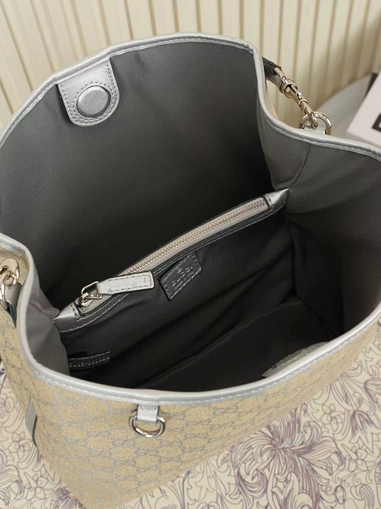 Batch 340… The all-new GG Emblem collection reinterprets the brand’s timeless elegance and masterful craftsmanship. This compact shoulder bag embodies practical design aesthetics, featuring two main compartments and a central zippered pocket, with an accompanying leather shoulder strap for crossbody wear.Light beige and silver GG monogram coated fabric with silver leather piping and contrasting stitching. Interior: 2 main compartments and 1 central zippered pocket. Handle height: 18 cm. Leather shoulder strap (height 54–60 cm; length 105–115 cm). Weight: approx. 700 g. Model: 815103.Dimensions: 25 cm (W) x 25 cm (H) x 15.5 cm (D) Color: Apricot Silver/Genuine Leather Made in Italy