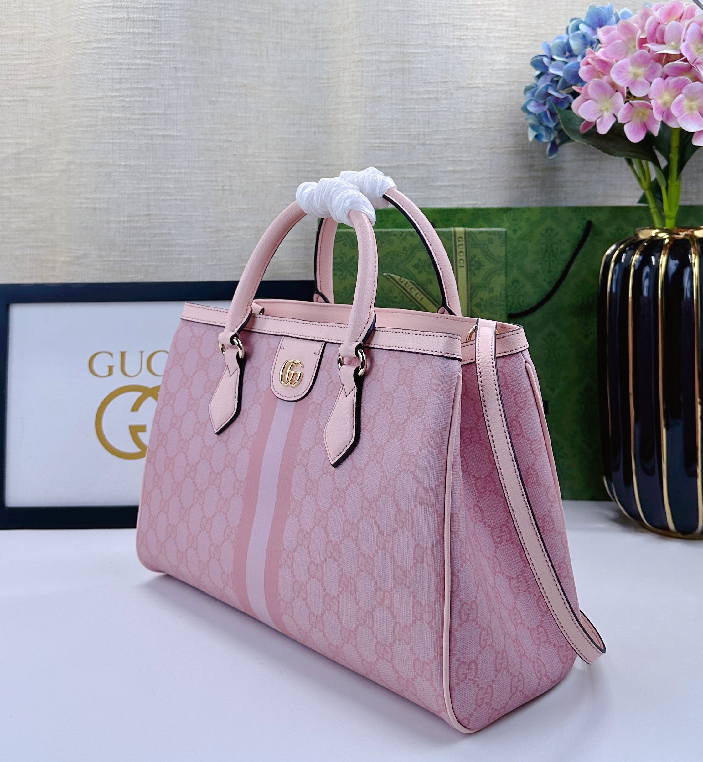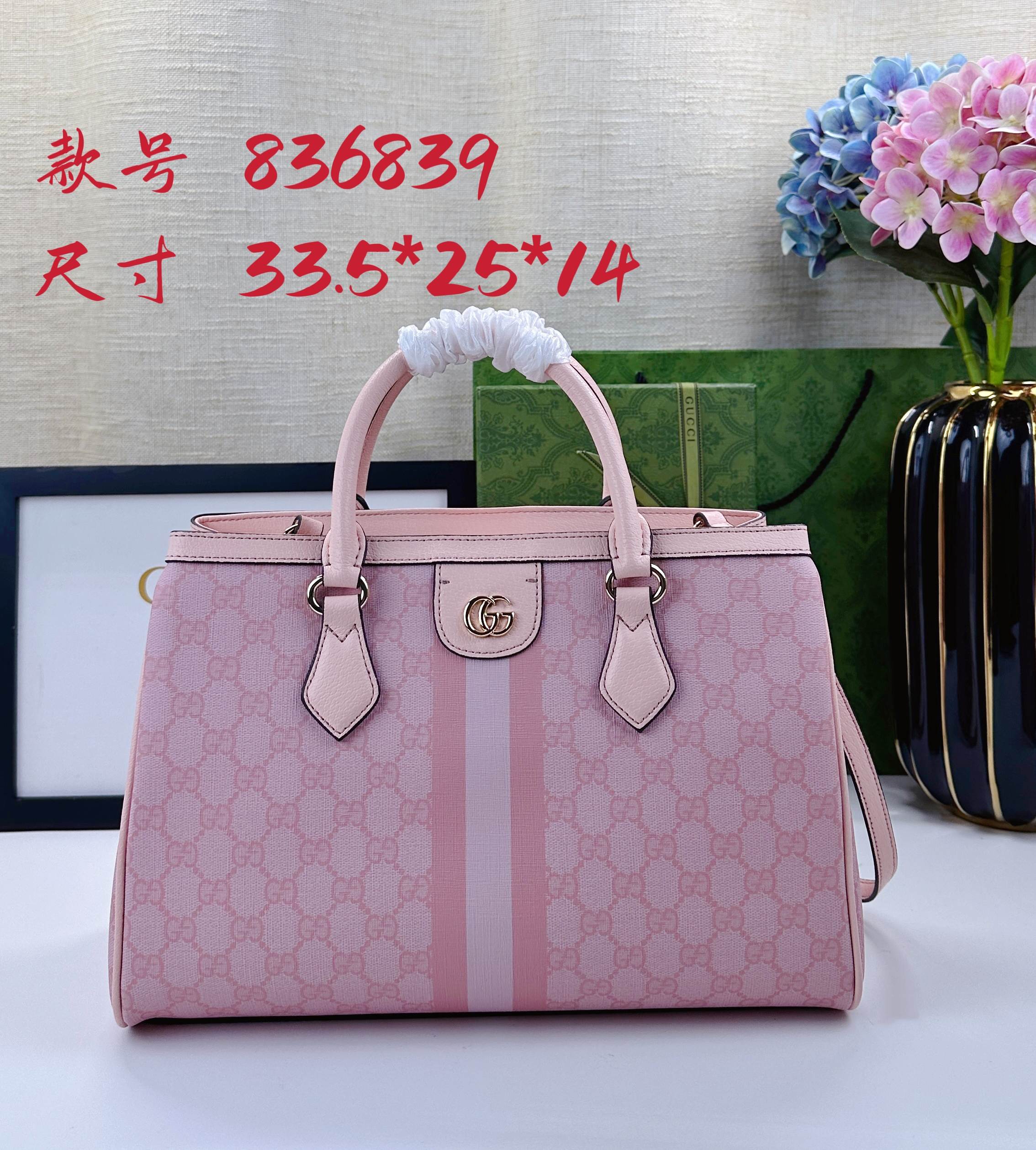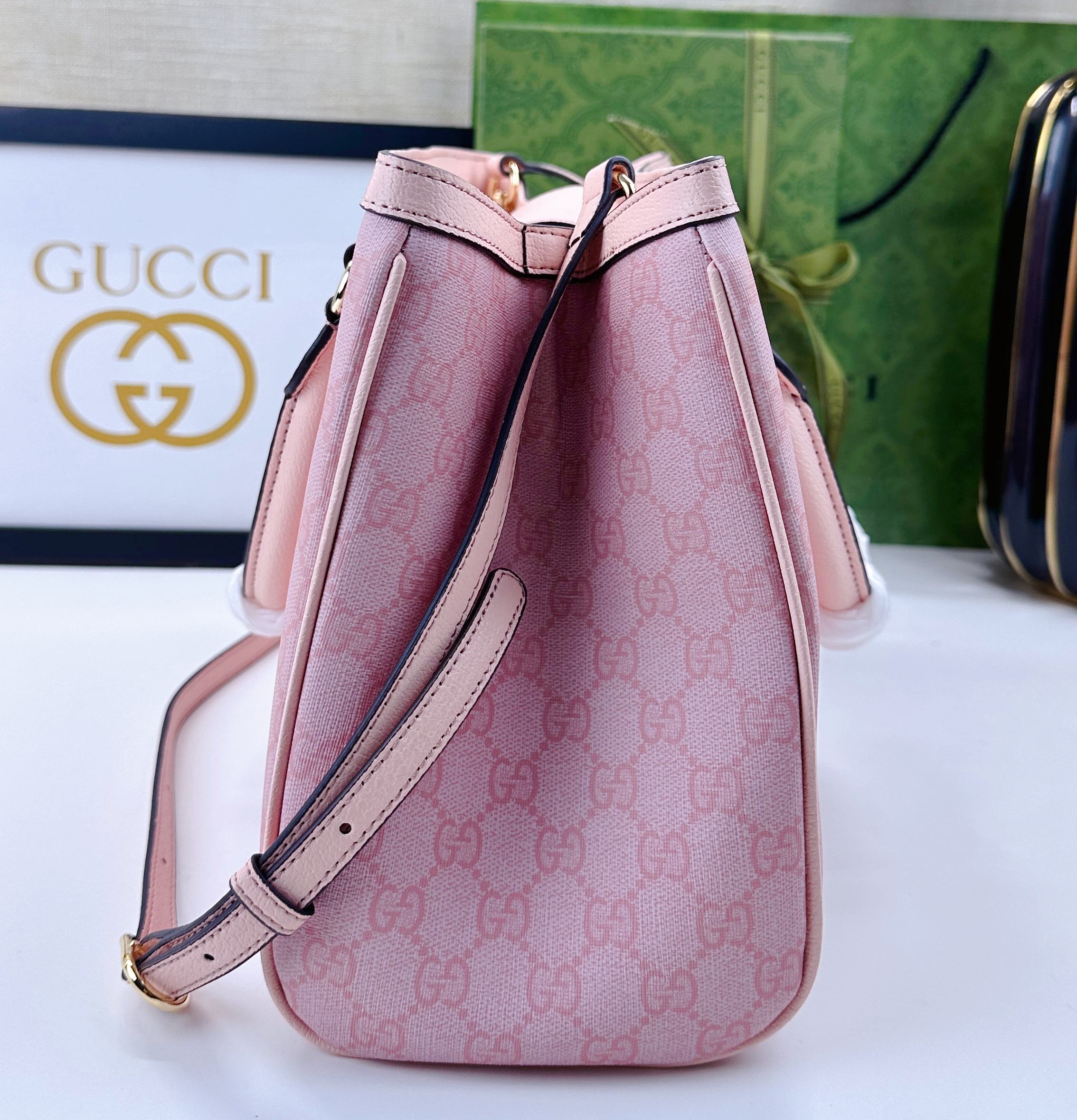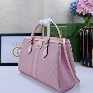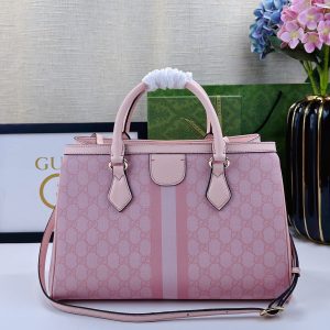 Batch 340… The new Ophidia collection presents striking silhouettes and functionality, expertly crafted in signature beige and brown colorways to create soft-textured, refreshed bag styles.Beige and dark brown GG canvas Brown leather trim Light gold-tone hardware Green cotton lining Interior: One open pocket, one zippered pocket in the middle compartment Handles (10 cm high) Removable and adjustable leather shoulder strap (Height: 50 cm to 55 cm;Length: 108 cm to 118 cm) Model: 836839 Dimensions: 33.5 cm (W) x 25 cm (H) x 14 cm (D) Weight: Approx. 0.95 kg Color: Pink PVC Pink Leather. Made in Italy