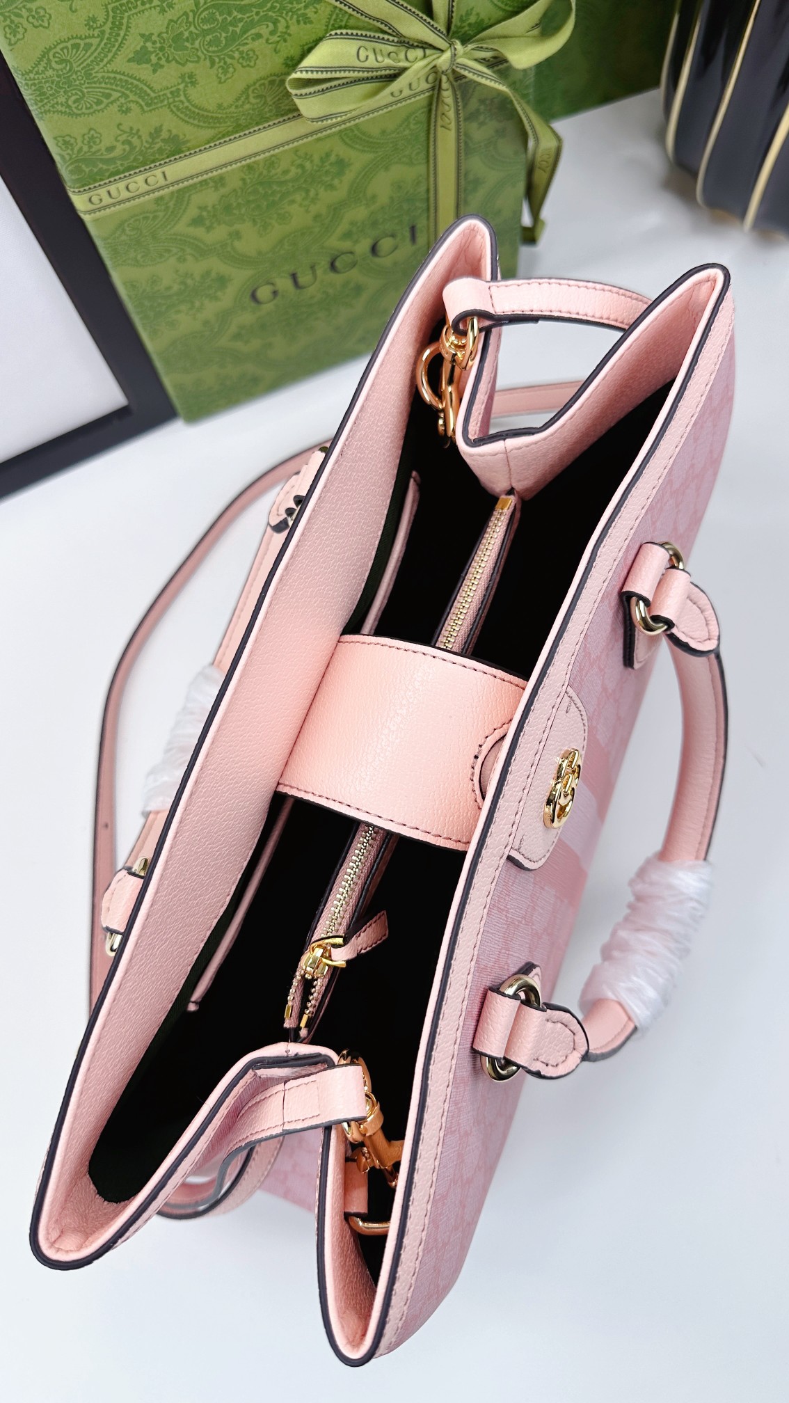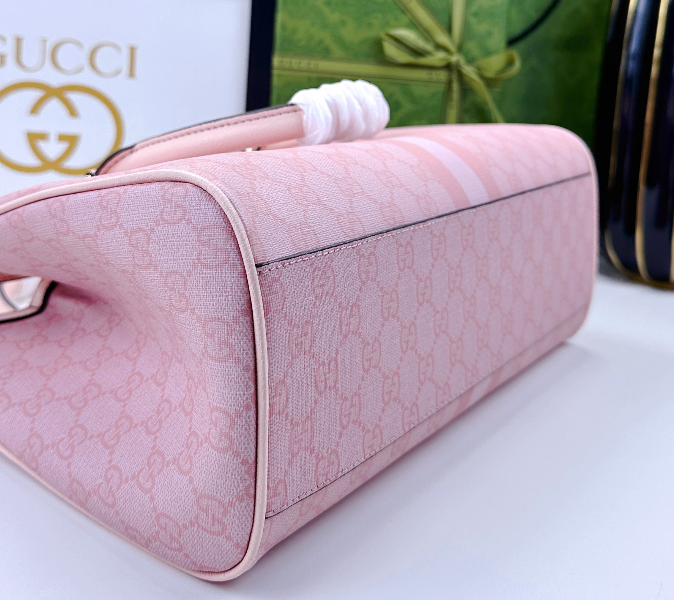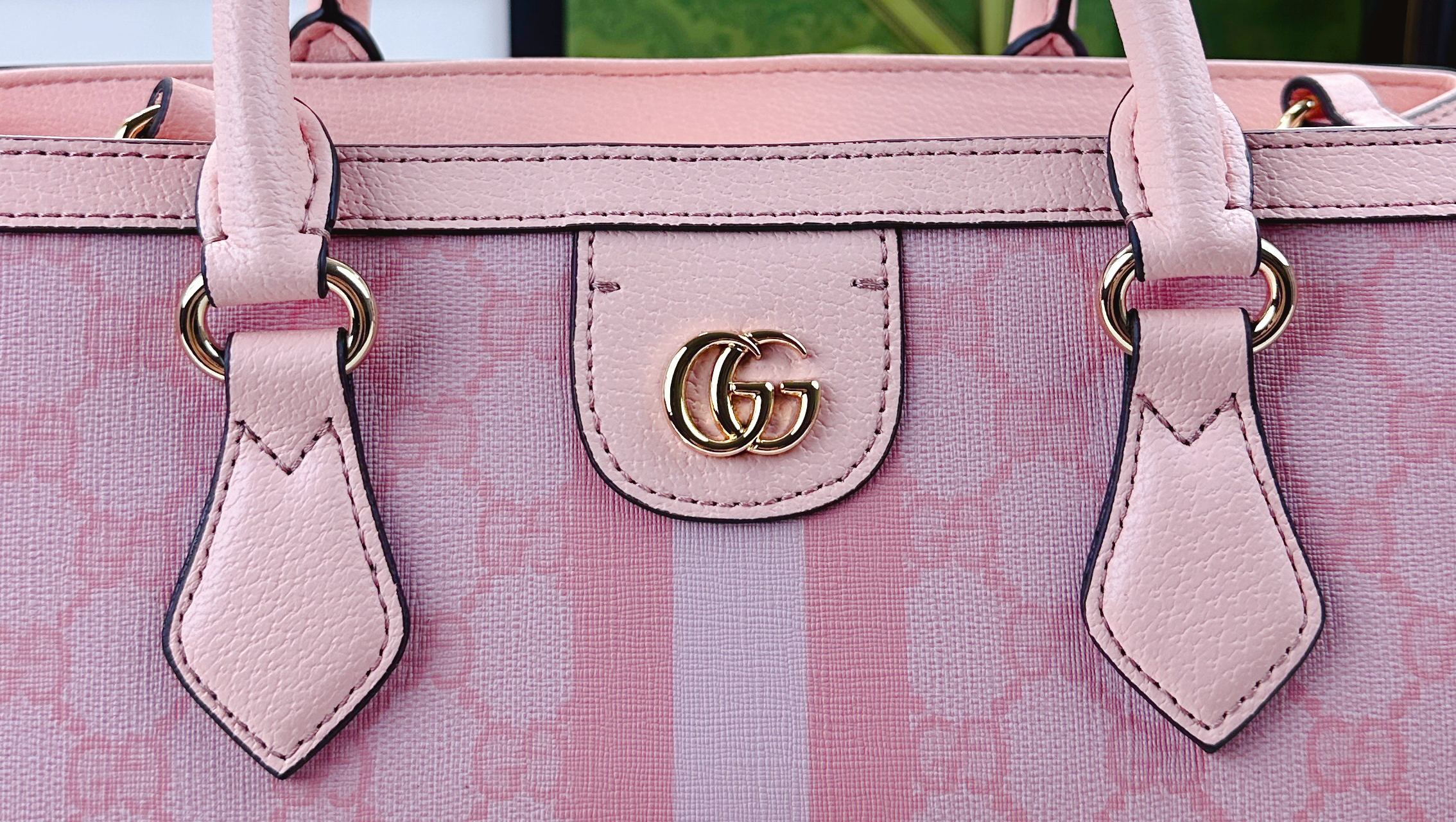 Batch 340… The new Ophidia collection presents striking silhouettes and functionality, expertly crafted in signature beige and brown colorways to create soft-textured, refreshed bag styles.Beige and dark brown GG canvas Brown leather trim Light gold-tone hardware Green cotton lining Interior: One open pocket, one zippered pocket in the middle compartment Handles (10 cm high) Removable and adjustable leather shoulder strap (Height: 50 cm to 55 cm;Length: 108 cm to 118 cm) Model: 836839 Dimensions: 33.5 cm (W) x 25 cm (H) x 14 cm (D) Weight: Approx. 0.95 kg Color: Pink PVC Pink Leather. Made in Italy