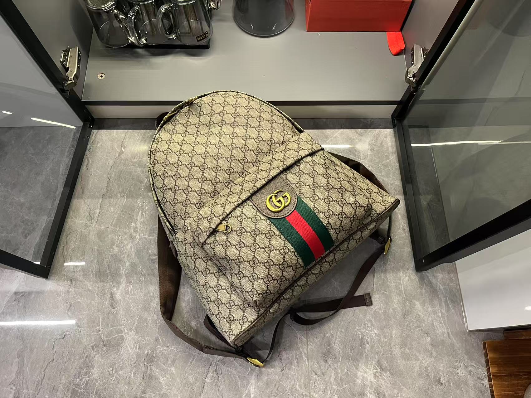 Be the first to review “Batch 380…GG Ophidia series masterfully blends two shades of black, pairing classic silhouettes with new functionality, crafted from exceptionally soft fabrics. This backpack features GG monogrammed coated fabric, meticulously embellished with double G logos and red-green woven ribbon details.Gold-tone hardware. Dark green linen-cotton blend lining. Model: 834466. Dimensions: 36.5 x 41 x 18 cm.” Cancel reply