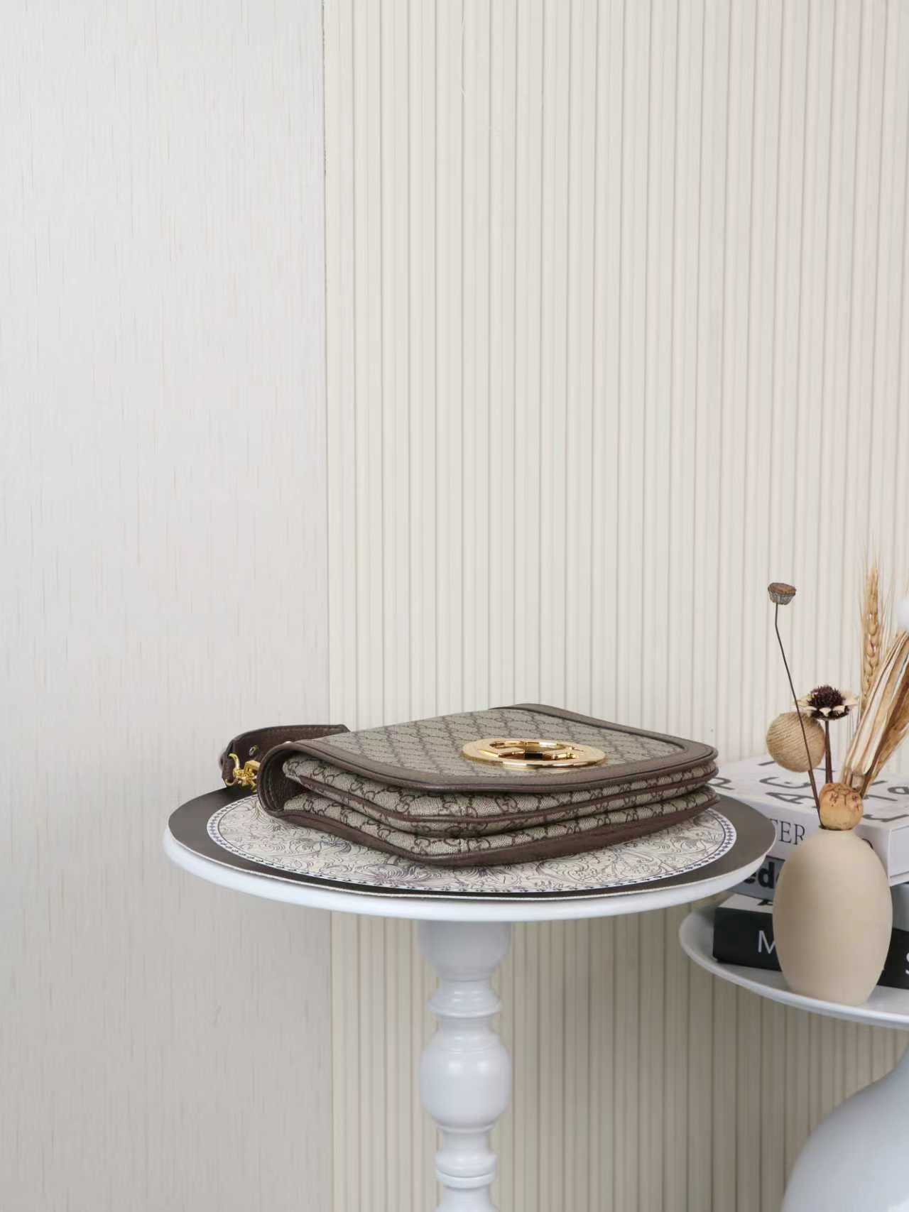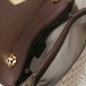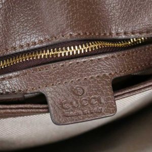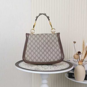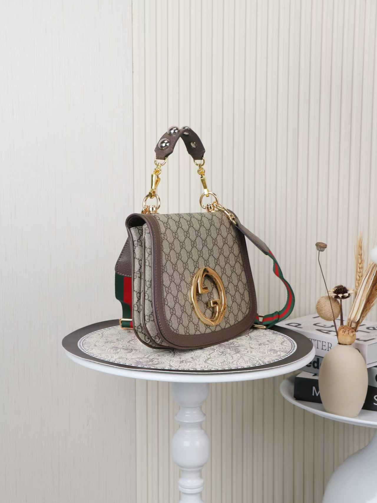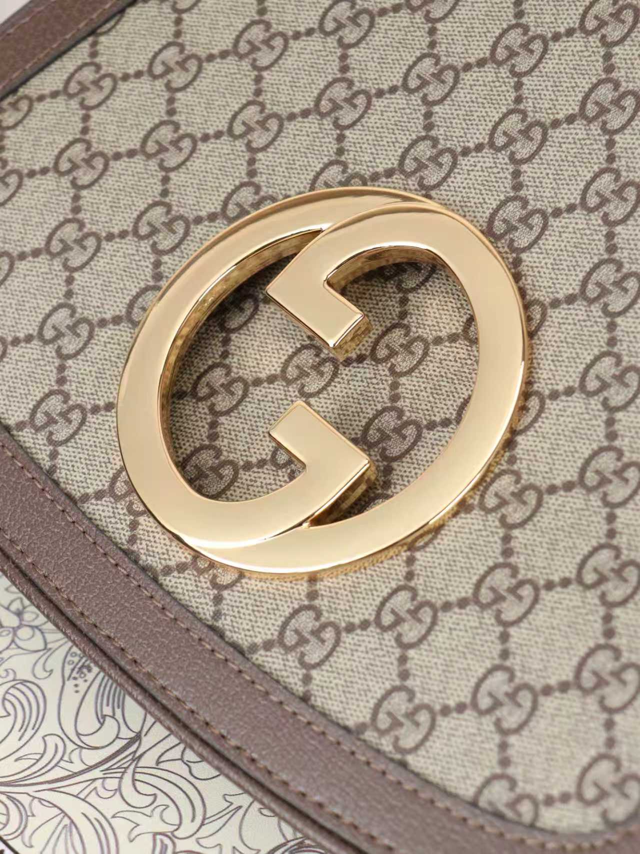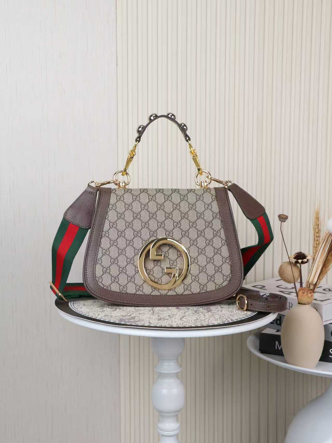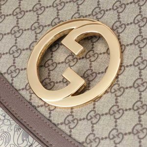 Blondie Series Tote Bag. This shoulder bag features studded handles, beige and ebony GG canvas, gold-tone hardware, and a circular double G interlocking clasp with two interchangeable shoulder straps.