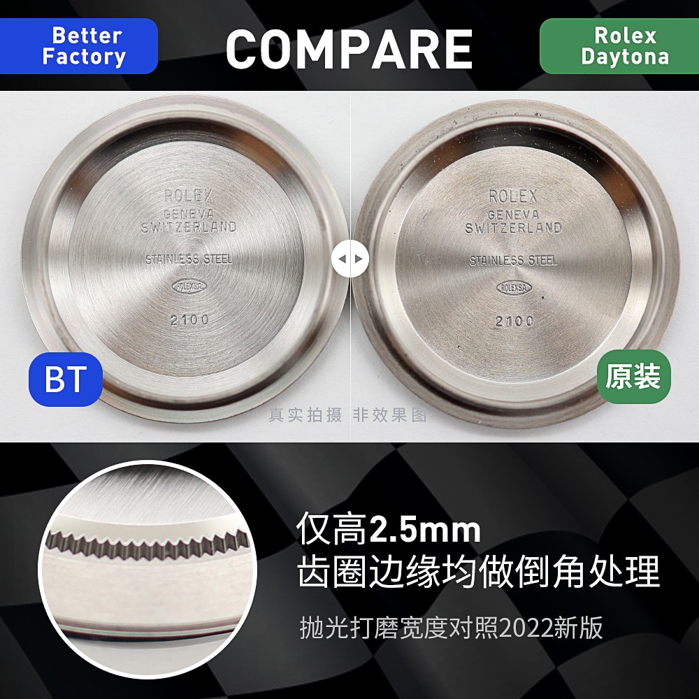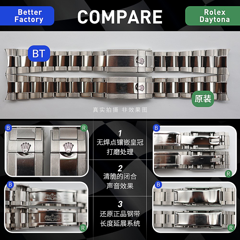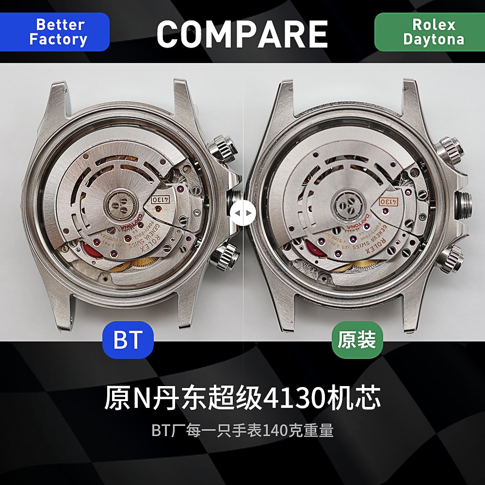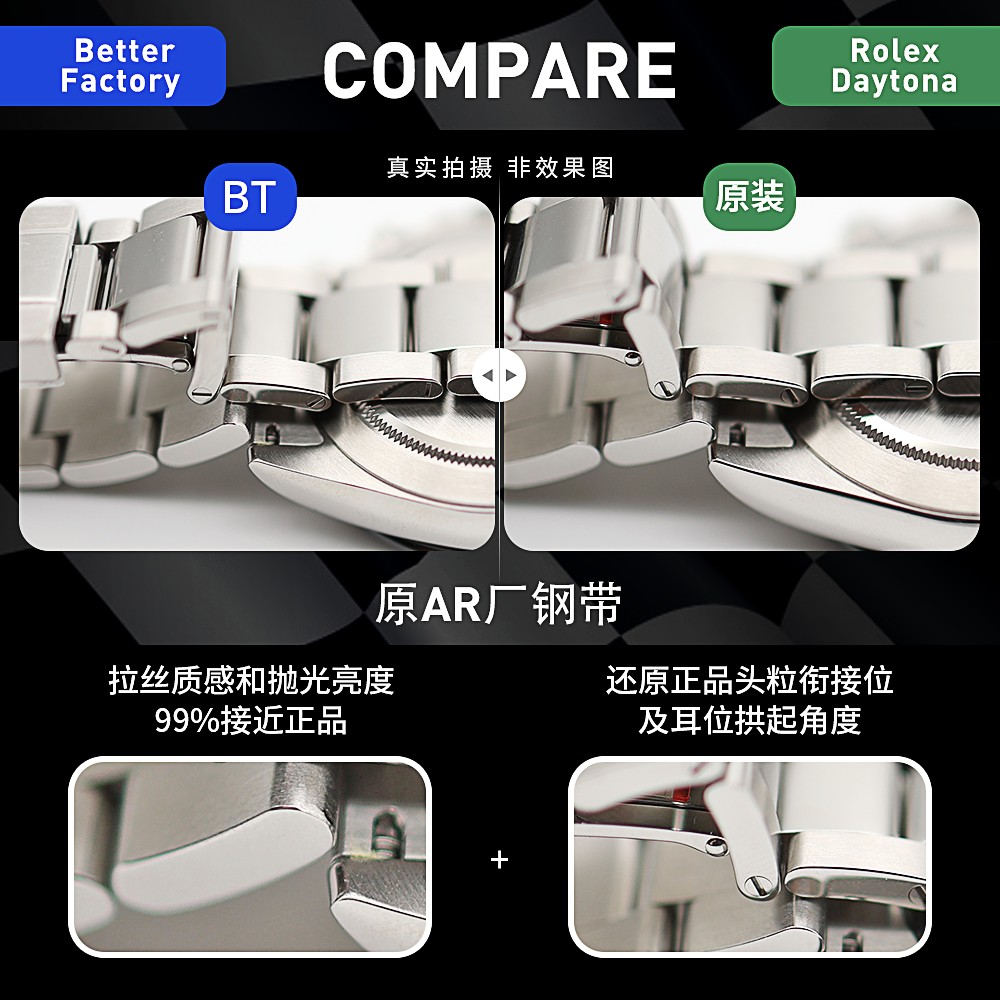 Better Factory 2022 Latest Version Daytona Specifications: Model: 116500 Dimensions: 40mm × 12.2mm Functions: Hours, Minutes, Seconds, Chronograph Display Movement: 4130 Power Reserve: 72 hours Crystal: SapphireSapphire Crystal Dial: White dial, black dial Material: 904L Stainless Steel Bracelet: AR Factory Steel Bracelet Bezel: Ceramic bezel with platinum-plated coating Luminescence: Swiss luminous paint Water Resistance: 100 meters Weight: 148 grams BT Factory (Better Factory) Rolex Daytona Nine Key Features: 1. The BT Factory Daytona 4130 movement watch thickness is 12.2mm for the latest 2022 model, compared to 12.4mm for older versions. Other market versions use 7750 fake bridge movements, which reduce thickness by flattening the pin bar. These have extremely poor stability and cannot match the genuine version. 2. Features the 4130 movement (originally from N Dandong Factory). The engraved and electroplated font on the back plate is brighter. 3. Steel bracelet uses the original AR Factory design. Additionally, the clasp has been upgraded in proportion and dimensions. 4. The case is machined by N Factory to match the latest 2022 version, with updated polishing on the case back, enhanced gloss finish, and refined bezel edge curvature. 5. Hands upgraded by Buff Factory: all three small seconds hands and the large seconds hand are individually custom-made with solid ferrules, featuring mushroom-shaped caps. 6. Cerachrom bezel further upgraded with platinum-plated lettering to prevent discoloration, while font thickness is optimized. 7. The dial replicates the 2022 white version, using Swiss ink blended with Korean ceramic polishing to achieve a thick, pure milky white with no color difference from the original. This eliminates the “dead white” tint that previously appeared blackish in the market. 8. Each hour marker is individually CNC-engraved and hand-polished at the edges. The luminous material uses Swiss phosphorescent powder, matching the genuine version perfectly. The final effect delivers the closest luminous visual to the original in the market. 9. The crystal employs fully transparent sapphire glass with no visible edges. Currently, most market crystals exhibit a thick, rounded edge appearance. Only BT Factory’s craftsmanship matches the genuine article’s details. Better Factory is a watchmaker with 30 years of manufacturing experience. Leveraging extensive resources, it possesses substantial technical expertise and industry connections. Watch enthusiasts are welcome to compare our products with originals and provide valuable feedback. Thank you for your support!