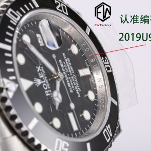 2. The white gold bezel markers are more refined, with no noticeable granular texture, and the color is closer to the original.3. Upgraded inner bezel engraving using genuine technology, revealing distinct dual engraving lines on inner and outer rings. 4. Sapphire crystal edges feature smoother chamfers. 5. Reprinted dial fonts. 6. Enhanced bracelet edge polishing.7. The inner side of the Submariner extension clasp now features black ceramic beads identical to the genuine version when opened. 8. The Rolex pattern on the inner side of the clasp has been polished, matching the latest genuine version. 9. The luminous pearls have been upgraded. The metal part of the luminous pearls now has internal bevels, and the visual effect is consistent with the genuine version. EW production, guaranteed premium quality.