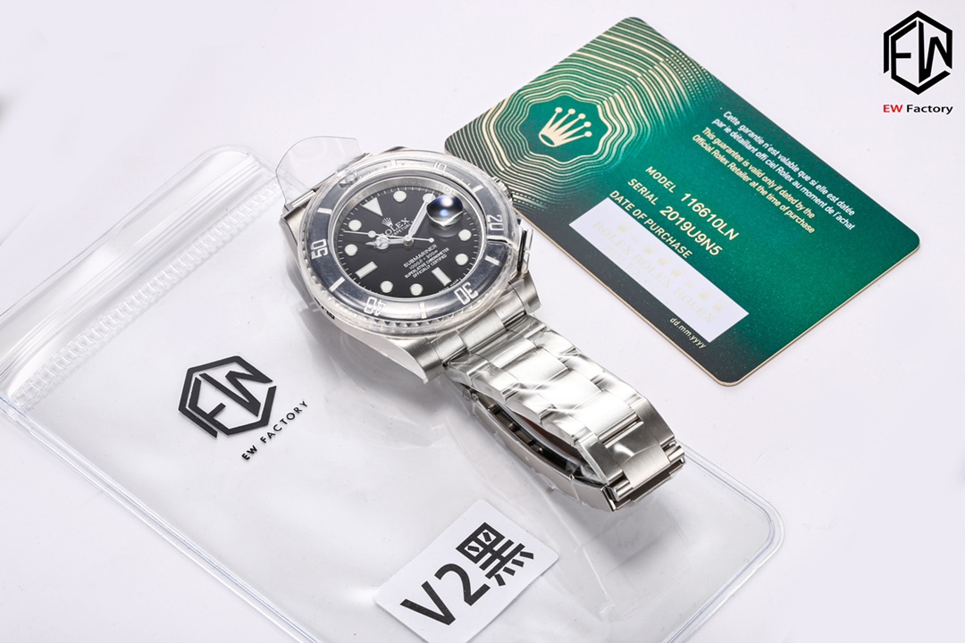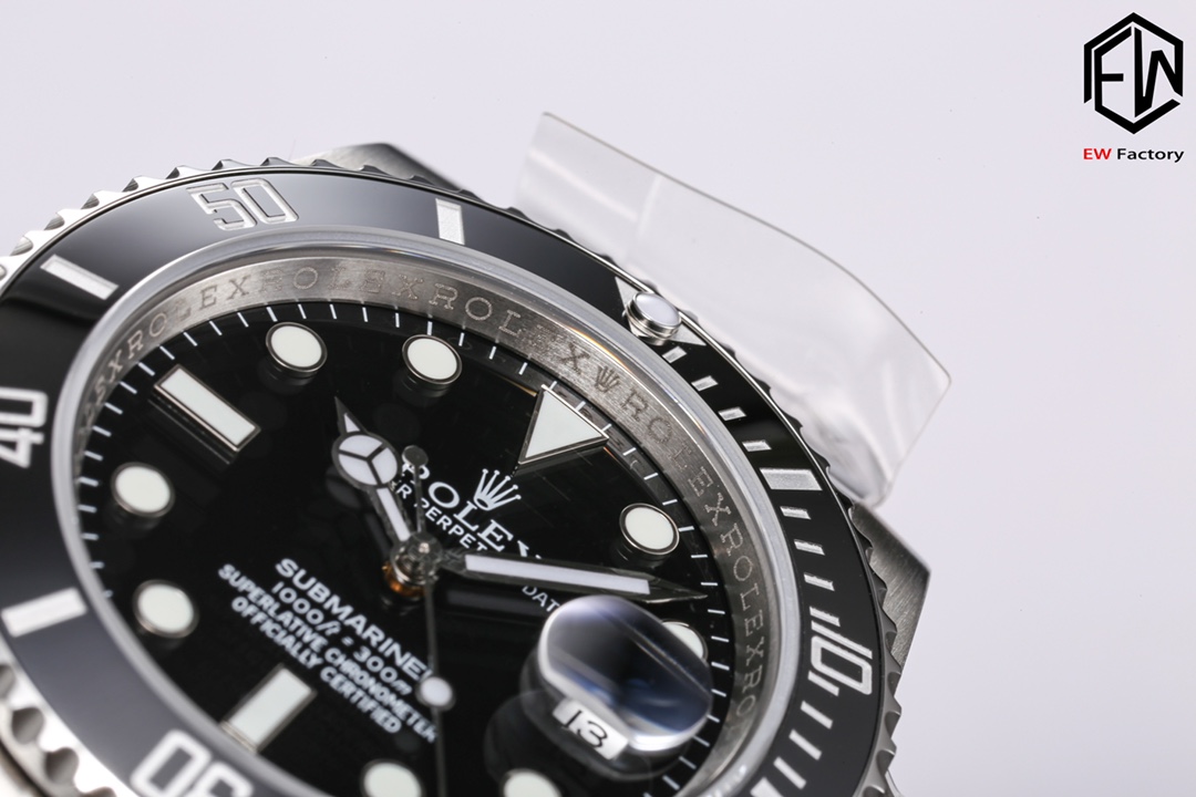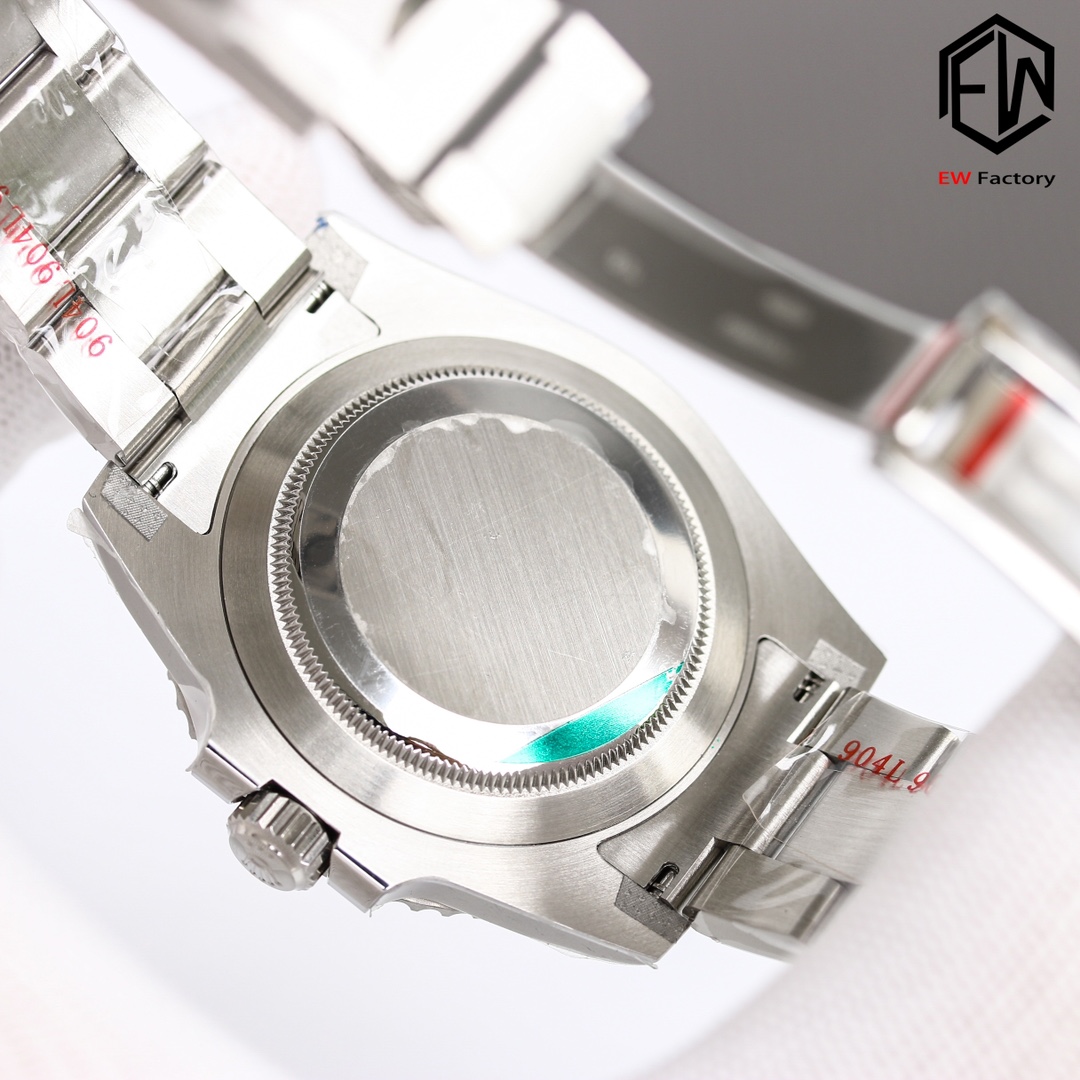 2. The white gold bezel markers are more refined, with no noticeable granular texture, and the color is closer to the original.3. Upgraded inner bezel engraving using genuine technology, revealing distinct dual engraving lines on inner and outer rings. 4. Sapphire crystal edges feature smoother chamfers. 5. Reprinted dial fonts. 6. Enhanced bracelet edge polishing.7. The inner side of the Submariner extension clasp now features black ceramic beads identical to the genuine version when opened. 8. The Rolex pattern on the inner side of the clasp has been polished, matching the latest genuine version. 9. The luminous pearls have been upgraded. The metal part of the luminous pearls now has internal bevels, and the visual effect is consistent with the genuine version. EW production, guaranteed premium quality.