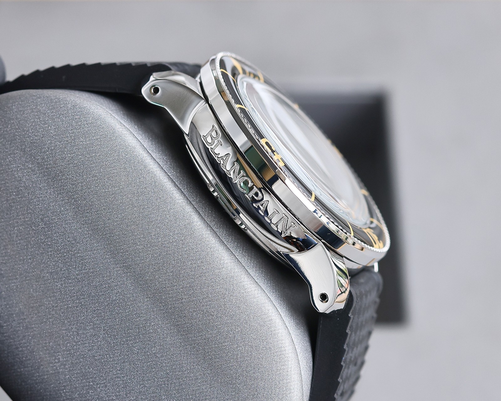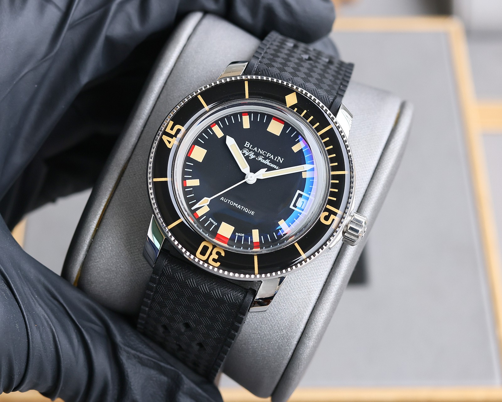 1⃣️ Hailed by watch enthusiasts as the pinnacle of aesthetics in the Blancpain lineup! The dial features a black base with hour markers layered in aged red and beige hues. The domed sapphire crystal and rotating bezel shimmer like jade in sunlight.