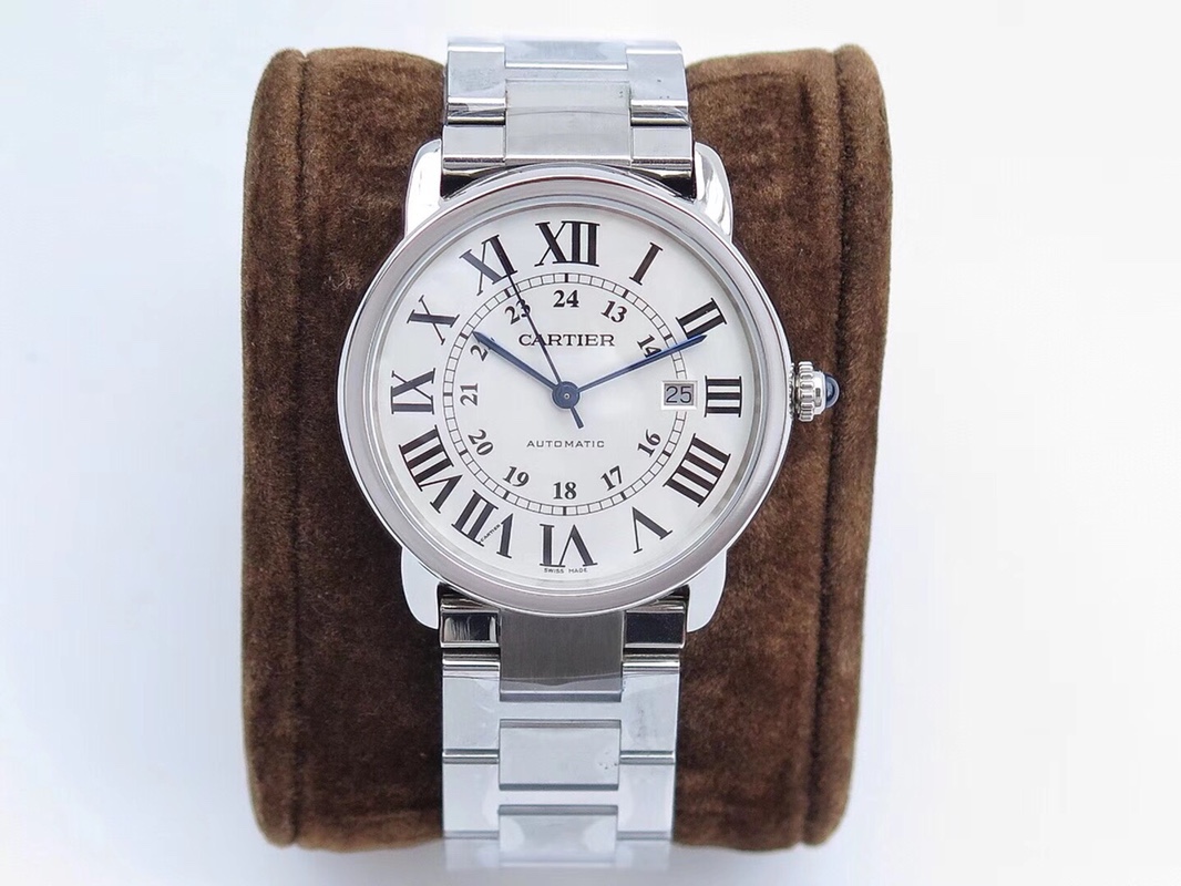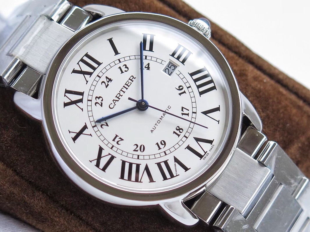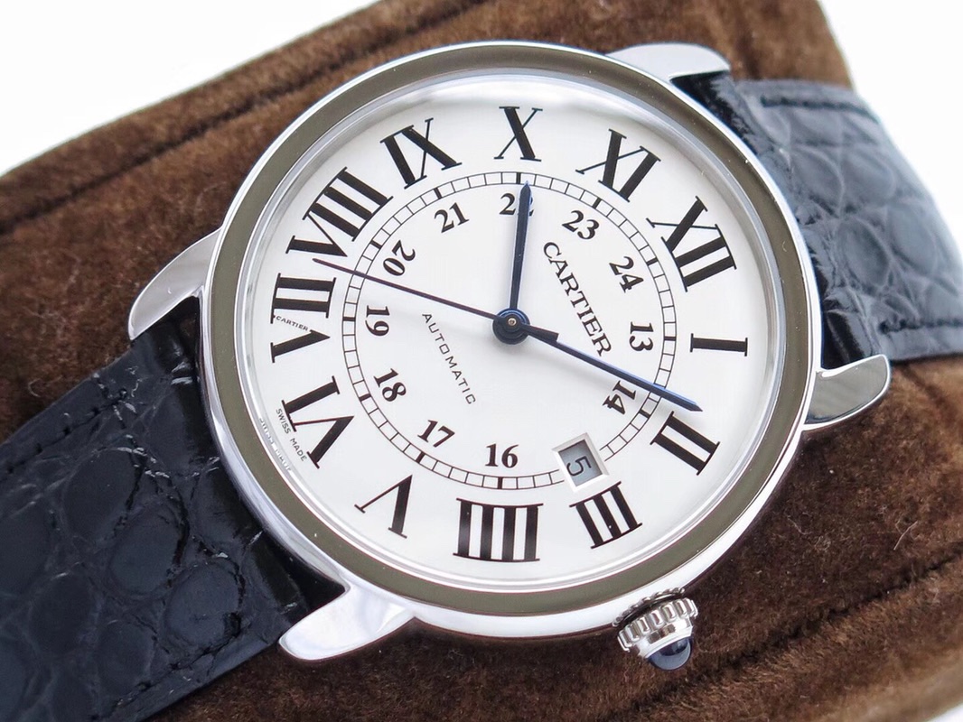 Cartier (London Collection) W670101 Ultra-Thin Classic. Authentic molded case housing an imported Miyota 9015 movement. The SOLO collection perfectly preserves its timeless elegance and signature Cartier features. Roman numeral hour markers, sword-shaped blued steel hands, and a cabochon-cut sapphire crown create a flawless fusion with the flange. Truly embodies refined sophistication for formal occasions!42mm x 8.36mm Steel bracelet or Italian calf leather strap