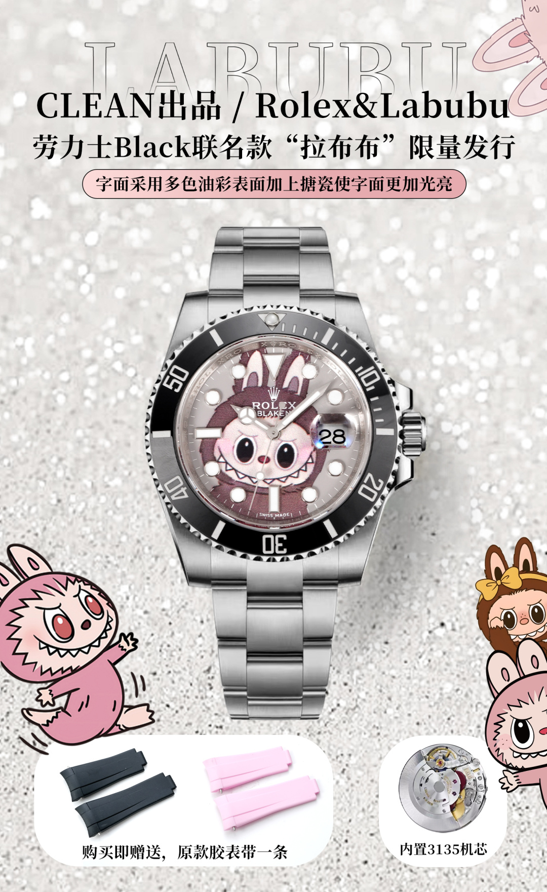CLEAN➕出品,Rolex&Labubu劳力士Black联名款“拉布布”限量发行字面采用多色油彩表面加上搪瓷使字面更加光亮劳力士 ROLEX -粉色水鬼,40mm搭载一比一超级3135上海一体机芯,整表904L精钢 /搭配ar厂钢带,唯一做到指针夜光/字钉夜光 做到同色 秒针针轴锅盖实心中轴,因为都是第三方工厂加工+自购瑞士 c1+c3夜光粉 ,字钉ip白金电镀 6:陶瓷绿圈采用clean绿圈v4版本 颜色无限接近原装 clean陶瓷类配件 无需赘述 高品质象征 /谨防假clean圈 注意区分温润如玉夜光珠 不死白 采用clean陶瓷圈+夜光珠完美复刻 彻底解决世面上的大部分水鬼痛点,只为极致而生 精致推荐男士机械腕表