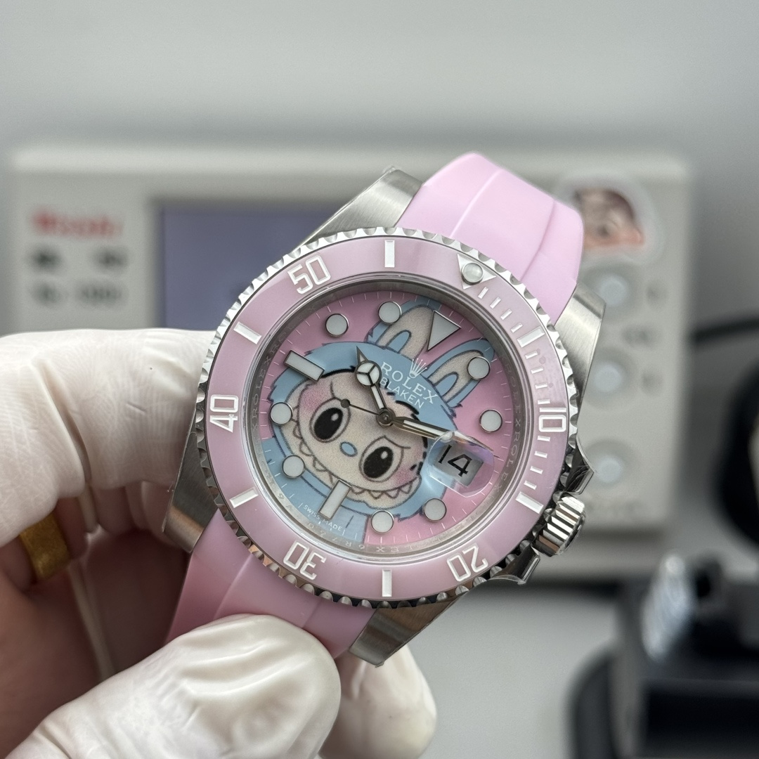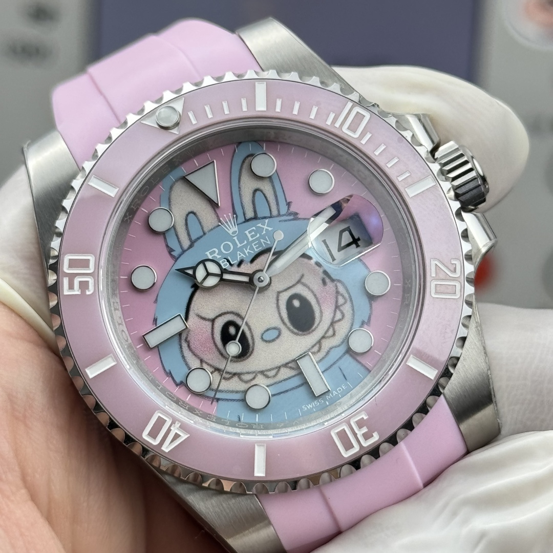CLEAN➕出品,Rolex&Labubu劳力士Black联名款“拉布布”限量发行字面采用多色油彩表面加上搪瓷使字面更加光亮劳力士 ROLEX -粉色水鬼,40mm搭载一比一超级3135上海一体机芯,整表904L精钢 /搭配ar厂钢带,唯一做到指针夜光/字钉夜光 做到同色 秒针针轴锅盖实心中轴,因为都是第三方工厂加工+自购瑞士 c1+c3夜光粉 ,字钉ip白金电镀 6:陶瓷绿圈采用clean绿圈v4版本 颜色无限接近原装 clean陶瓷类配件 无需赘述 高品质象征 /谨防假clean圈 注意区分温润如玉夜光珠 不死白 采用clean陶瓷圈+夜光珠完美复刻 彻底解决世面上的大部分水鬼痛点,只为极致而生 精致推荐男士机械腕表