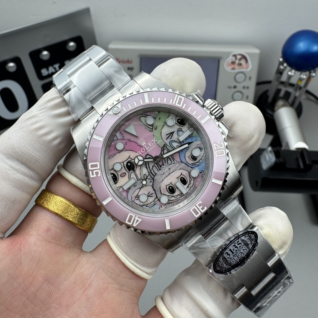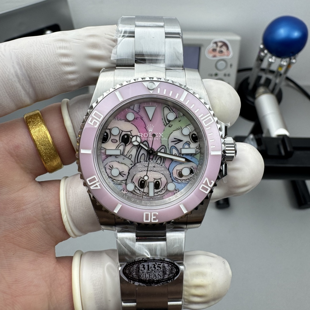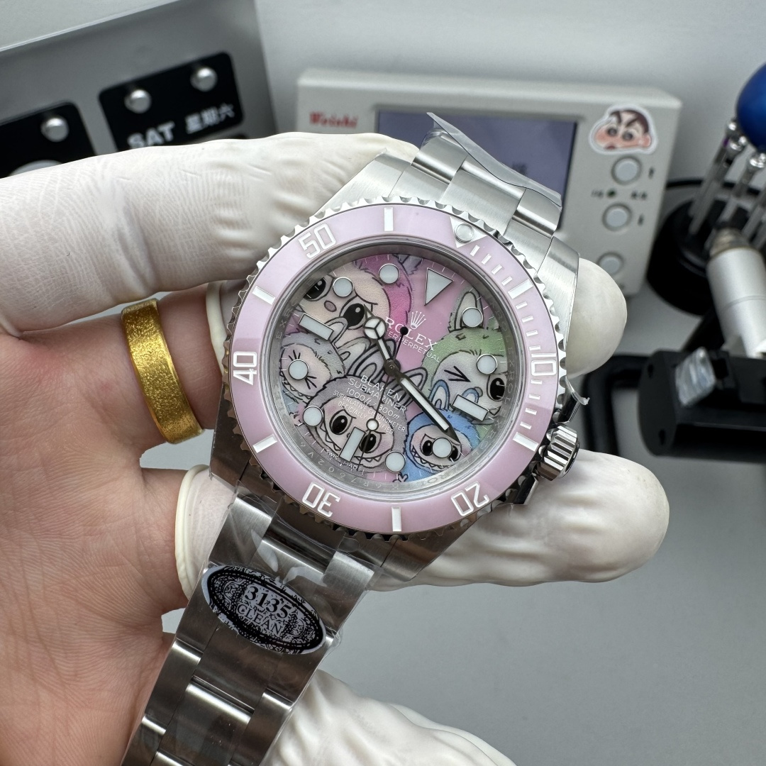CLEAN➕出品,Rolex&Labubu劳力士Black联名款“拉布布”限量发行字面采用多色油彩表面加上搪瓷使字面更加光亮劳力士 ROLEX -粉色水鬼,40mm搭载一比一超级3135上海一体机芯,整表904L精钢 /搭配ar厂钢带,唯一做到指针夜光/字钉夜光 做到同色 秒针针轴锅盖实心中轴,因为都是第三方工厂加工+自购瑞士 c1+c3夜光粉 ,字钉ip白金电镀 6:陶瓷绿圈采用clean绿圈v4版本 颜色无限接近原装 clean陶瓷类配件 无需赘述 高品质象征 /谨防假clean圈 注意区分温润如玉夜光珠 不死白 采用clean陶瓷圈+夜光珠完美复刻 彻底解决世面上的大部分水鬼痛点,只为极致而生 精致推荐男士机械腕表