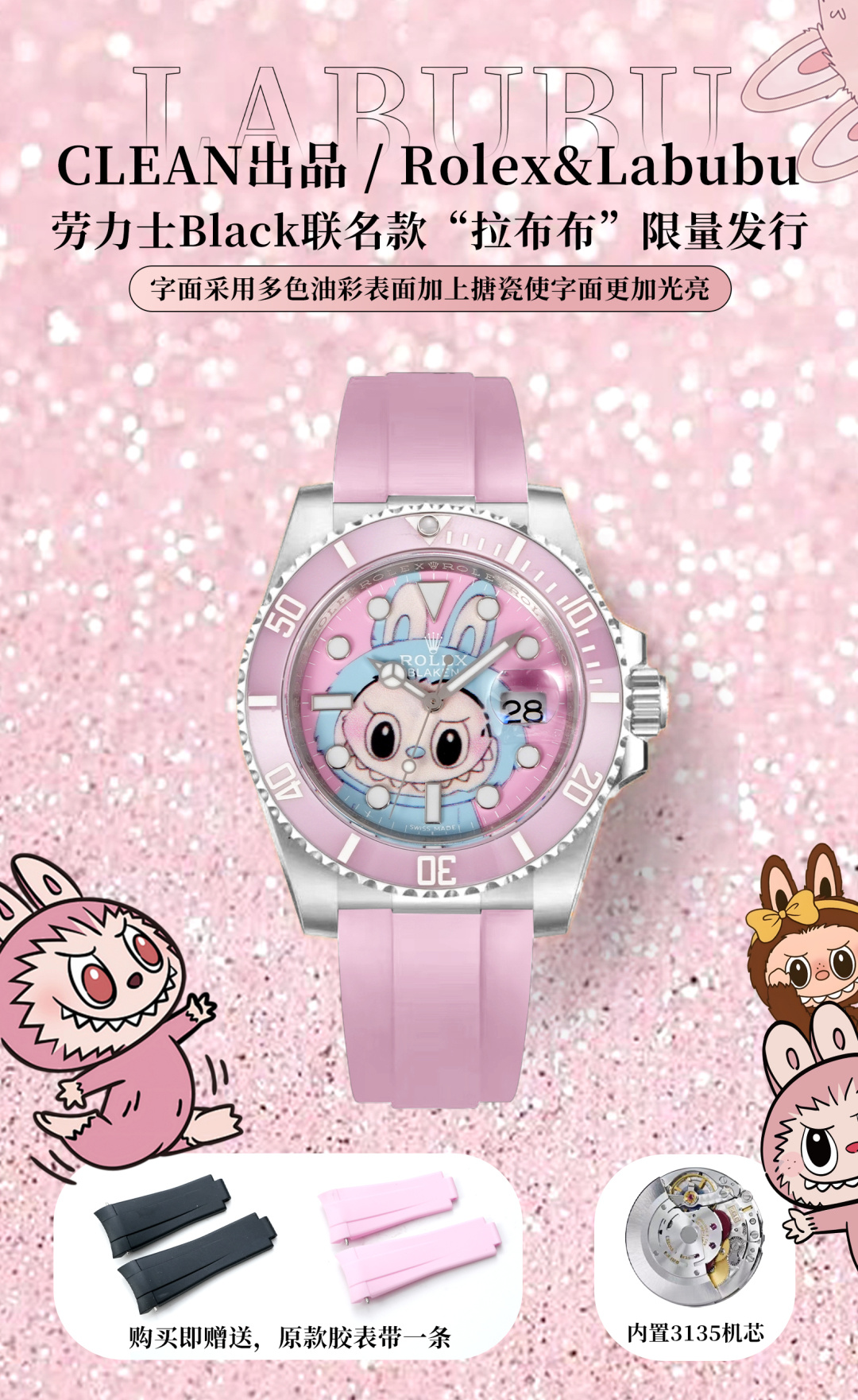 CLEAN➕出品,Rolex&Labubu劳力士Black联名款“拉布布”限量发行字面采用多色油彩表面加上搪瓷使字面更加光亮劳力士 ROLEX -粉色水鬼,40mm搭载一比一超级3135上海一体机芯,整表904L精钢 /搭配ar厂钢带,唯一做到指针夜光/字钉夜光 做到同色 秒针针轴锅盖实心中轴,因为都是第三方工厂加工+自购瑞士 c1+c3夜光粉 ,字钉ip白金电镀 6:陶瓷绿圈采用clean绿圈v4版本 颜色无限接近原装 clean陶瓷类配件 无需赘述 高品质象征 /谨防假clean圈 注意区分温润如玉夜光珠 不死白 采用clean陶瓷圈+夜光珠完美复刻 彻底解决世面上的大部分水鬼痛点,只为极致而生 精致推荐男士机械腕表