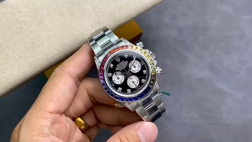 Crafted with utmost dedication to achieve the authentic Rolex Rainbow Daytona effect, this masterpiece was developed through substantial investment and meticulous engineering. Each of the three independent chronograph subdials features a unique golden crystal effect, where mesmerizing reflections and vibrant hues showcase the crystal’s exquisite structure. Every piece stands as a naturally formed work of art.The golden crystal chronograph dials create a striking contrast against the black dial, harmonizing with the gemstone hues. Paired with diamond-set hour markers and gold hands, the entire dial radiates a dazzling brilliance, boasting an overwhelming aesthetic appeal that makes it truly irresistible.Rolex’s most sought-after Cosmograph Daytona model features a case crafted from imported genuine 904L steel, matching the authentic material specification. The steel bracelet boasts a finely brushed finish, presenting a brighter, whiter, and more lustrous appearance while offering exceptional durability and scratch resistance.[Functionality] The movement retains its powerful chronograph capabilities, now paired with the new 4130 full-function chronograph movement. [Bezel] The newly crafted monobloc ceramic bezel mirrors the authentic manufacturing process, delivering deep, rounded engravings. [Details] The hour markers feature a mirror-polished finish with no rough edges, utilizing Swiss-imported high-intensity luminous paint.Hour and minute hands feature grooved-cut black lacquer filling—not standard printing—delivering vastly superior texture. High-transparency sapphire crystal offers exceptional mirror-like quality. 【Quality】Enhanced stability and oxidation resistance. Fitted with a natural rubber strap molded from the original design, matching the genuine article in material. Noticeably softer and smoother texture ensures a more comfortable, snug fit on the wrist.