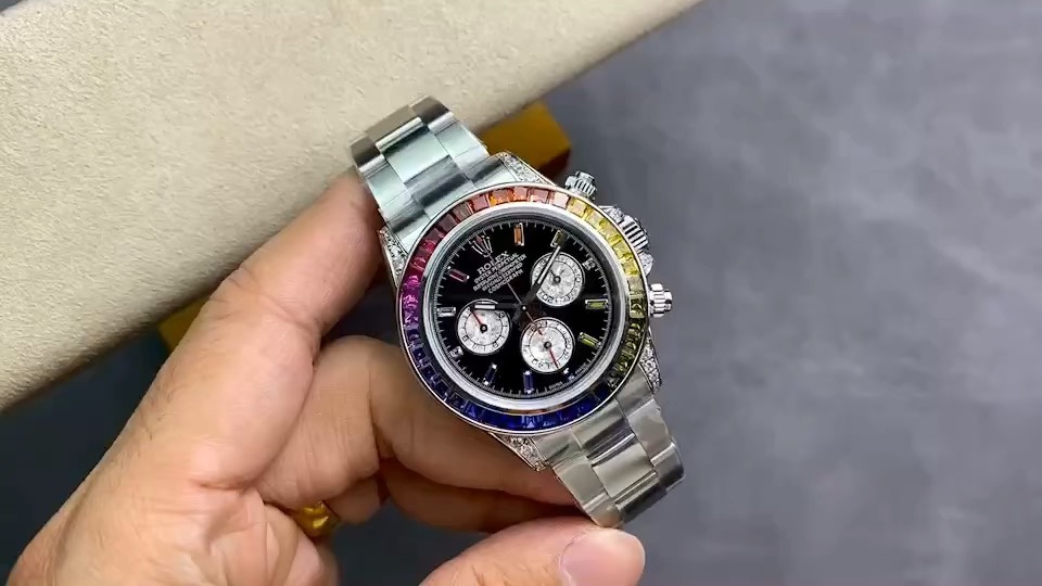 Crafted with utmost dedication to achieve the authentic Rolex Rainbow Daytona effect, this masterpiece was developed through substantial investment and meticulous engineering. Each of the three independent chronograph dials features a unique golden crystal effect, where mesmerizing reflections and vibrant hues showcase the crystal’s exquisite structure. Every piece stands as a naturally formed work of art.The golden crystal chronograph subdials create a striking contrast against the black dial, harmonizing with the gemstone hues. Paired with diamond-set hour markers and gold hands, the entire dial radiates a dazzling brilliance, achieving an overwhelming aesthetic appeal that makes it truly irresistible.Rolex’s most sought-after Cosmograph Daytona model features a case crafted from imported genuine 904L steel, matching the authentic material specification. The steel bracelet boasts a finely brushed finish, presenting a brighter, whiter, and more lustrous appearance while offering exceptional durability and scratch resistance.[Functionality] The movement retains its powerful chronograph capabilities, now paired with the new 4130 full-function chronograph movement. [Bezel] The newly crafted monobloc ceramic bezel mirrors the authentic manufacturing process, delivering deep, rounded engravings. [Details] The hour markers feature a mirror-polished finish with no rough edges, utilizing Swiss-imported high-intensity luminous paint.Hour and minute hands feature grooved-cut black lacquer filling—not ordinary printing—resulting in vastly superior texture. High-transparency sapphire crystal delivers exceptional mirror-like quality. 【Quality】Enhanced stability and oxidation resistance. Fitted with a natural rubber strap, molded from the original design. Identical material to the genuine article, noticeably softer and smoother texture, offering superior wrist comfort.