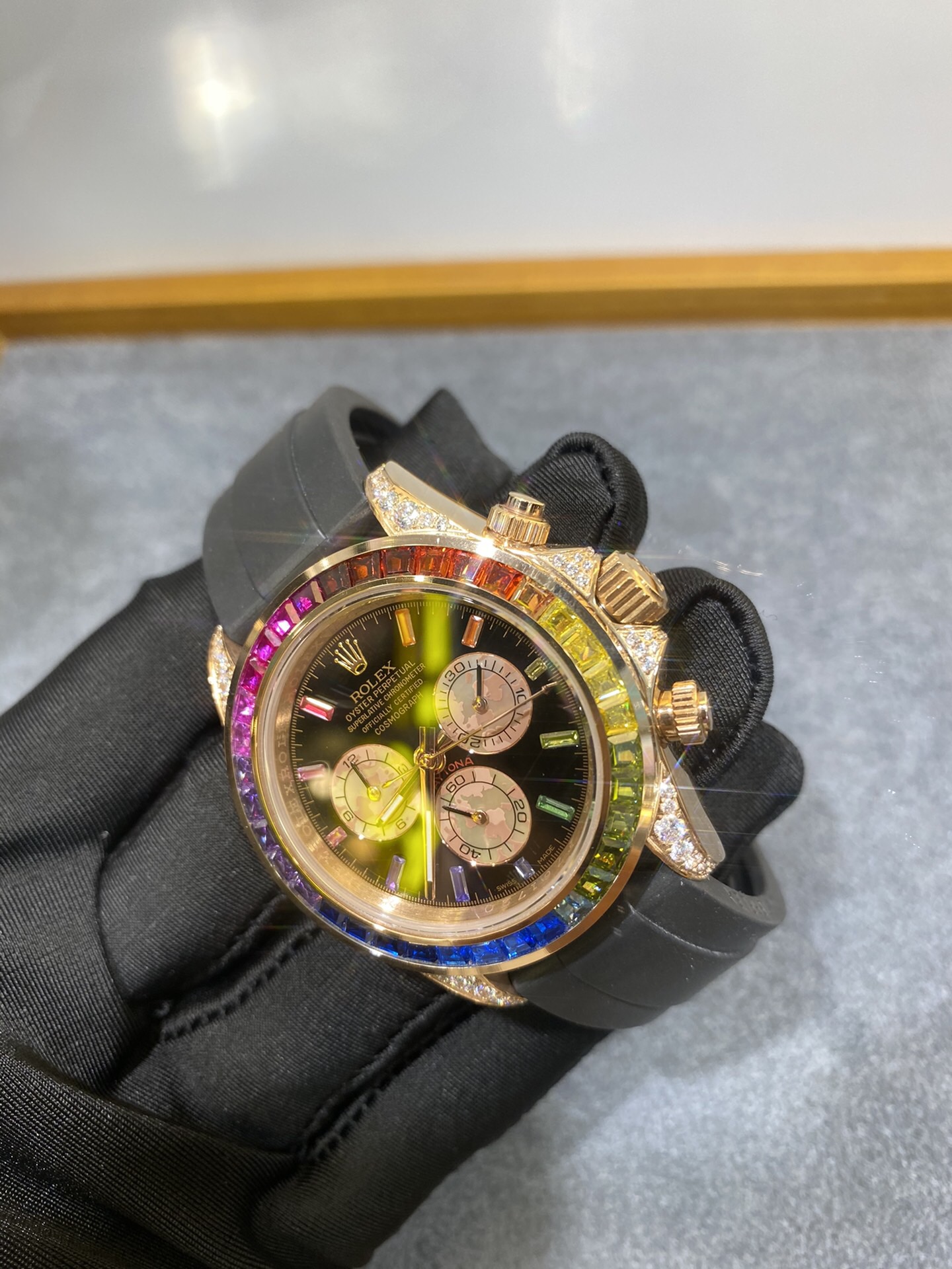 Custom-made Rainbow Diamond, featuring the 7750 movement, encased in 18K rose gold. Our factory products guarantee: genuine materials. 18K jewelry with real gold and diamonds, exquisite craftsmanship. Each piece comes with a certificate, verifiable online.