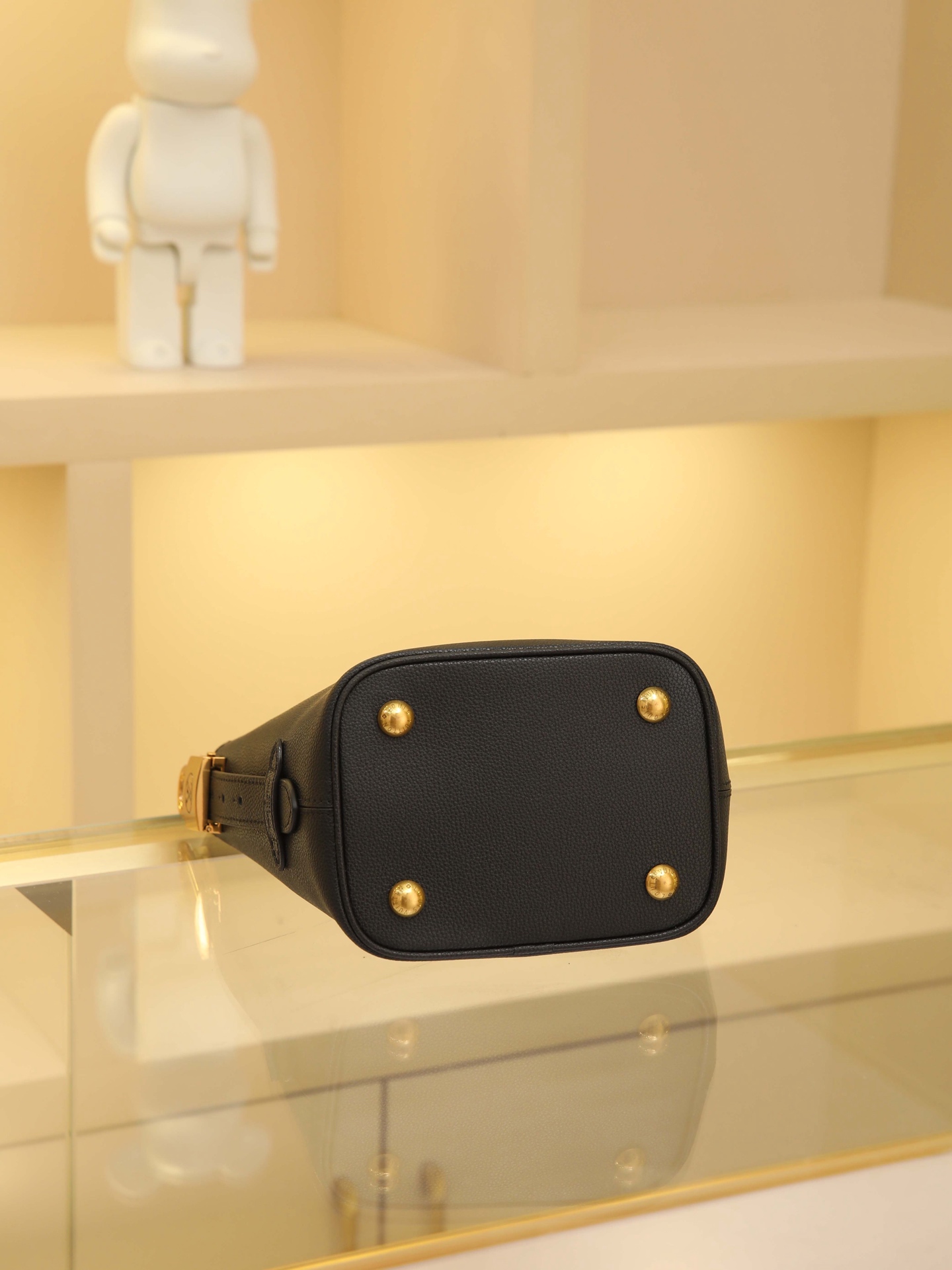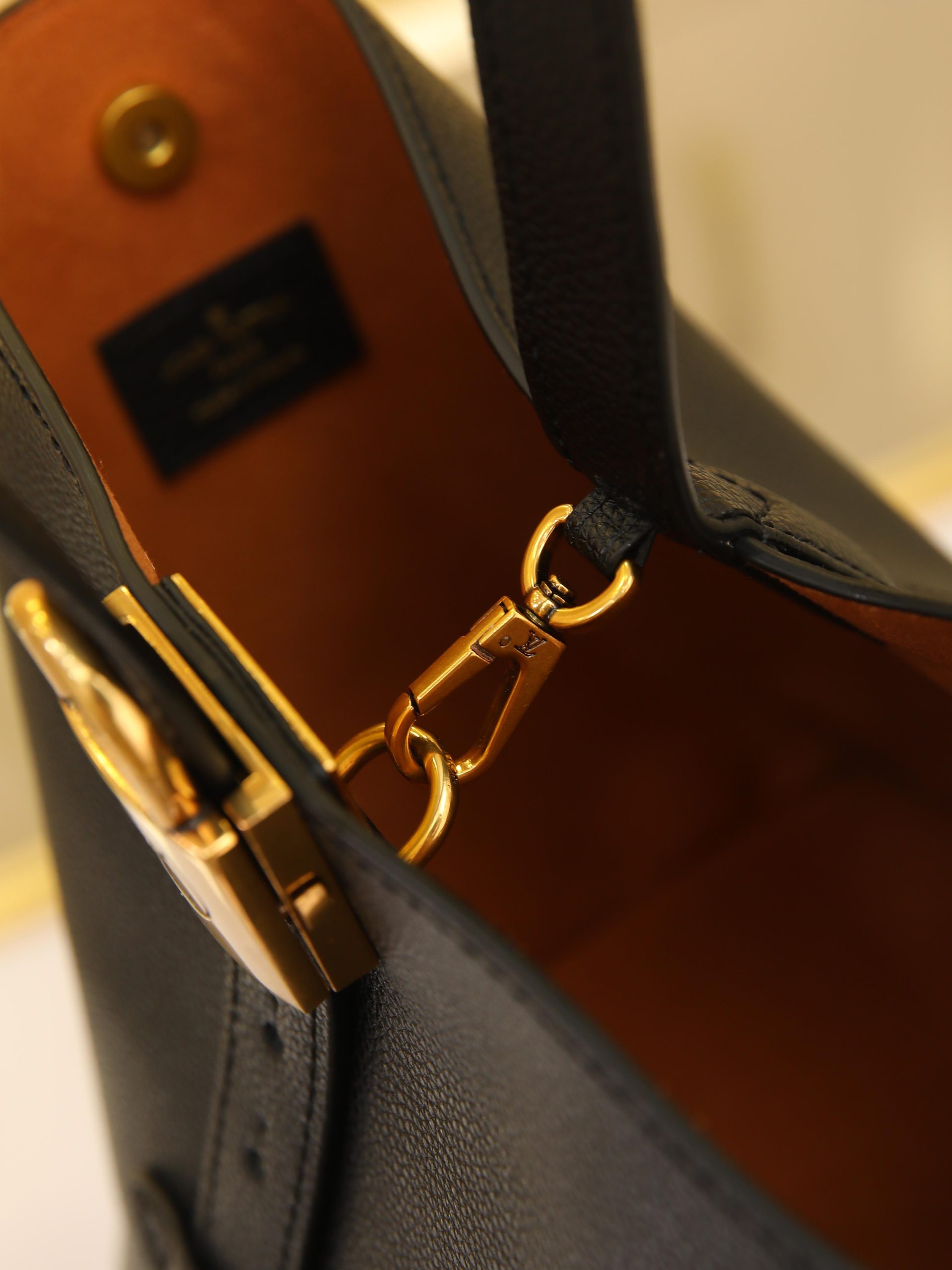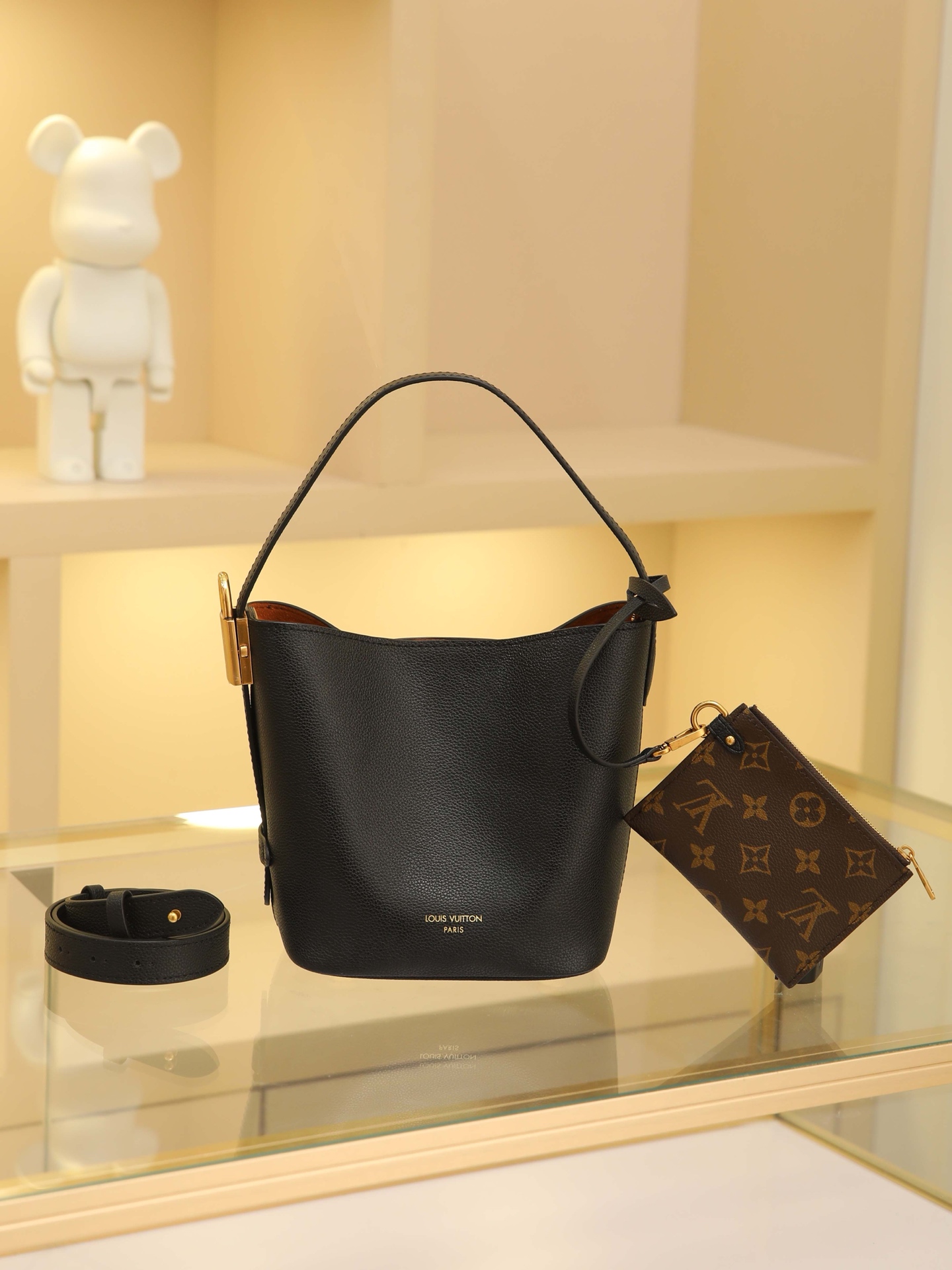 Full-Leather Bucket Bag LOW KEY ALL IN BB Handbag👝 The All In BB handbag from the Low Key collection features a compact bucket silhouette crafted from grained cowhide leather, offering versatile carrying options for day-to-night occasions. Distressed metal hardware evokes vintage charm, while the LV padlock and detachable Monogram pouch showcase signature style.Dimensions: 18 x 12 x 16 cm (Height x Width x Length)