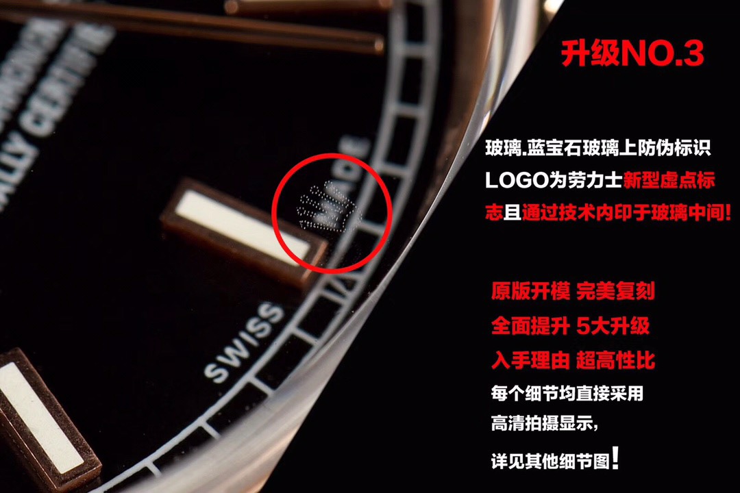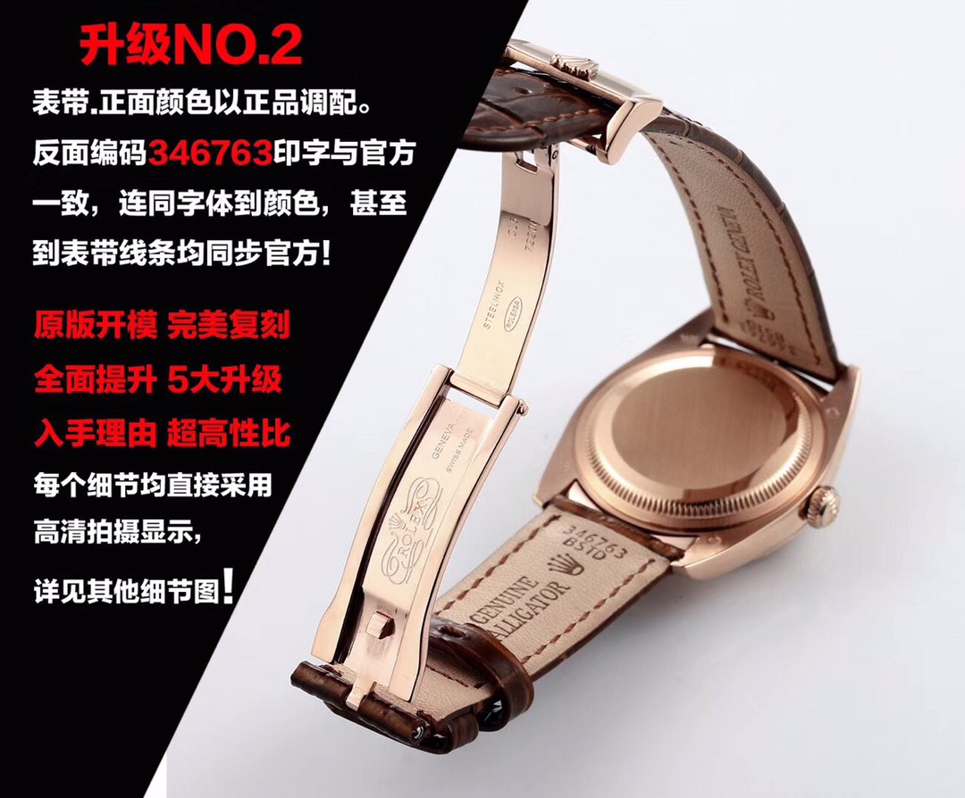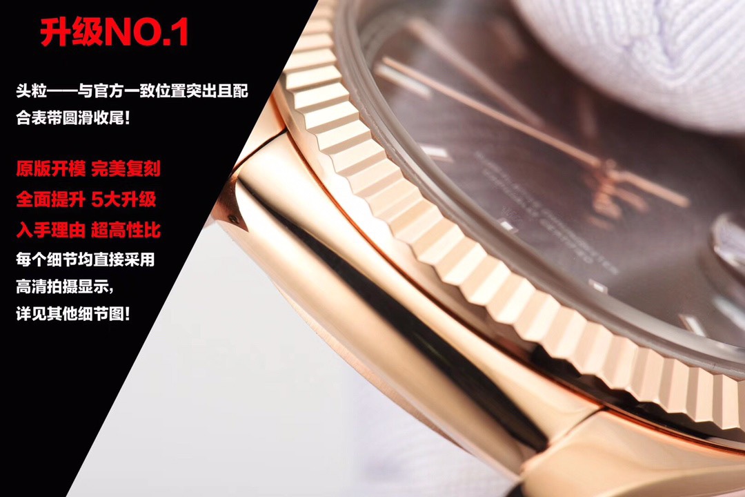 Long-awaited v3 upgrade in full color range (Classic Belt Style Day-Date) DD 36mm arrives! Exclusive custom-matched Day-Date dial [v7 Edition]—Rolex’s most iconic series, unrivaled by any other than DD! Rolex Day-Date series 118135/118138/118139 [Full 8-Color Range]! To maintain official dimensions and thickness, we’ve equipped it with the 2836-2 automatic mechanical movement, housed in a brand-new 904L steel case![Upgrade 1] Crown: Positioned identically to the official model with a prominent design and a smooth, tapered finish matching the bracelet. [Upgrade 2] Bracelet: Front side features authentic color matching the genuine product. The reverse side bears the official code “346763” printed with identical font, color, and bracelet line alignment. [Upgrade 3] Crystal: The anti-counterfeit logo on the sapphire crystal uses Rolex’s new dotted emblem, internally printed at the crystal’s center using advanced technology.[Upgrade 4] Case Back: Engravings on all four lug angles match the genuine version. Special attention given to distinct engravings for white, yellow, and rose gold cases! Both sandblasted and polished sections on the case back are meticulously replicated! [Upgrade 5] Case Profile: Curvature and overall thickness proportionally match the official design. Crown features the official two-degree waterproof symbol, with a QR code affixed to the side—exactly like the genuine version!The iconic “Gold Rolex” is the Day-Date, commonly abbreviated as DD. Its official full name is the Oyster Perpetual Day-Date. The earliest DD model likely originated from the President series, as U.S. presidents famously favored wearing Rolex’s solid gold DD watches, propelling its fame—hence its nickname, the “President’s Watch.”Four simple words encapsulate this timepiece’s defining features: water-resistant, automatic, date, and day. Limited stock available—act fast!