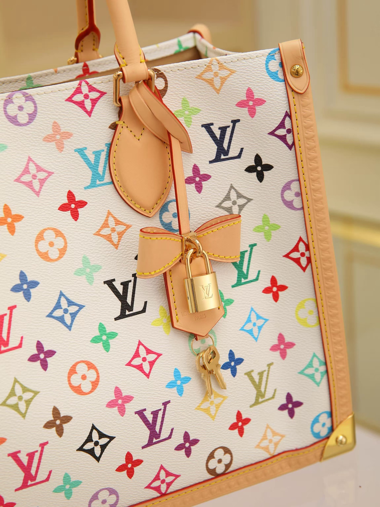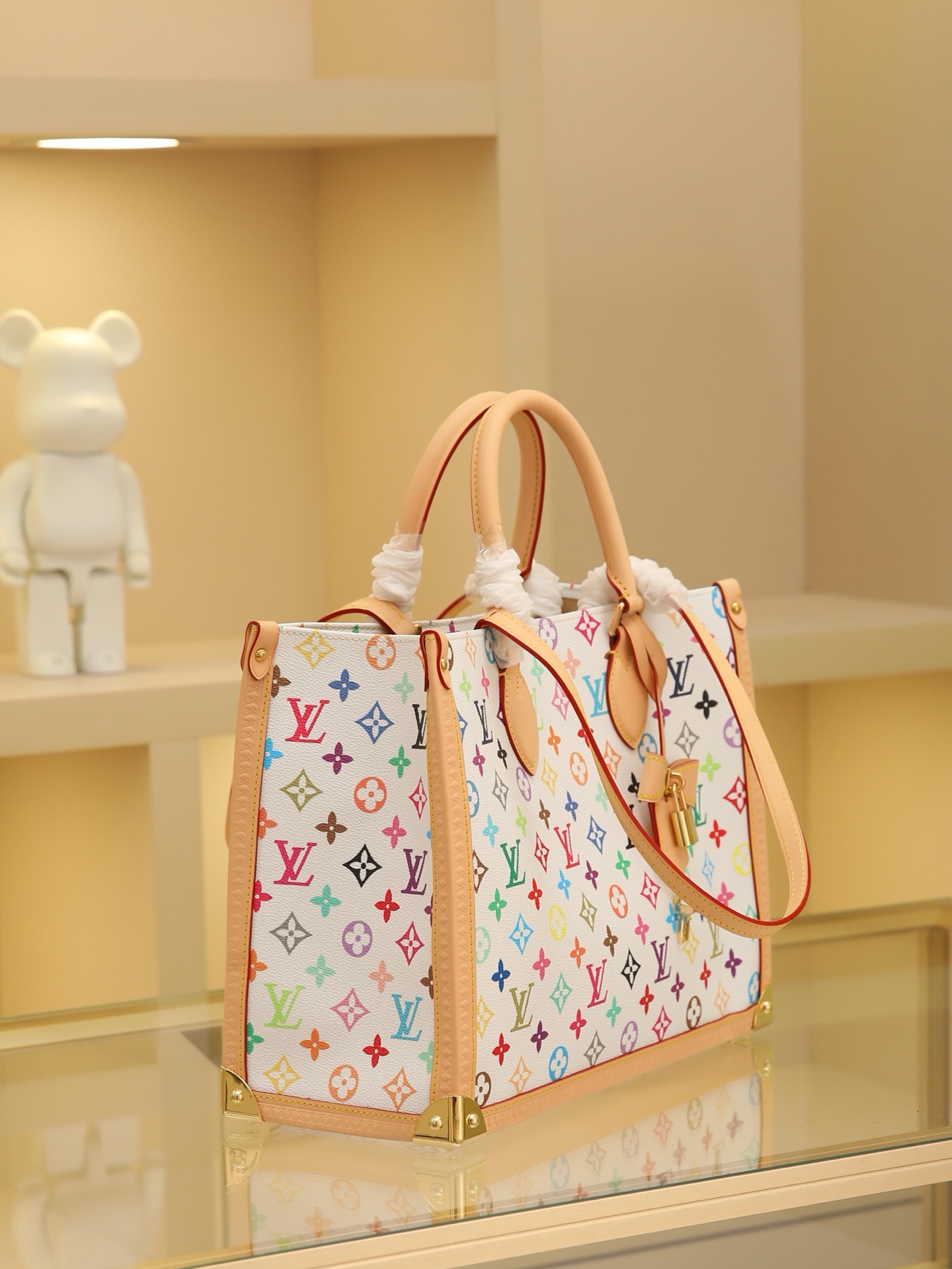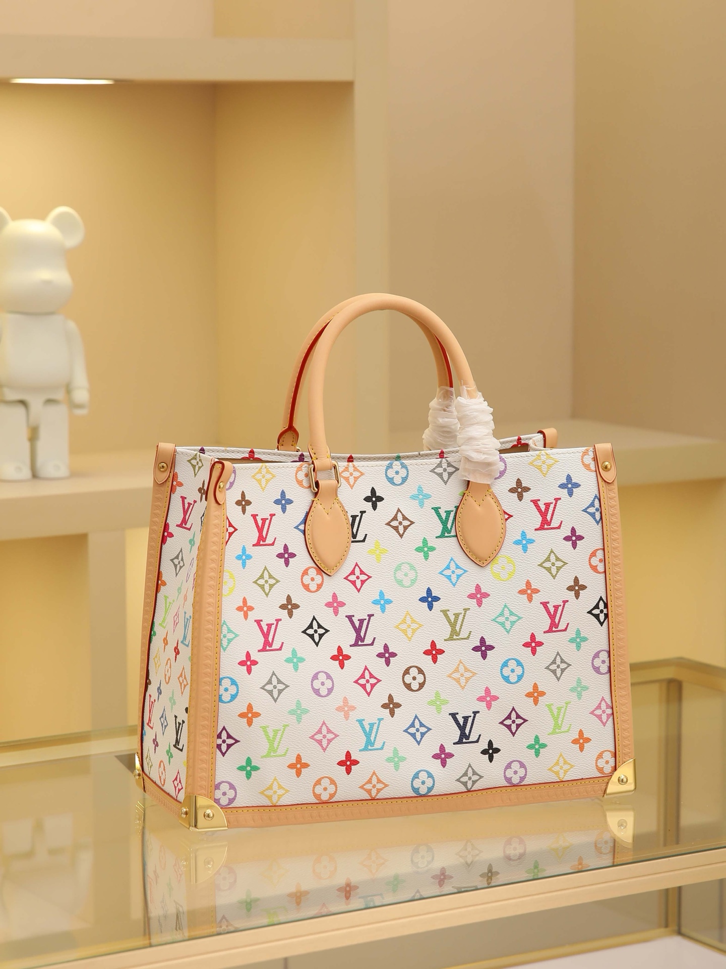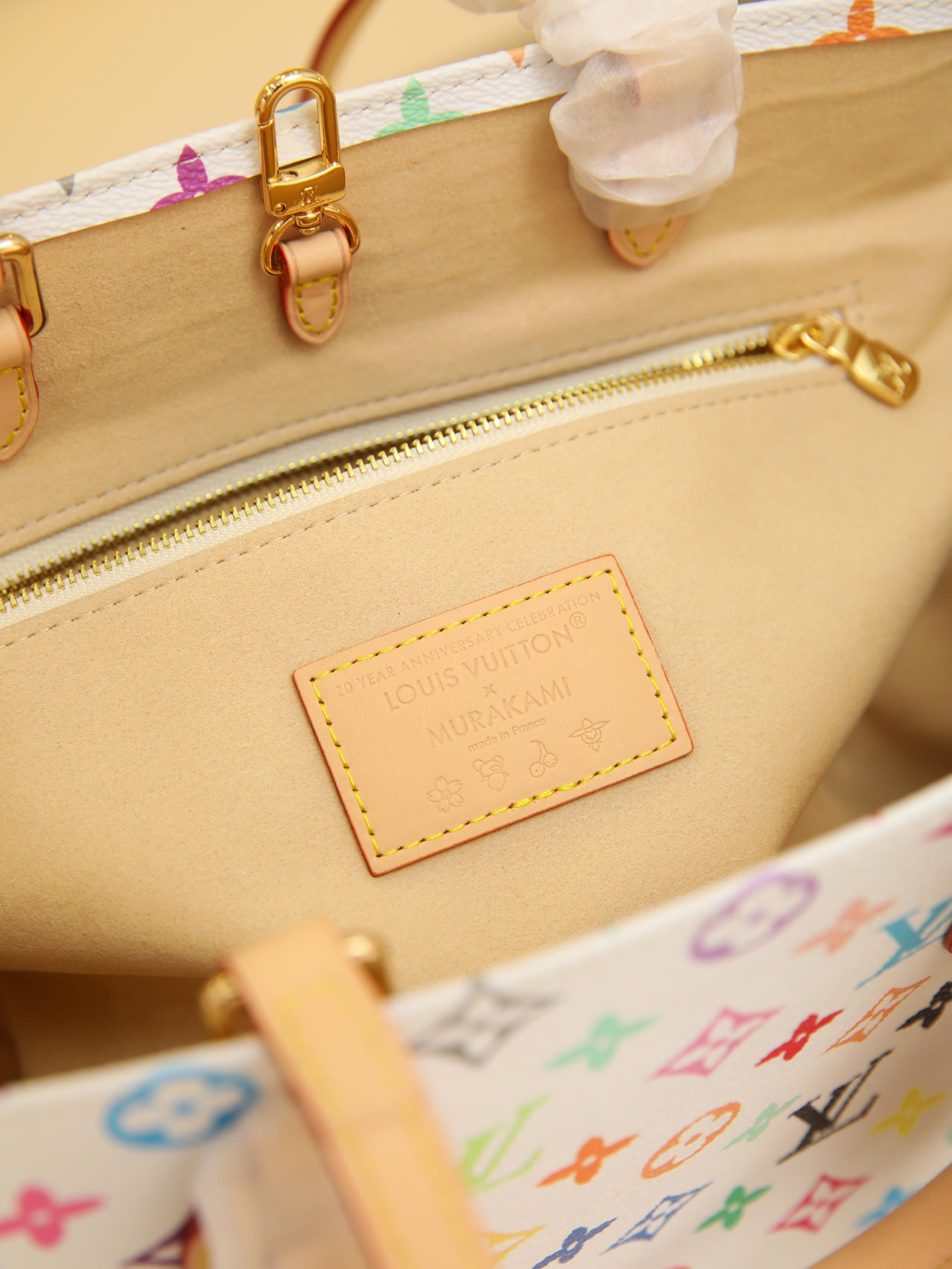 Louis Vuitton x Takashi Murakami Re-Edition Collection reimagines the OnTheGo Medium bag with dynamic brushstrokes. The vibrant Monogram canvas body, calf leather trim, and LV x TM key case showcase refined elegance, while polished corner pieces evoke Louis Vuitton's heritage trunk design. The shoulder strap and top handle offer versatile carrying options.27 x 14 x 35 cm (Height x Width x Length)