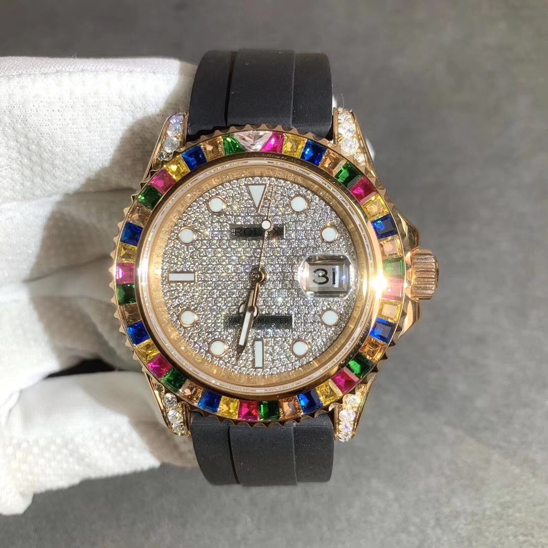 Mossanite Diamond Watch in Stock 18K Rose Gold Case Yacht-Style Upgrade 2836 Movement Sapphire Crystal 41mm Diameter Bezel Set with Cultured Colored Gemstones Mossanite Diamond-Set Middle Case