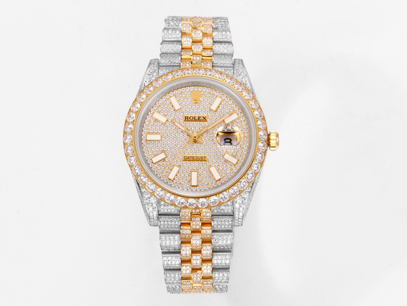 【Case】41mm diameter matching genuine dimensions, crafted from premium 904L stainless steel. Densely set with top-tier Swarovski crystals. An ultimate expression of luxury, dazzling and captivating.