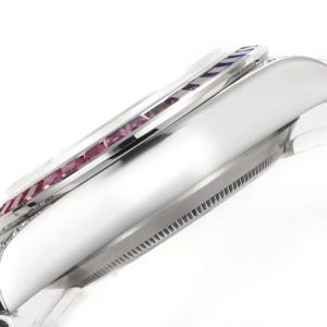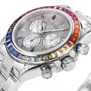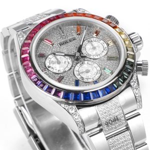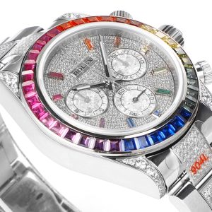 MS Factory Soars Above the Rainbow Peak—Rolex Rainbow Bezel Daytona Platinum Eye Cal.7750 Mechanical Chronograph,The “Second-Generation Rainbow Daytona” features a case and bracelet crafted from 316L stainless steel, meticulously CNC-machined throughout for every detail before undergoing manual finishing. Polishing and quality control ensure exquisite workmanship. The bezel angles, gemstone size, quantity, and color perfectly replicate the boutique’s rainbow gradient effect.The crystal employs sapphire for crystal-clear transparency. Powered by the 7750 automatic mechanical chronograph movement, it offers two strap options: a fully hand-set diamond-studded solid steel bracelet OR an imported fluoro-rubber strap. Equipped with an Oysterlock safety clasp to prevent accidental opening, it ensures comfortable wear and effortless operation!The most striking feature of this timepiece is undoubtedly the rainbow-hued gemstones on the bezel and the twelve colored diamond hour markers on the dial. Their gradient hues perfectly complement each other, radiating vibrant colors like red, orange, yellow, green, blue, and purple—adding a touch of enchanting, ever-changing brilliance. Rolex meticulously selected these exquisite, delicate gemstones and artfully combined them, bestowing the watch with a truly extraordinary radiance.