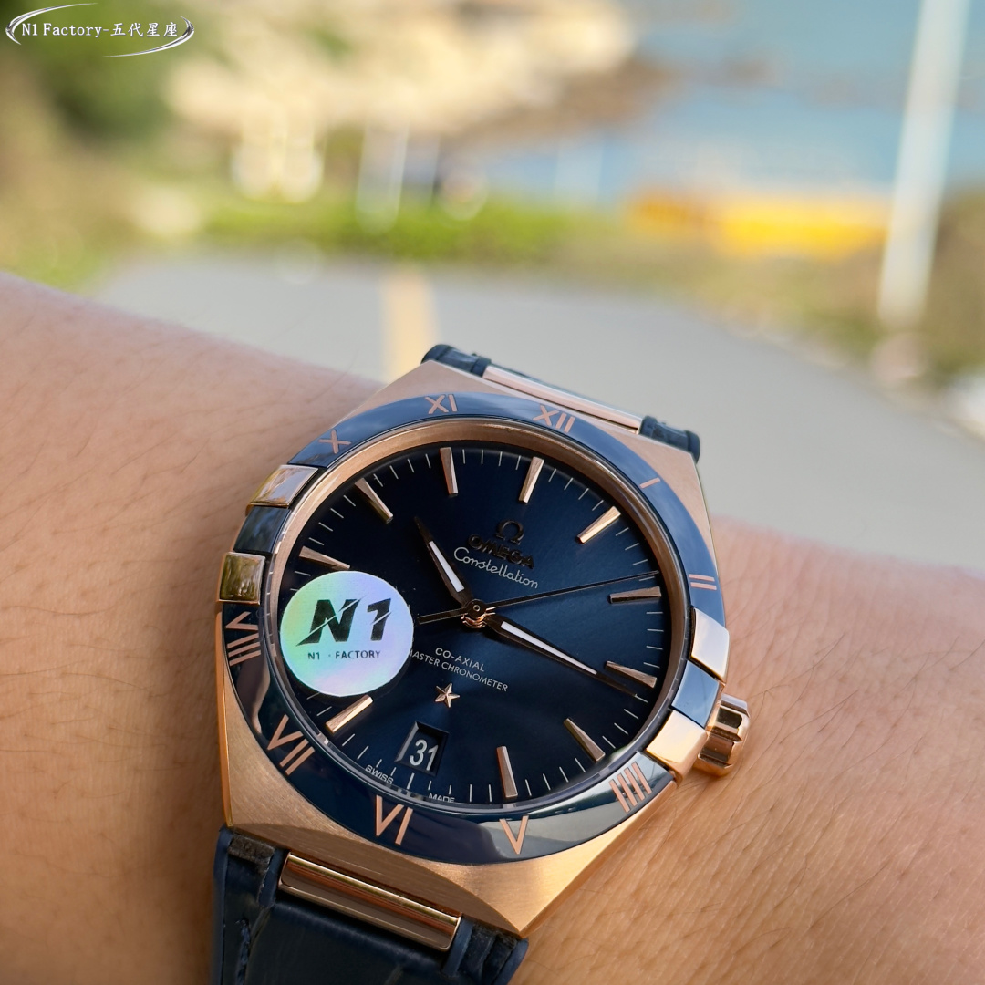 N1 Factory Masterfully Crafted Omega 41mm Master Chronometer (Fifth Generation Constellation) 131.30.41.21.99.001 Series N1 Factory pursues the pinnacle of watchmaking artistry. By acquiring authentic models for in-depth study, we integrate modern cutting-edge techniques and advanced materials to meticulously refine every detail, faithfully recreating the timeless essence of the Omega Constellation collection. Featuring an exclusive genuine 8900/8901-compatible dual-time zone quick-set calendar movement, the original 6-position balance wheel undergoes meticulous finishing. This ensures not only stable and reliable performance but also showcases the exquisite artistry of mechanical watchmaking. The case employs the latest CNC technology, achieving precise dimensions and delicate textures. The front and rear sapphire crystals complement each other beautifully, presenting a perfect fusion of quality and aesthetics from every angle.The dial hands employ advanced PVD coloring techniques. The mysterious multicolored meteorite dial harmoniously complements the classic dial face. Paired with either a multicolored titanium bezel or a ceramic bezel, it embodies both fashion and timeless elegance, radiating irresistible charm.The butterfly folding clasp with quick-adjust functionality mirrors the original design, offering excellent weight and tactile feel for an unparalleled wearing experience. N1 Factory presents the most comprehensive and highest-grade version of the classic 41mm fifth-generation Constellation, paying homage to tradition while continuing the legend.