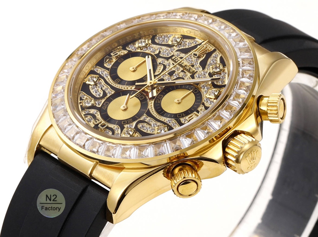 Case diameter: 40mm. Movement: Caliber 7750 (can be fitted with Caliber 4130). Functions: Chronograph, anti-magnetic. White Gold Tiger’s Eye Yellow Gold Tiger’s Eye T-shaped Diamond Meteorite Dial T-shaped Diamond Bezel with Mother-of-Pearl Diamond Dial Features: Caliber 7750 movement, size: 40mm.The little-known Tiger Tiger Star, all-gold with a tiger-stripe dial later upgraded to full diamonds. This 2019 Baselworld debut features 36 T-square diamonds on the bezel, with meticulously selected diamond accents on the dial and hour markers. As an official custom edition, its opulence is undeniable.Tiger-patterned dial Daytona, resembling the stripes on a tiger’s coat. The black and gold combination accentuates its masculine vigor.