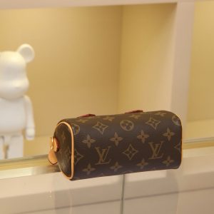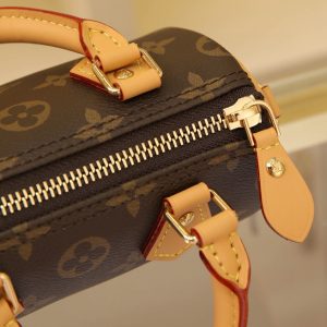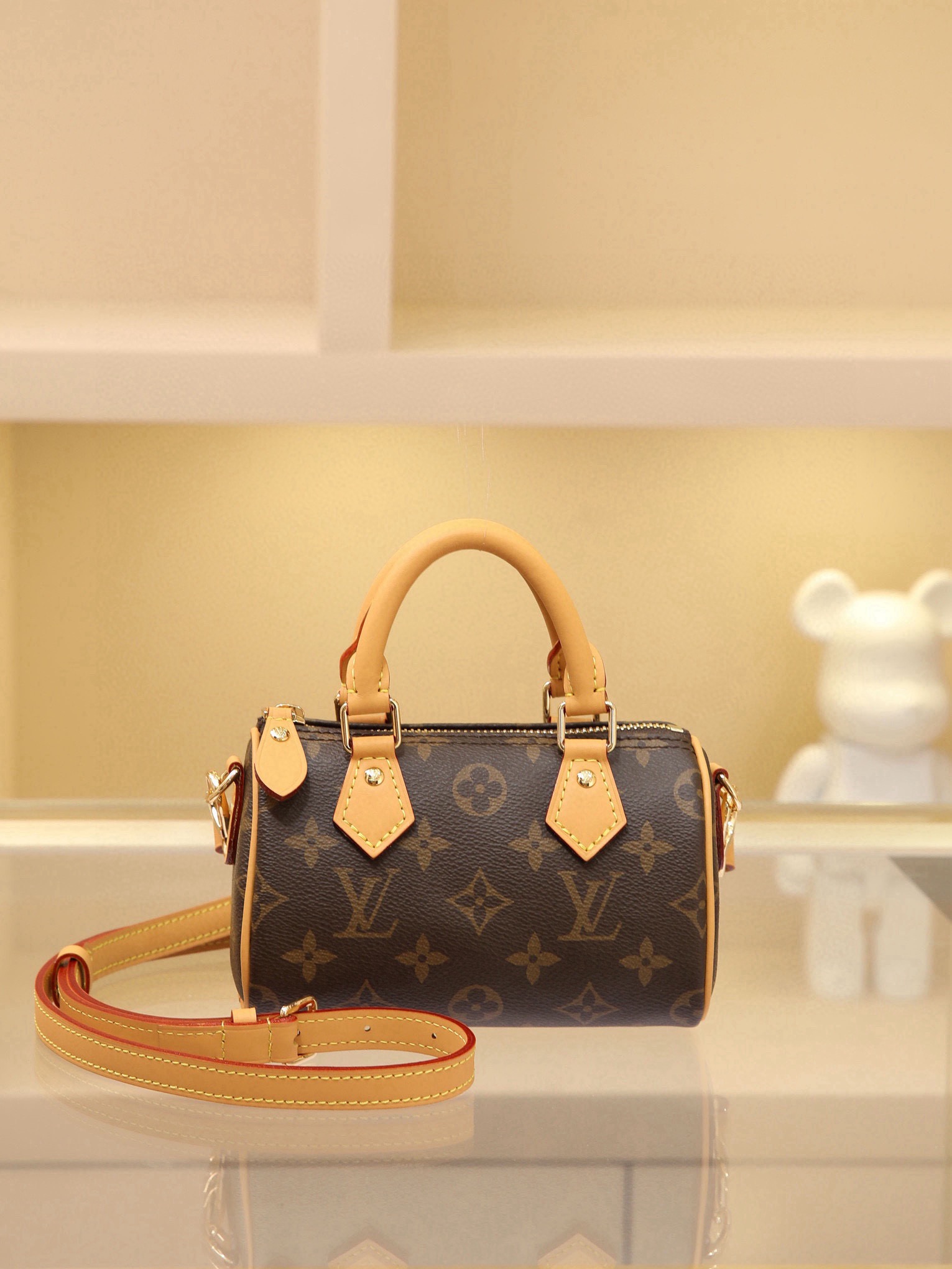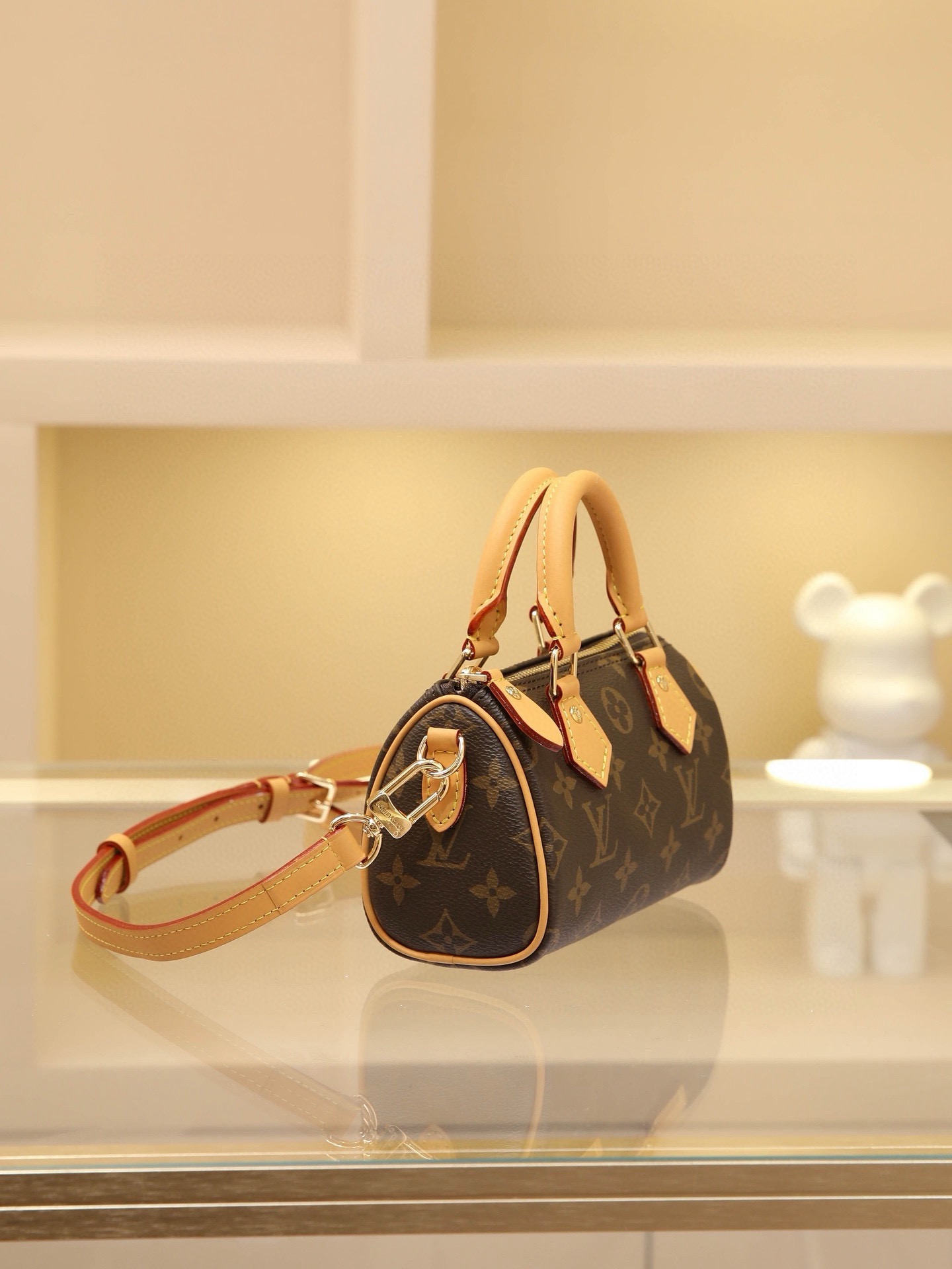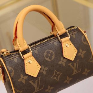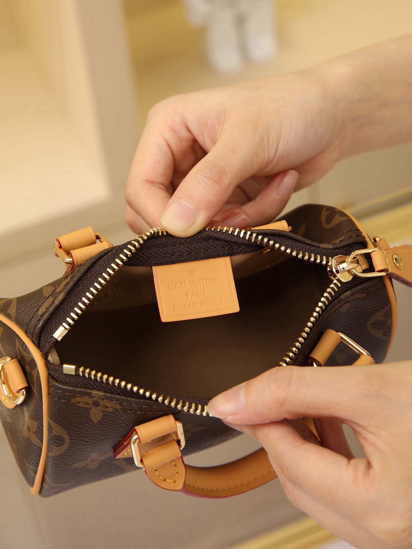 New Edition NANO SPEEDY Handbag Vintage Print This handbag is the perfect mini version of the original Speedy design, featuring exquisite stitching and unparalleled lightness. More versatile than the previous edition, it boasts an adjustable and detachable shoulder strap. Dimensions: 16x11x9cm.