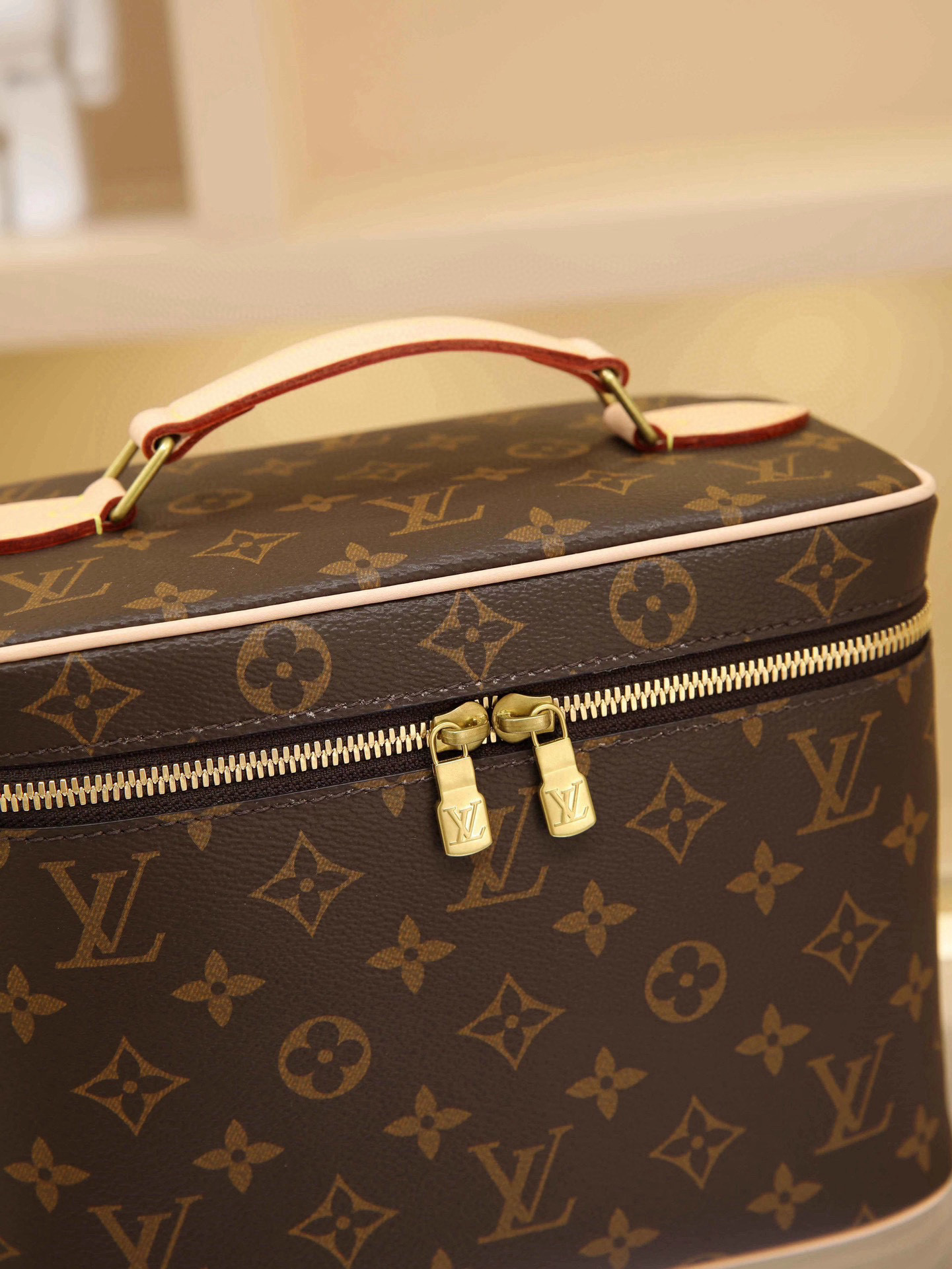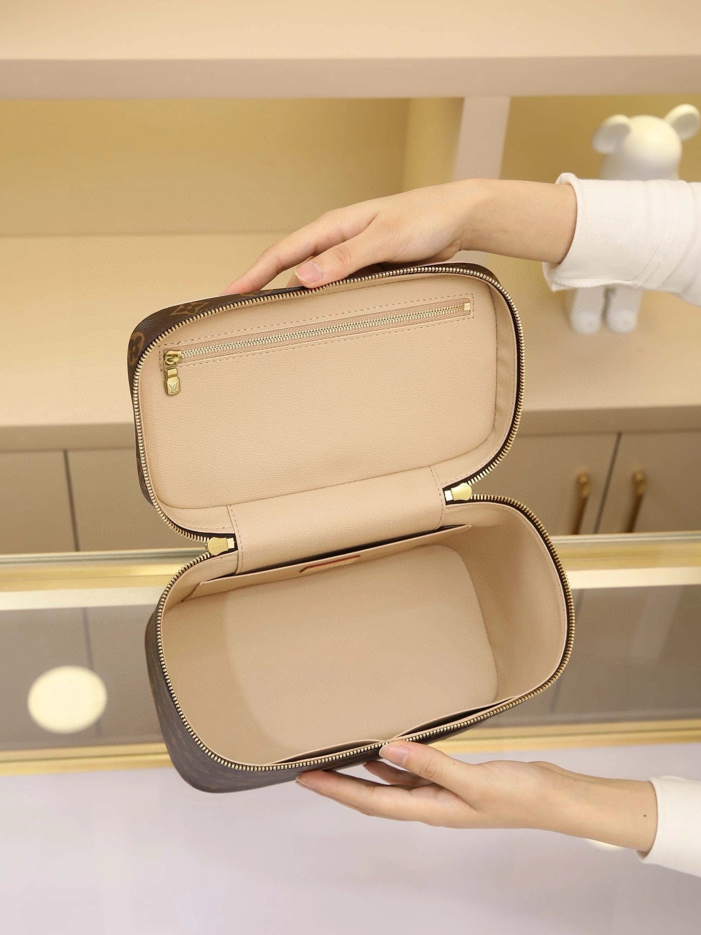 NICE BB Cosmetic Bag M42265 Drawing inspiration from the iconic Nice cosmetic bag, this elegant toiletry case offers a distinctive choice for carrying essential beauty products. A concealed zippered pocket inside the flap provides secure storage for particularly valuable personal items.- Top woven handle – Monogram coated canvas exterior – Specially coated canvas washable lining – Natural cowhide leather trim – Gold-tone metal hardware – Double zipper closure – Generous interior capacity – Zippered pocket inside flap – Multiple interior slip pockets – Size: 24*14*17 cm