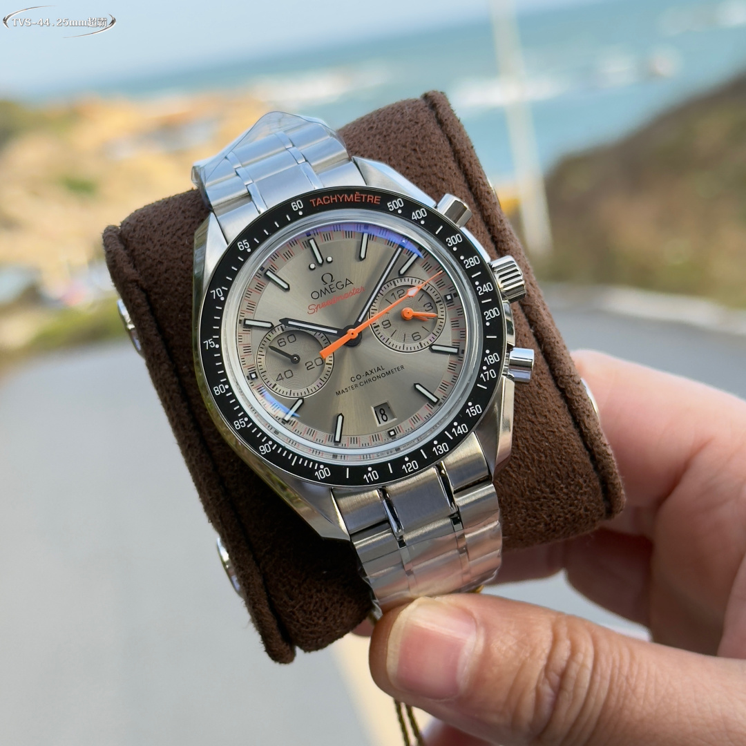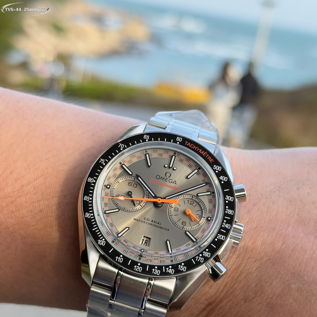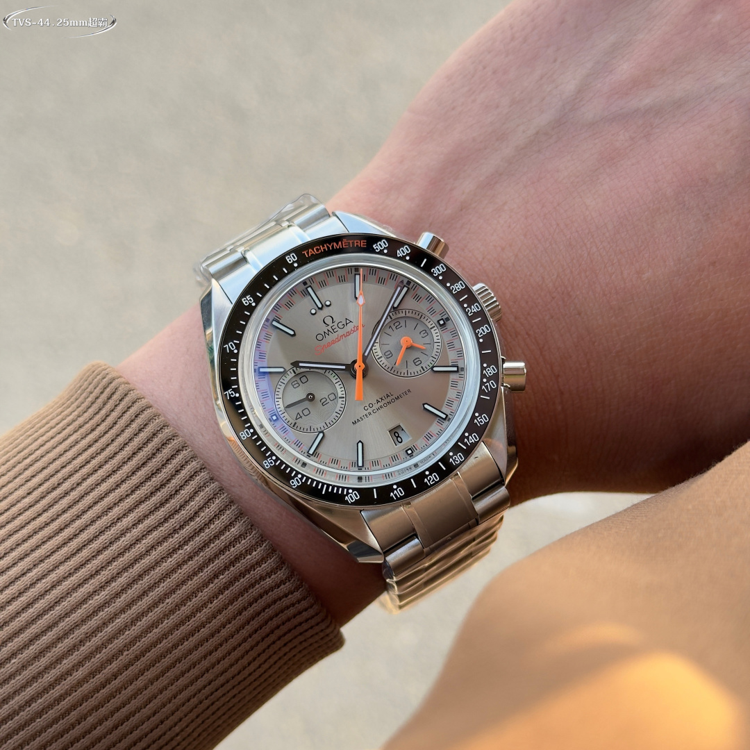 ![Omega Speedmaster Racing Chronograph 44.25mm Master Chronometer Model: 329.32.44.51.01.001 In 1957, Omega launched the Speedmaster series, specifically designed for motorsports.This design is also known as the "Racing Dial"—a matte black panda dial. The orange and white lacquered hands, along with the white 18K gold arrow-shaped hour markers, are coated with white Super-LumiNova luminescent material. One end is accented with an orange emblem.Case diameter: 44.25mm. Powered by the TVS-developed 9900-type Master Chronometer Dual-T movement. The 3 o'clock position houses the [12-hour] and [60-minute] cumulative chronograph counters.All functions and aesthetics remain faithful to the original. A masterpiece of TVS craftsmanship. Vibration frequency: 28,800 vibrations per hour Power reserve: 60 hours Stainless steel case and bracelet. Double-sided anti-reflective, scratch-resistant curved glass. Pure racing style. One glance captivates, transporting you to the racetrack to experience the thrill of speed. - Image 6](https://maivaro.com/wp-content/uploads/Watches/Men's%20Watch/Omega/_dkafwwvw40uyjufzxrqpz7_klrrm4lkn4raamva_6.jpg)
