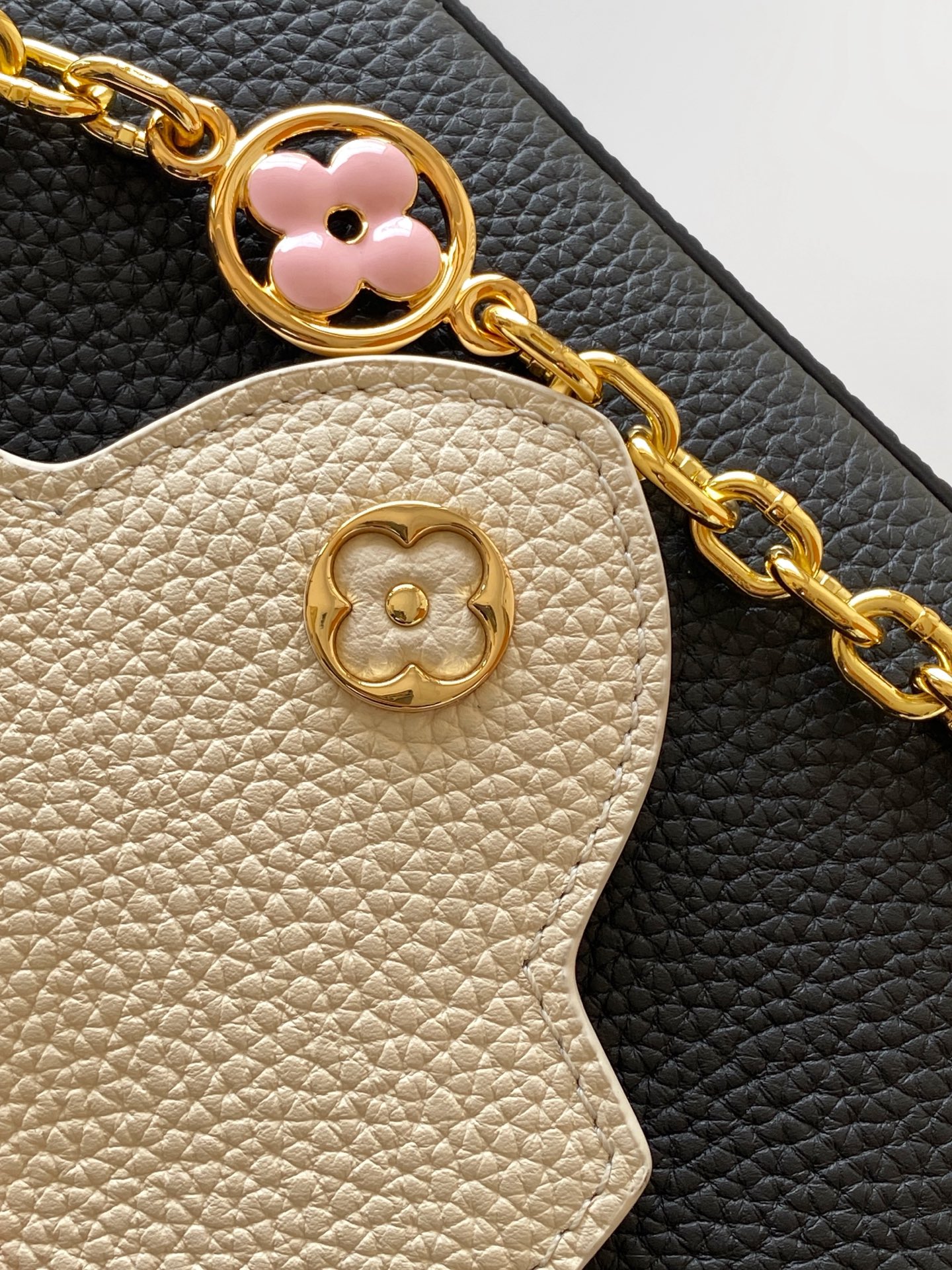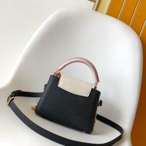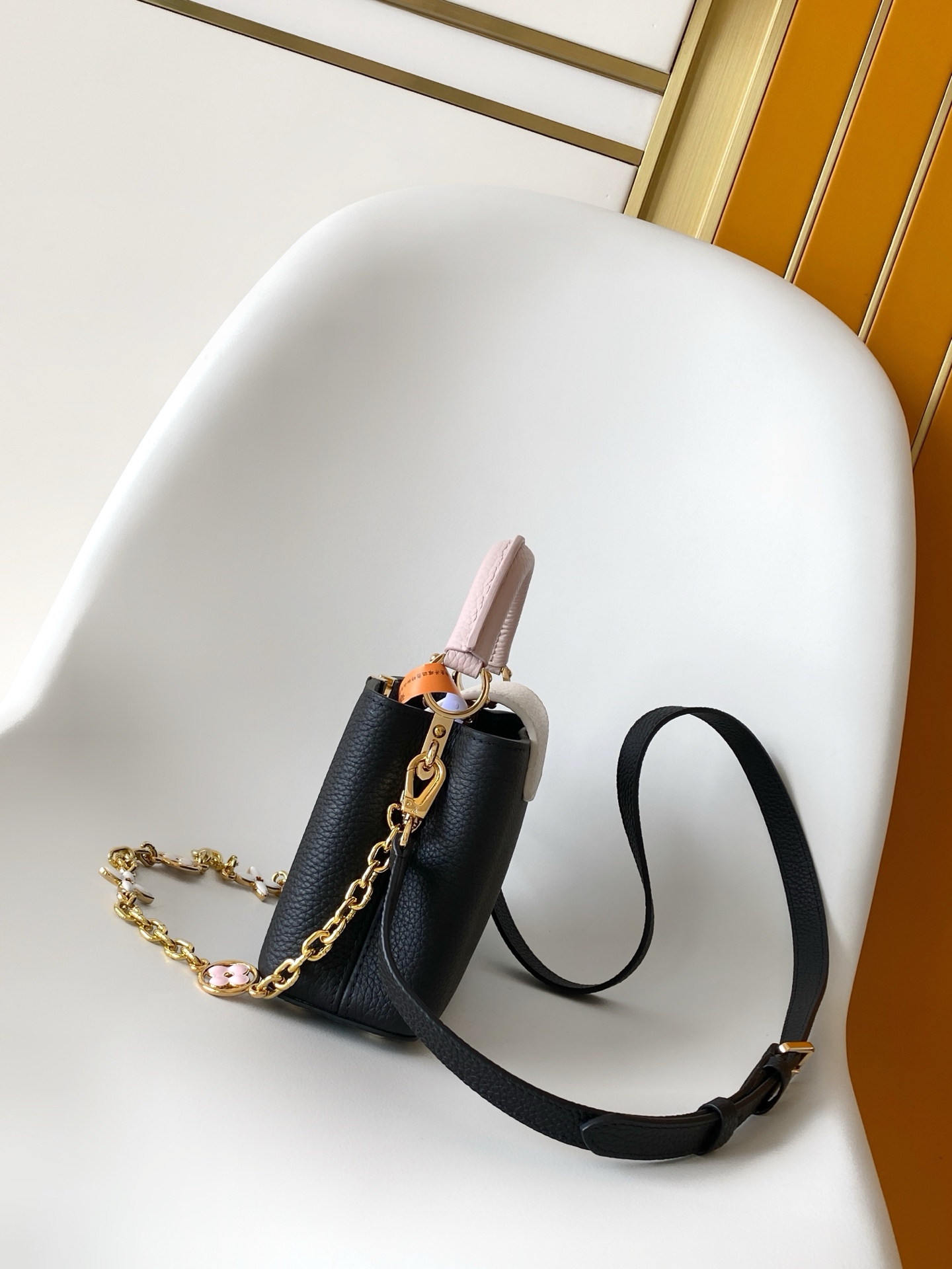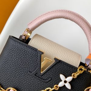 p1080M11343 Pure White with Pink M25386 Black with White M23952 White with Blue M24471 Green M22514 White with Yellow M22375 Crocus M20845 Pure White M20844 Peach Pink M22512 Black with Pink Premium Genuine Leather Dynamic Encryption Chip This Capucines Mini Bag features a Taurillon leather body with an elegant Lovelock chain, where woven chain links accentuate hand-painted enamel Monogram elements and an LV monogram padlock. A leather LV logo adds a striking touch.26.5 x 17.5 x 9.0 cm (L x H x W) 21.0 x 14.0 x 8.0 cm (L x H x W) 16.3 x 11.0 x 6.5 cm (L x H x W) • Taurillon leather • Taurillon leather trim •Cowhide lining•Metal hardware•Glazed effect•Flap can be positioned inside or outside•Interior compartment with patch pocket•Metal studs•Shoulder strap: Detachable, adjustable•Strap length: 55.0 cm•Adjustable to: 59.0 cm•Chain: Detachable•Chain length: 31.0 cm • Handle: Single handle