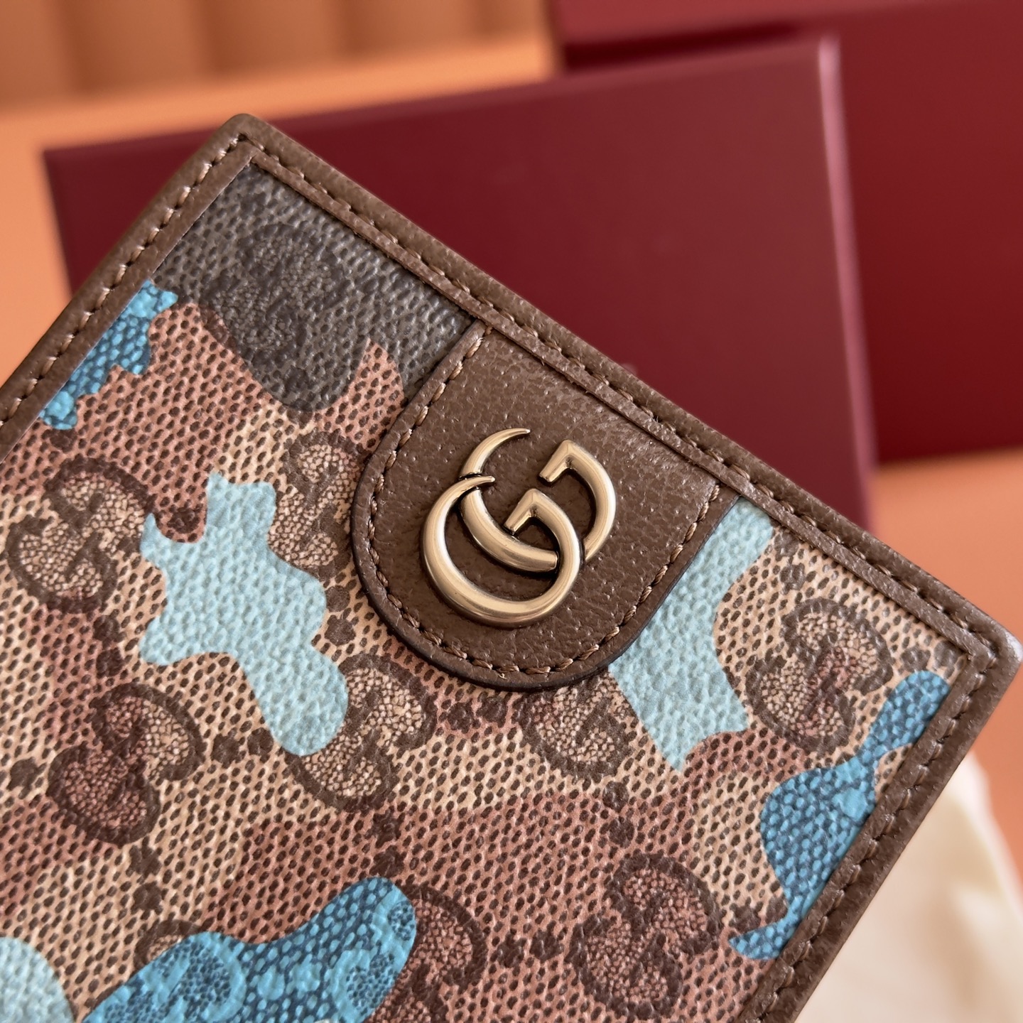 p330. 💋💋💋【Complete with original boutique packaging】Vibrant camouflage meets distinctive colorways, reimagining the iconic GG motif. Crafted from marble-effect GG monogram coated fabric, this bifold wallet showcases meticulous double G detailing.