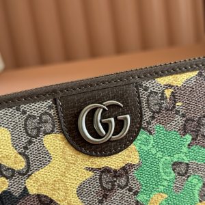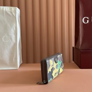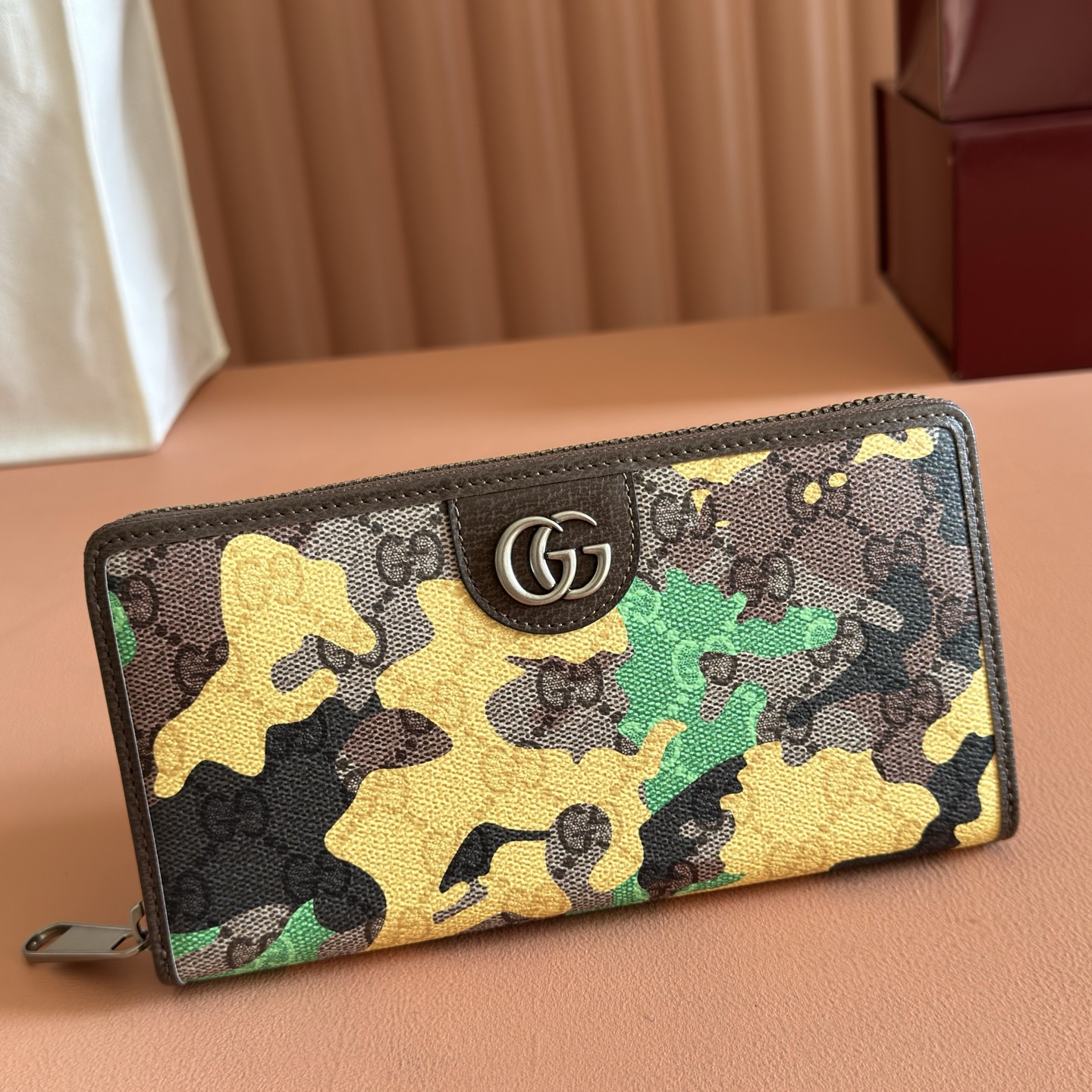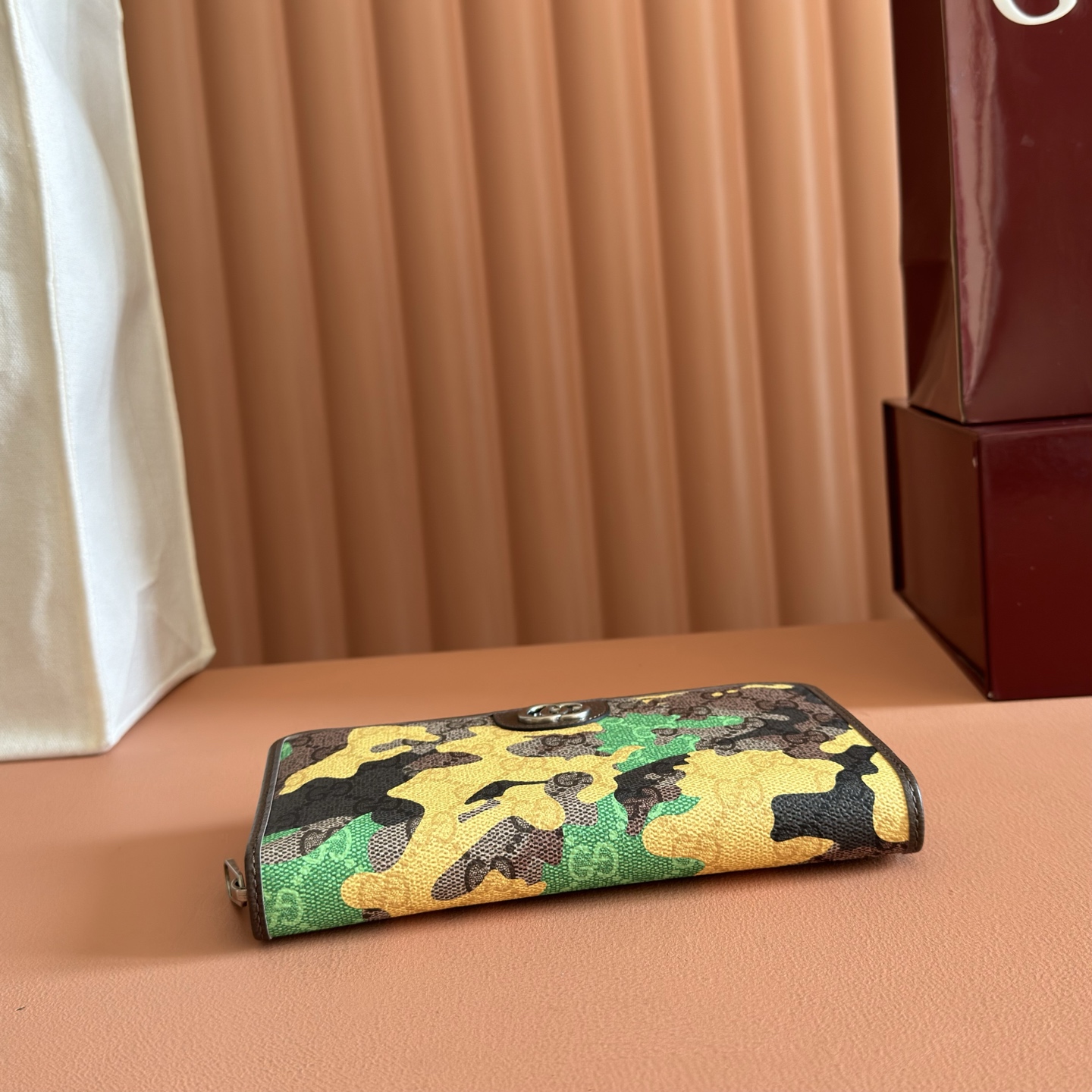p390. 💋💋💋【Complete with original boutique packaging】Vibrant camouflage meets distinctive colorways, reimagining the iconic GG motif. Crafted from marble-effect GG lettering coated fabric, this full-zip wallet showcases meticulous double G detailing.