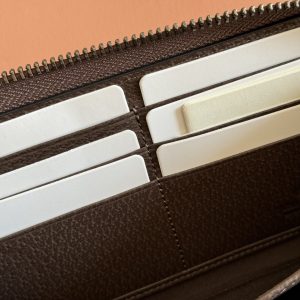 Interior: 12 card slots, 3 bill compartments, 1 zippered coin pocket
