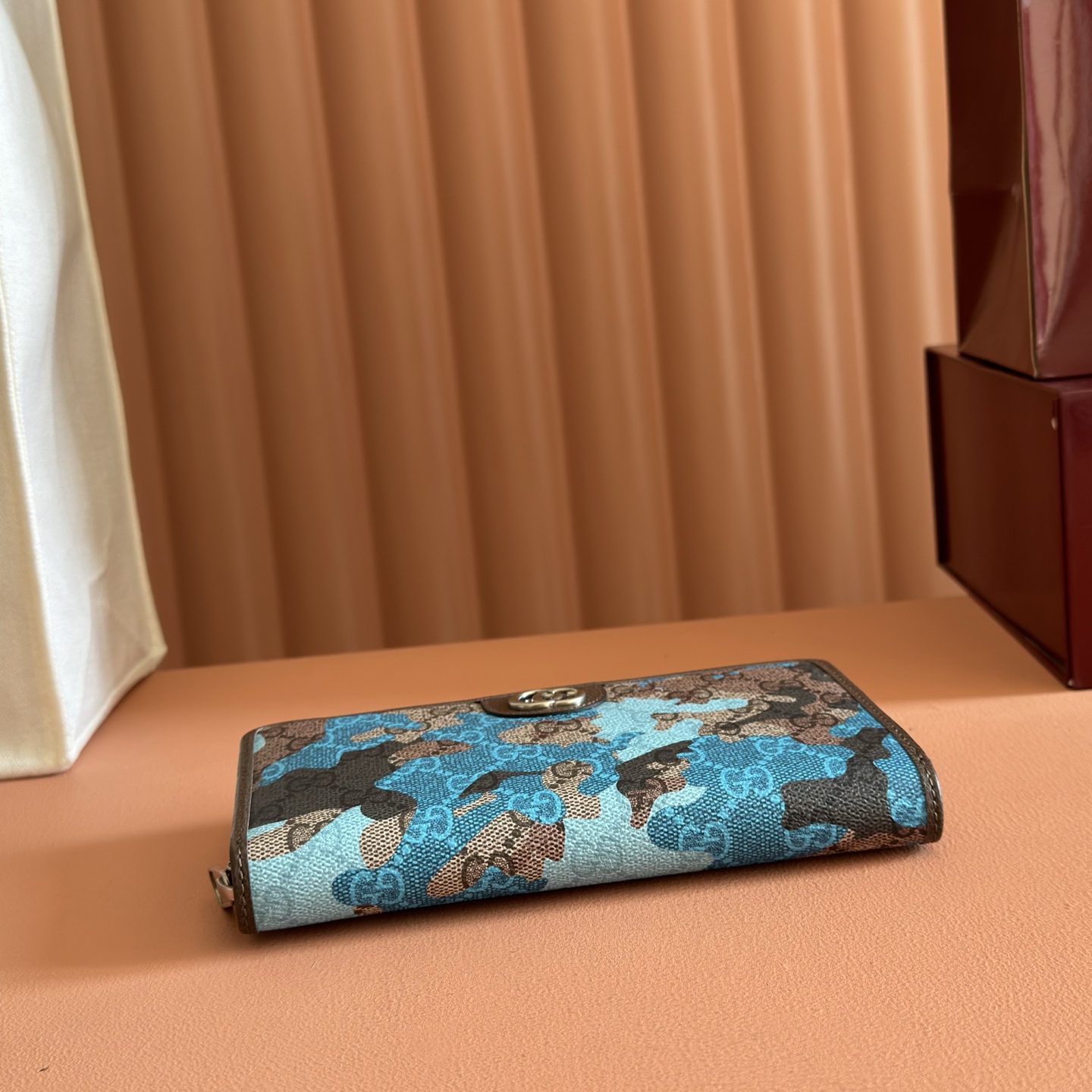 p390. 💋💋💋【Complete with original boutique packaging】Vibrant camouflage meets distinctive colorways, reimagining the iconic GG motif. Crafted from marble-effect GG-patterned coated fabric, this full-zip wallet showcases meticulous double-G detailing.Green and yellow camouflage marble GG lettering coated fabric Brown leather trim Rhodium-tone hardware Brown taffeta lining Double G webbing detail Interior: 12 card slots, 3 bill compartments, 1 zipped coin pocket Zip closure Model: 834694.Dimensions: 19 cm (W) x 10.5 cm (H) x 2.5 cm (D) Weight: Approx. 230 g Color: Blue Camouflage/PVC Made in Italy