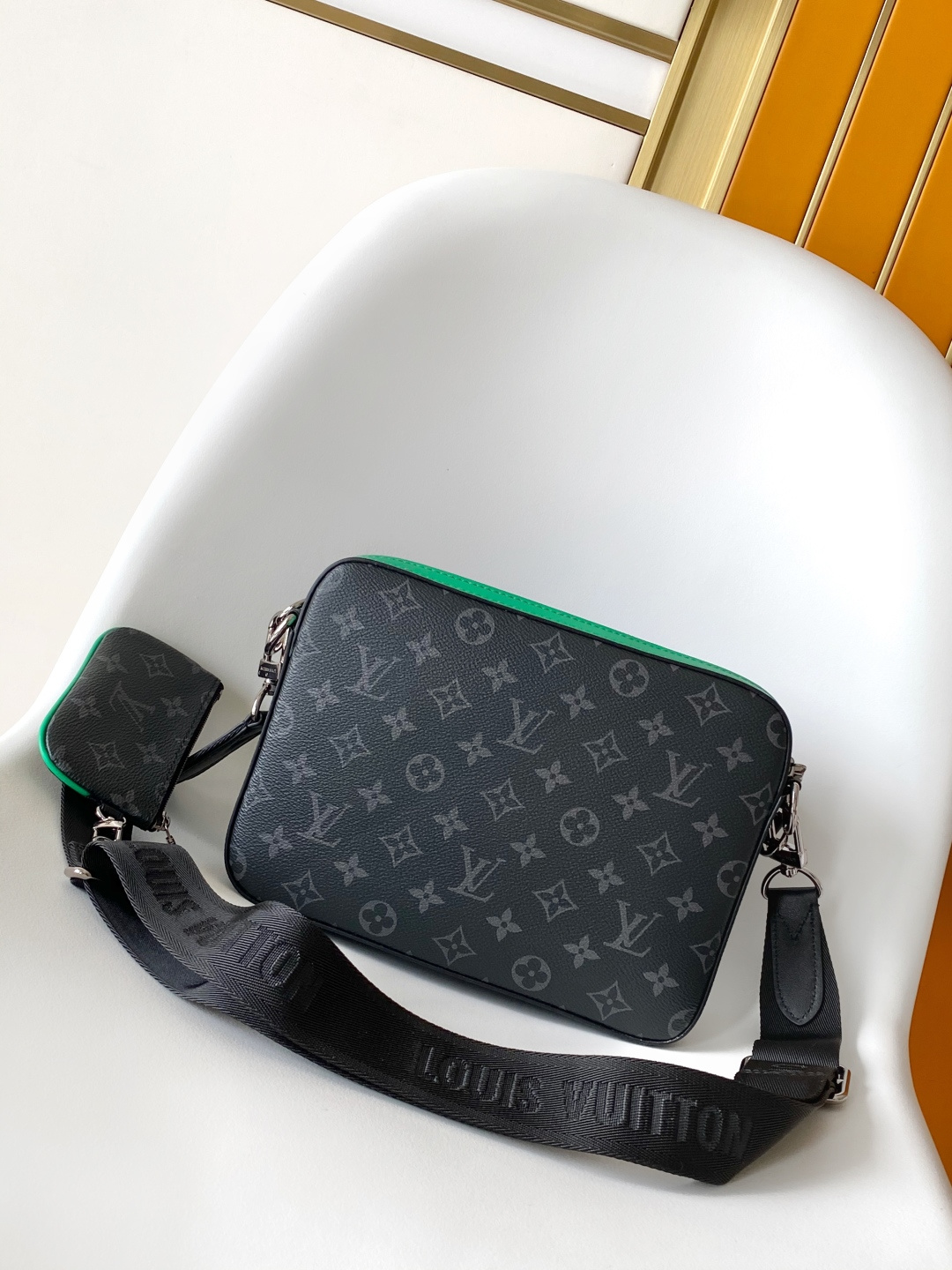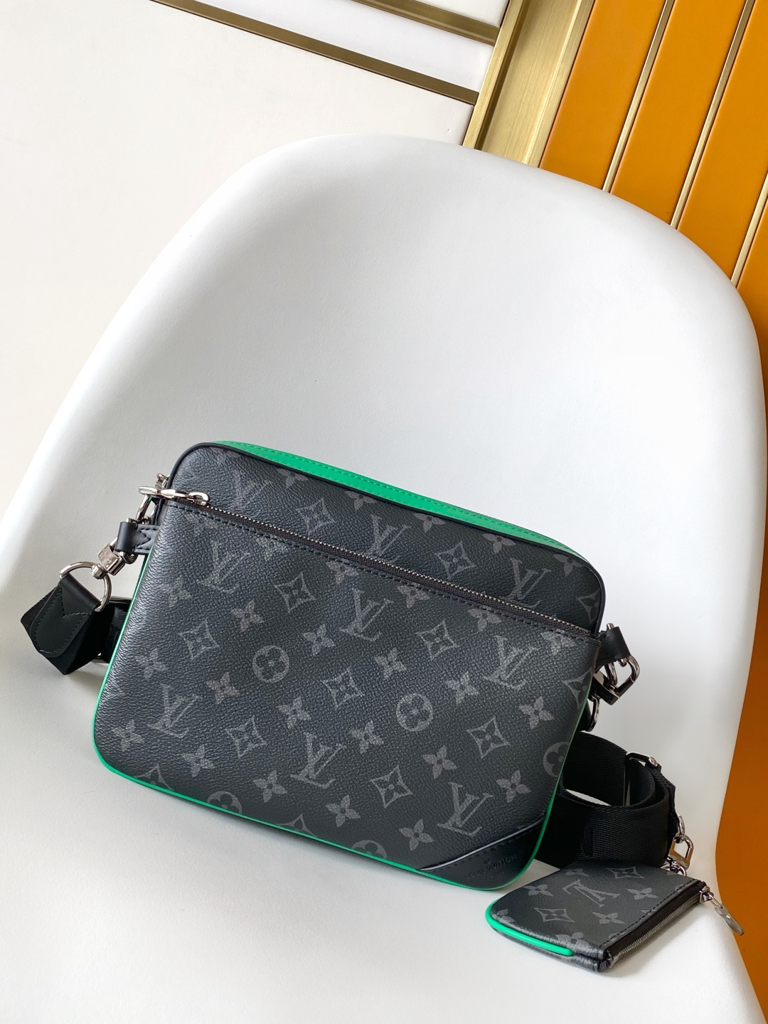 p530M26052 Black Floral Green N40438 Embossed Blue M69443 M58040 Silk-Printed M50017 Black Grid M50027 White Grid M45965 Yellow Embroidered M30848 Blue Floral M69827 Embossed Black M80401 Black Grid Leather M20665 White M46104 Embossed Silver M45730 Embossed Blue M46266 Vintage Floral Trio Messenger Bag crafted from Monogram Eclipse canvas and Monogram Eclipse Reverse canvas. The iconic tonal gray pattern accentuates the lines of this versatile patchwork design. Beyond its traditional crossbody functionality, it includes a detachable zippered pouch and a coin purse attached to the strap.Dimensions: 25.0 x 18.5 x 7.0 cm