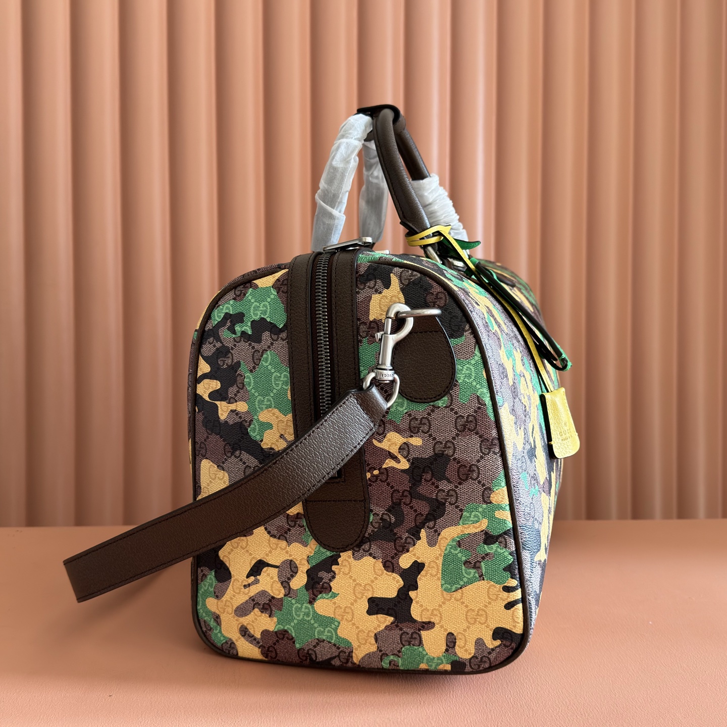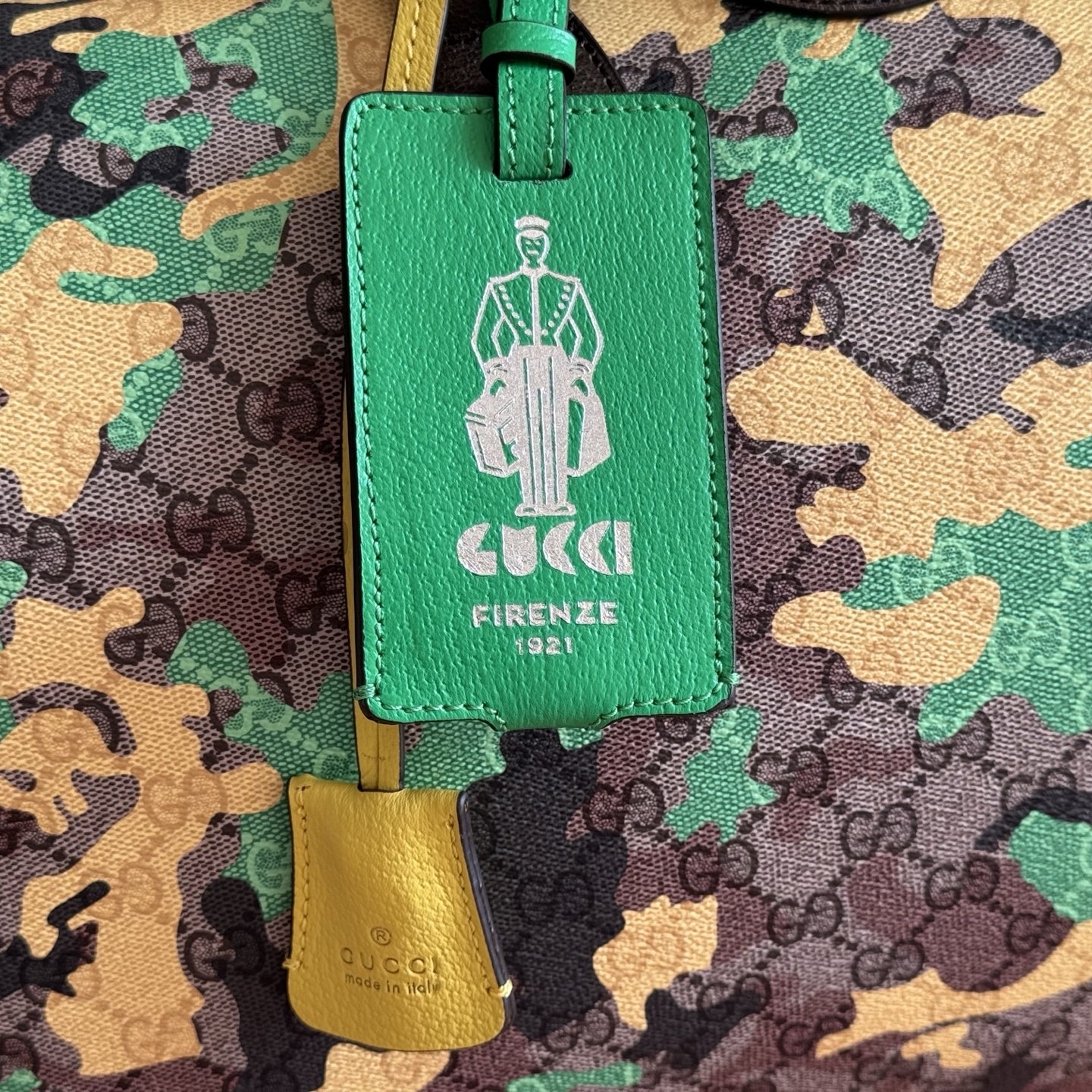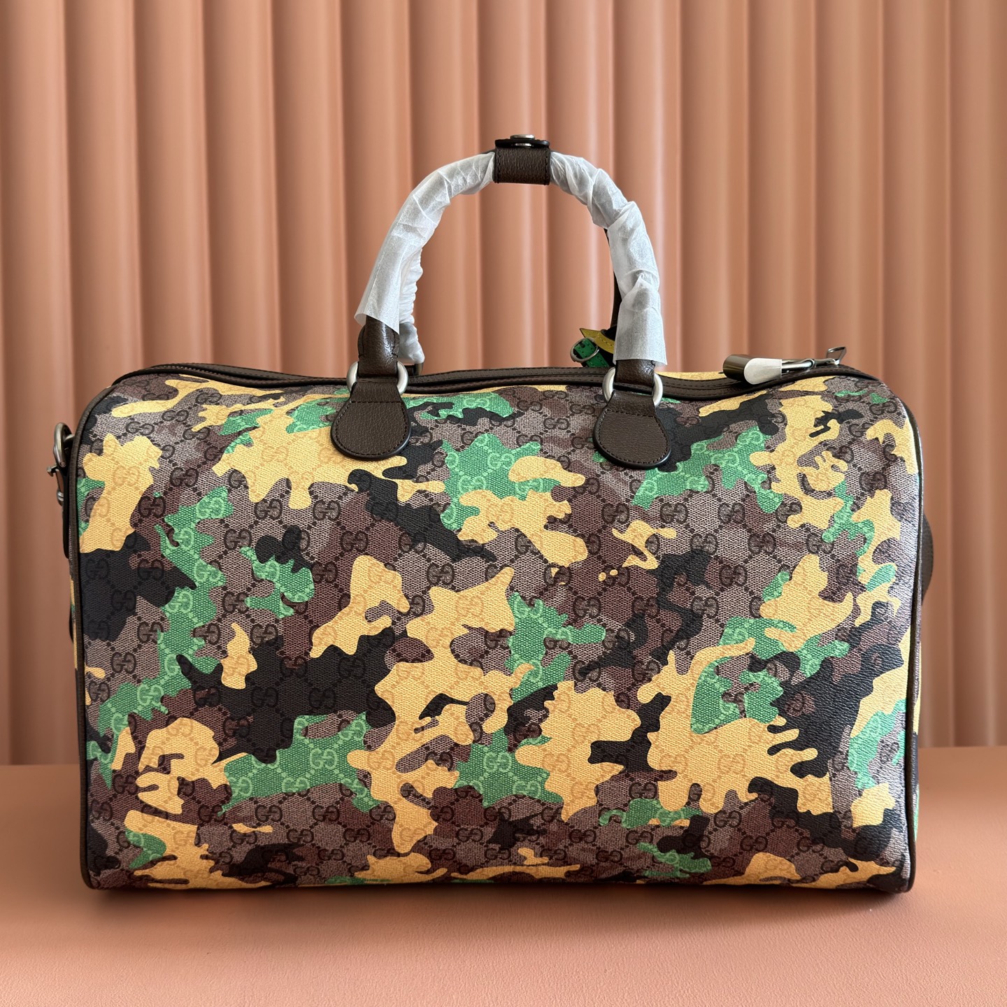 p970๐๐๐ Vivid camouflage meets distinctive color combinations, reimagining the iconic GG pattern. Crafted from marble-effect GG monogram coated fabric, this travel bag features a matching ID tag and key ring.