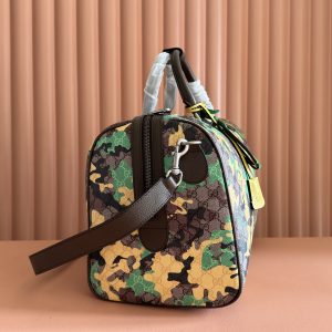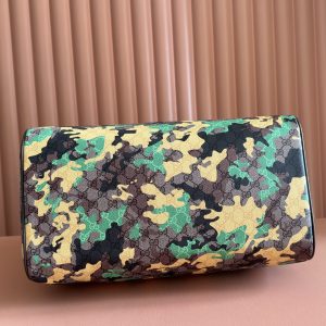 p970๐๐๐ Vivid camouflage meets distinctive color combinations, reimagining the iconic GG pattern. Crafted from marble-effect GG monogram coated fabric, this travel bag features a matching ID tag and key ring.Pink and red camouflage marble GG monogram coated fabric Brown, pink, and red leather trim Palladium-tone hardware Natural cotton-linen lining Double G Capacity: 28 liters Interior: 1 zippered pocket Exterior: 1 removable luggage tag, 1 lock, 1 key ring Handle height:12 cm. Detachable adjustable leather shoulder strap (height: 119 cm – 134 cm). Zipper closure. Model: 834460. Dimensions: 44 cm (width) x 29 cm (height) x 25 cm (depth). Weight: approx. 2.3 kg. Color: Green camouflage/PVC. Made in Italy.