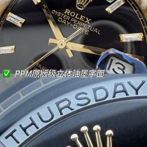 PPM Mods Details🏷️ Weighted DD – Ceiling-Level ‘Rolex DD Day-Date’ PPM’s replica DD redefines the weighted version, featuring genuine original molds for strap color, dial color, watch weight, and thickness. The strap incorporates ceramic tubes compatible with authentic models—this is not a compromised replica, but a comprehensive leap in materials and craftsmanship!Rejecting “market-grade knockoffs,” every gram of weight (precise 209g-212g) and every millimeter of thickness fights for the dignity of the original. Bracelet: Authentic 3mm thickness Weight: Approx. 107g (non-extended) 🈚 Ceramic tube version ±1-2g.Case: Original thickness: 12.3mm (non-thickened) Weight: Original 3255: 102g; Optional 2836: ±1g. Full series total weight: 209g-212g. ⚠️”Excludes diamond-set models.” Authentic thickness achieved through monolithic forging of high-density aerospace-grade military alloy, hardness rivaling 18K gold!Exclusive vacuum ion-plated gold technology delivers a luster infinitely close to 18K gold’s signature warm texture, offering scratch resistance and durability. Precisely replicates every link’s shape, thickness, and curvature of the genuine strap. Dial: Features original 3D ink, matching the top-tier dial craftsmanship of the factory. Sharp hands, full hour markers, and uniform luminescence.Movement options: Premium Edition 2836 or 3255 integrated movement (±72-hour power reserve) available for your selection!